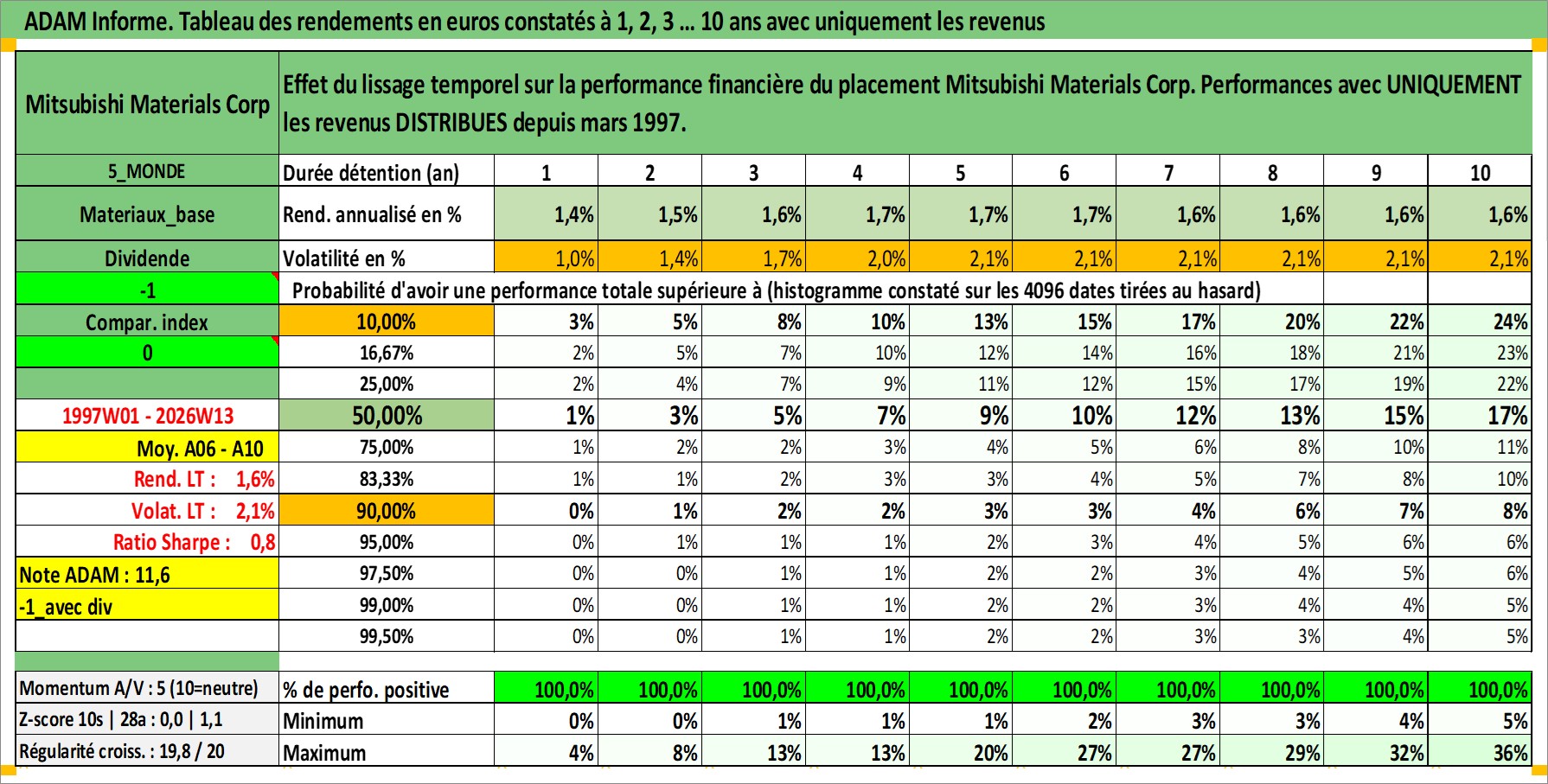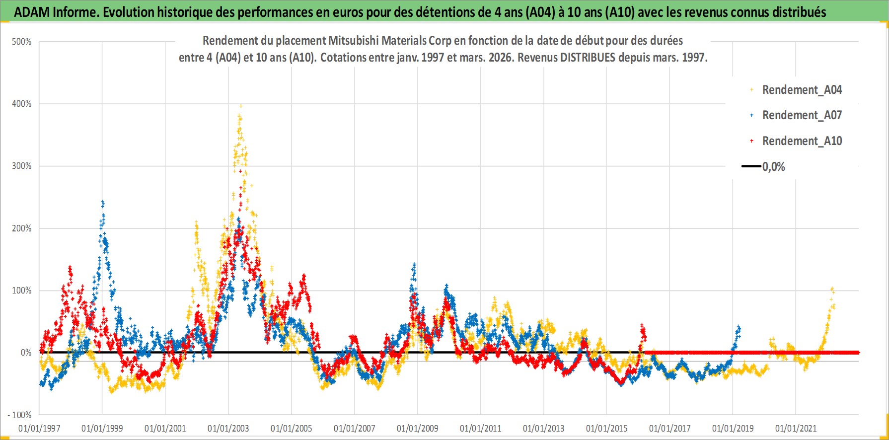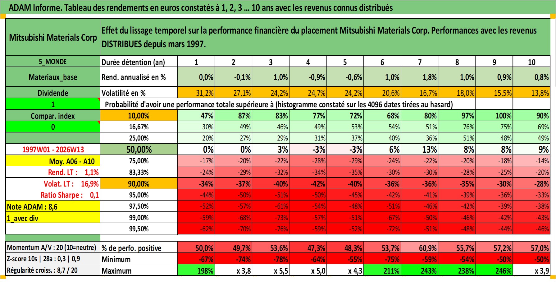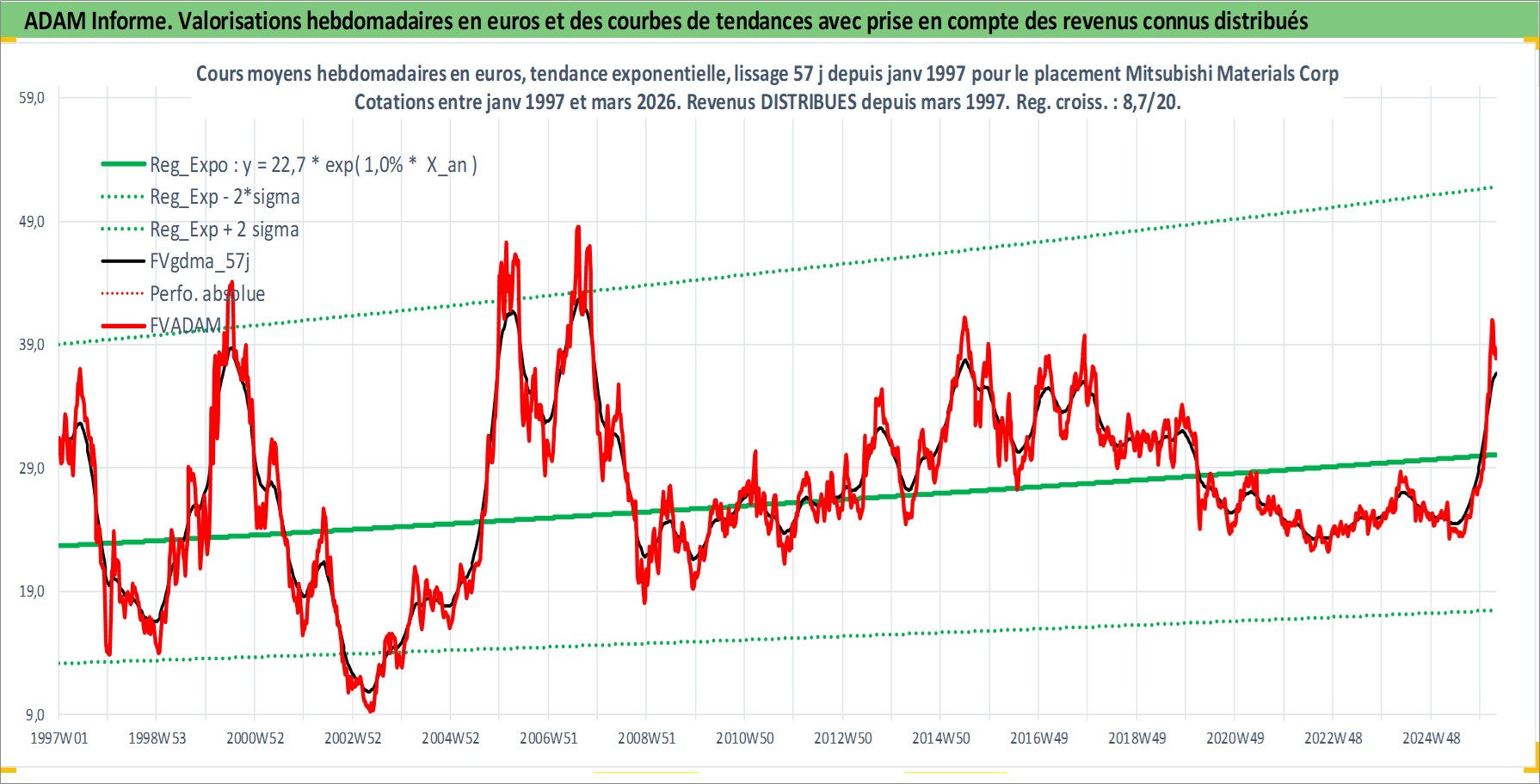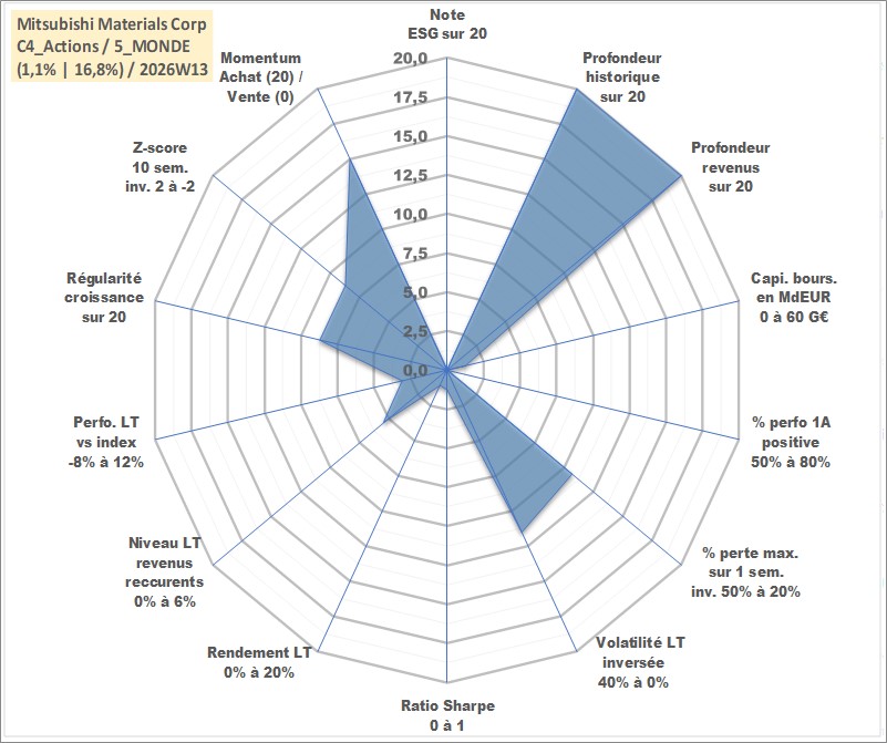 Site dédié aux investisseursPage dédiée sur site financeAnalyse des valorisations hebdomadaires de l'action Mitsubishi Materials Corp. Cet actif est cote en JPY. Les valorisations sont en contrevaleur EURO et couvrent les semaines 1997W01 a 2026W13. Les revenus de cet actif financier sont pris en compte depuis la semaine 1997W13. La note ESG de cet actif n'est pas connue.
