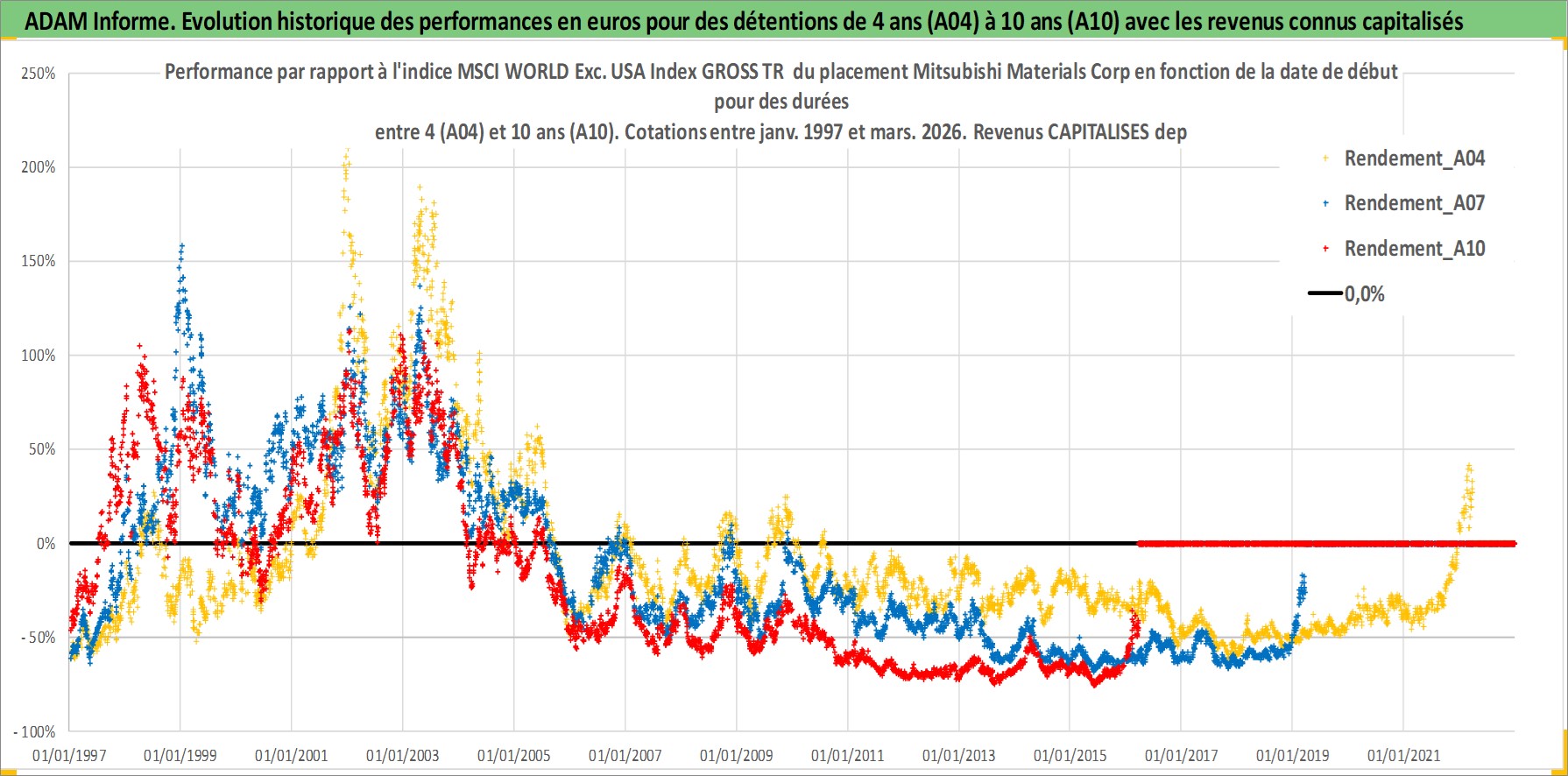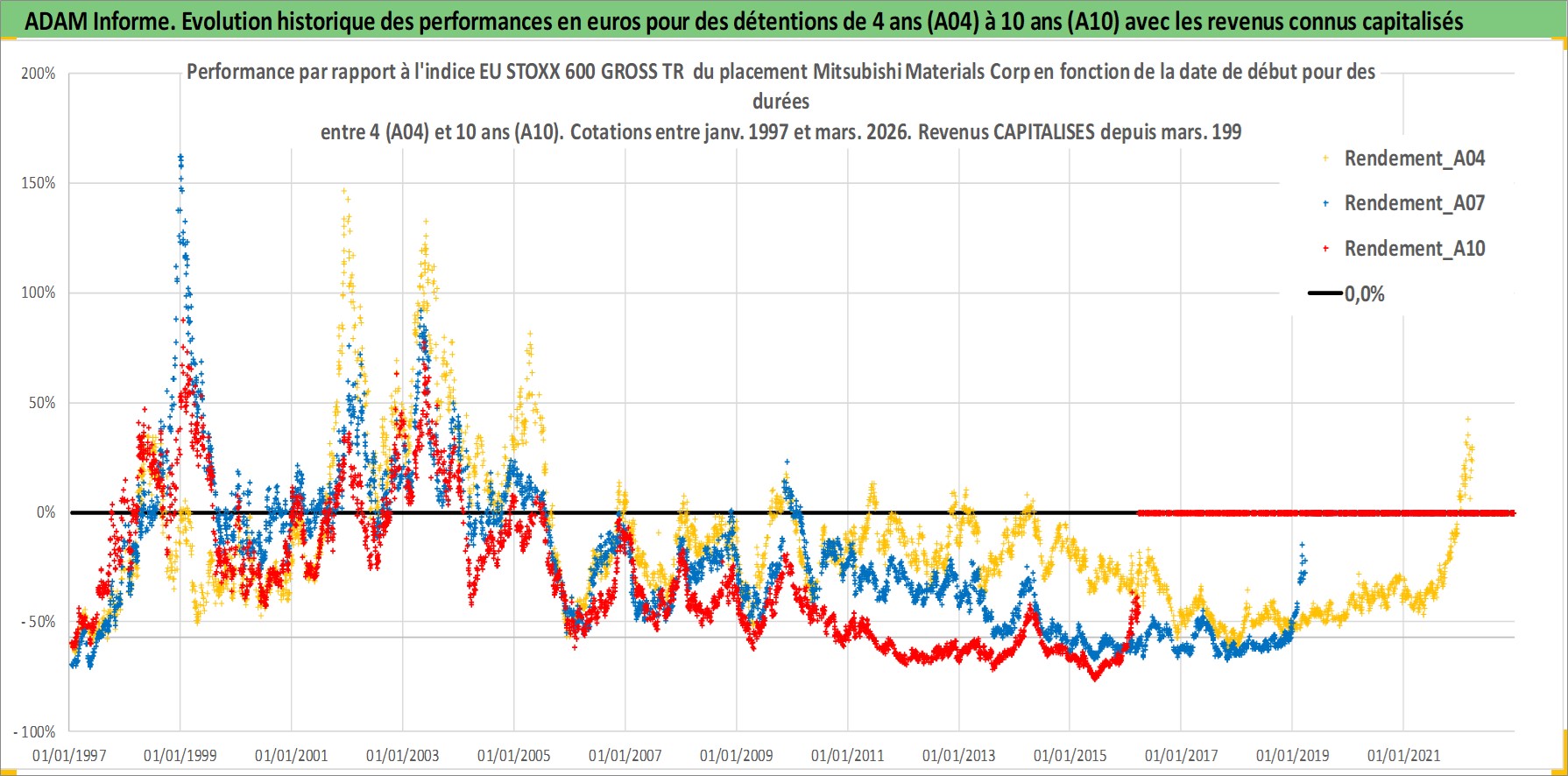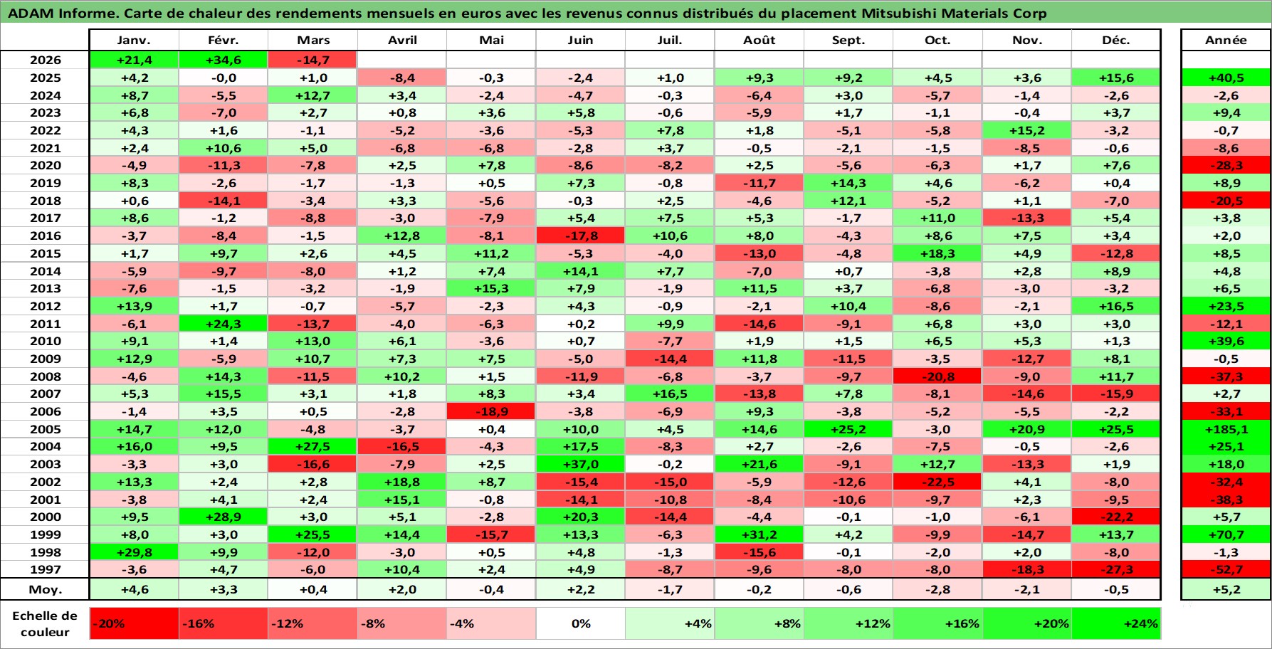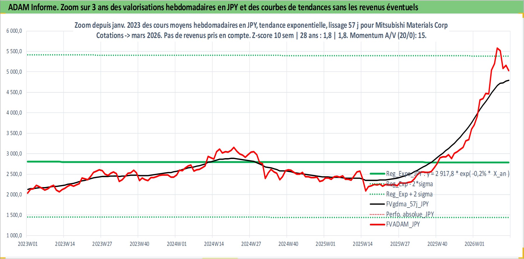 Site dédié aux investisseursPage dédiée sur site financeAnalyse des valorisations hebdomadaires de l'action Mitsubishi Materials Corp. Cet actif est cote en JPY. Les valorisations sont en contrevaleur EURO et couvrent les semaines 1997W01 a 2026W13. Les revenus de cet actif financier sont pris en compte depuis la semaine 1997W13. La note ESG de cet actif n'est pas connue.