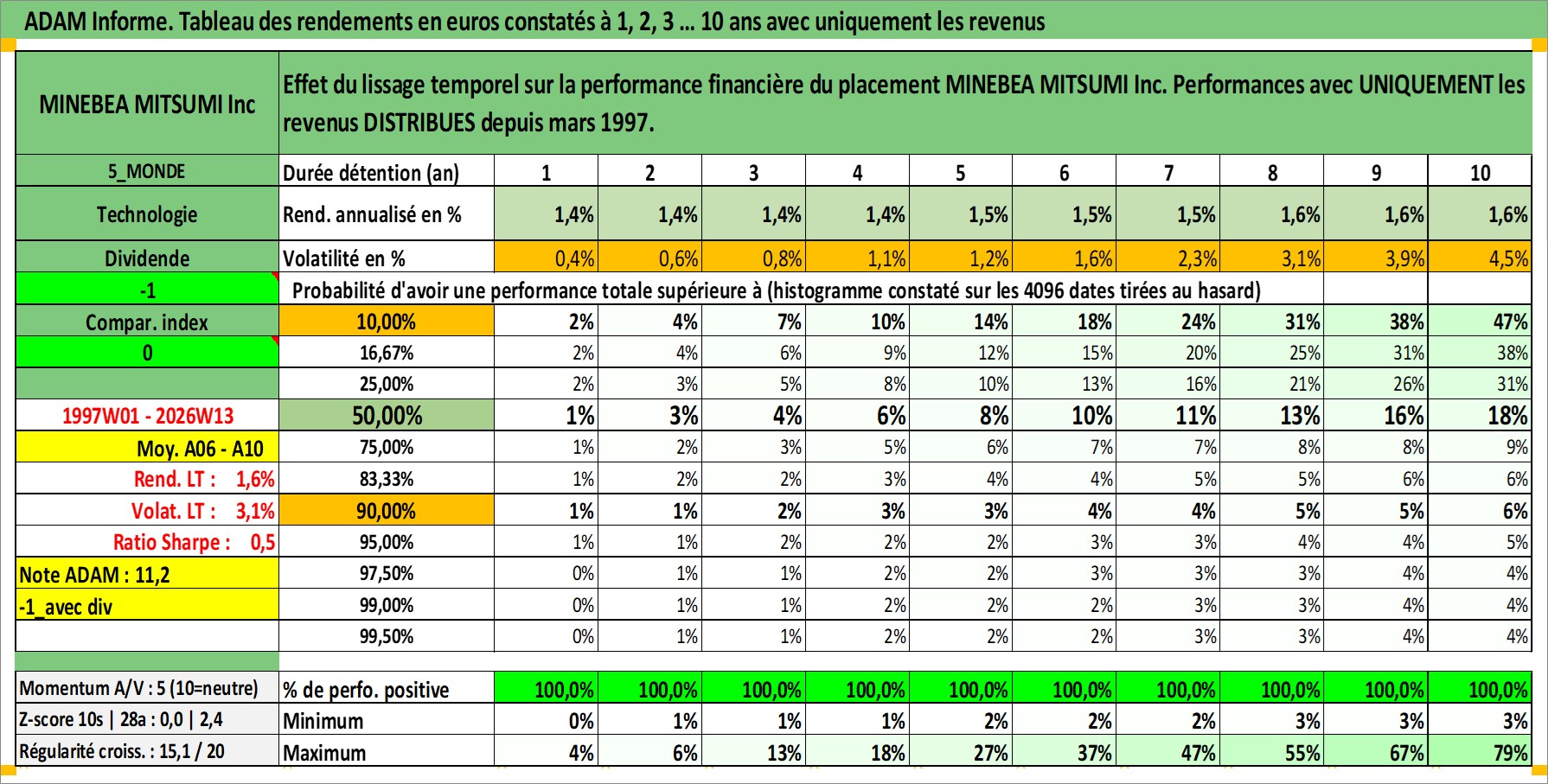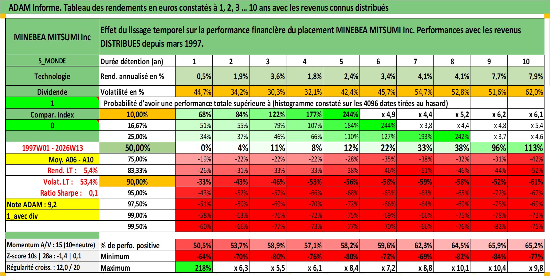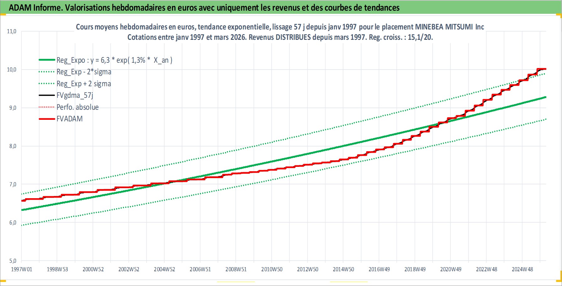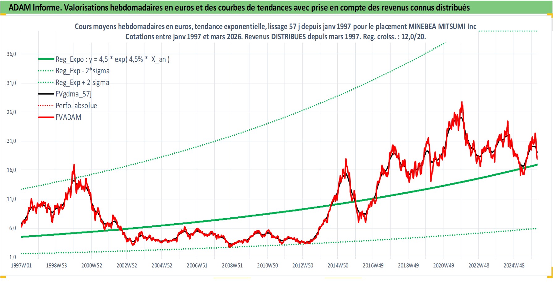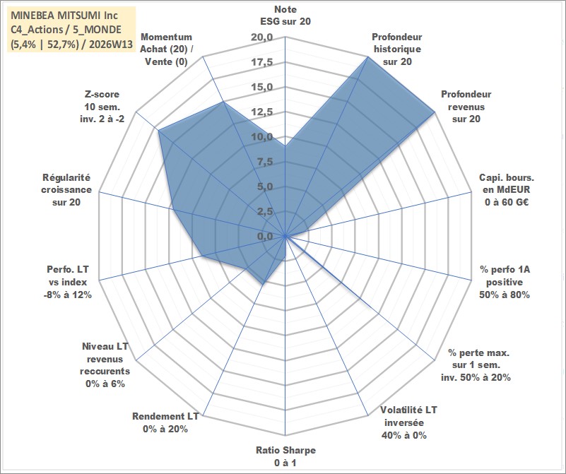Site dédié aux investisseursPage dédiée sur site financeAnalyse des valorisations hebdomadaires de l'action MINEBEA MITSUMI Inc. Cet actif est cote en JPY. Les valorisations sont en contrevaleur EURO et couvrent les semaines 1997W01 a 2026W13. Les revenus de cet actif financier sont pris en compte depuis la semaine 1997W13. La note globale ESG de cet actif est estimee a 9.0 (apres rebasage entre 0 et 20).