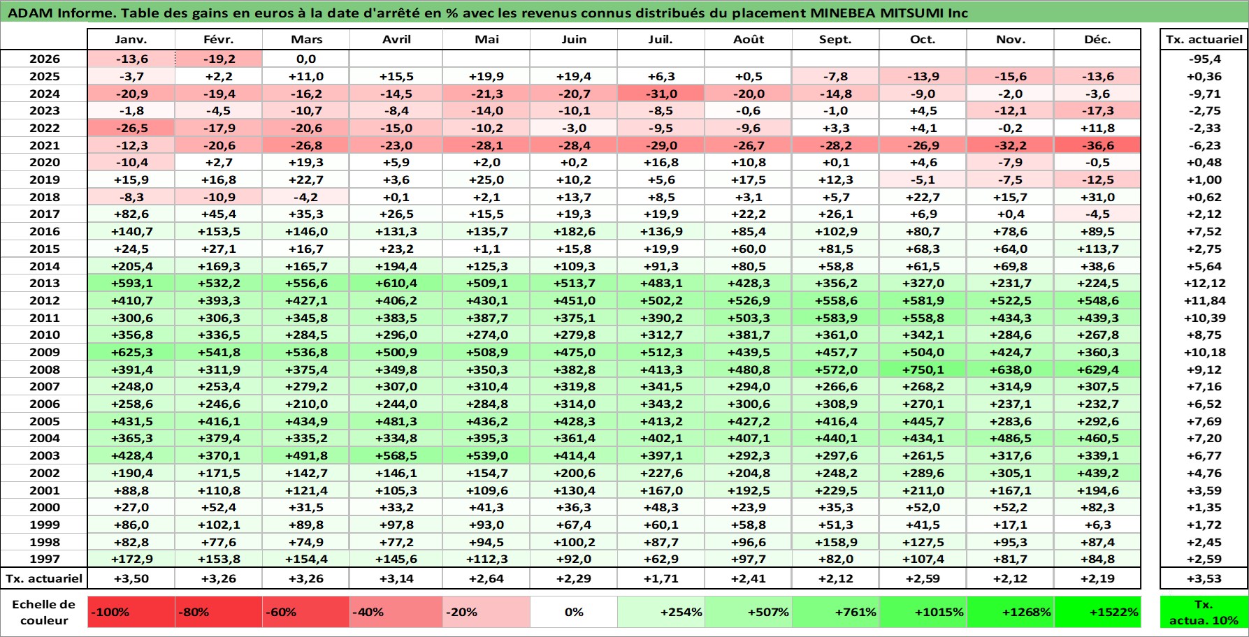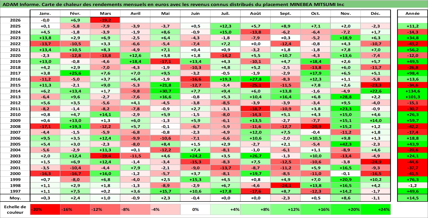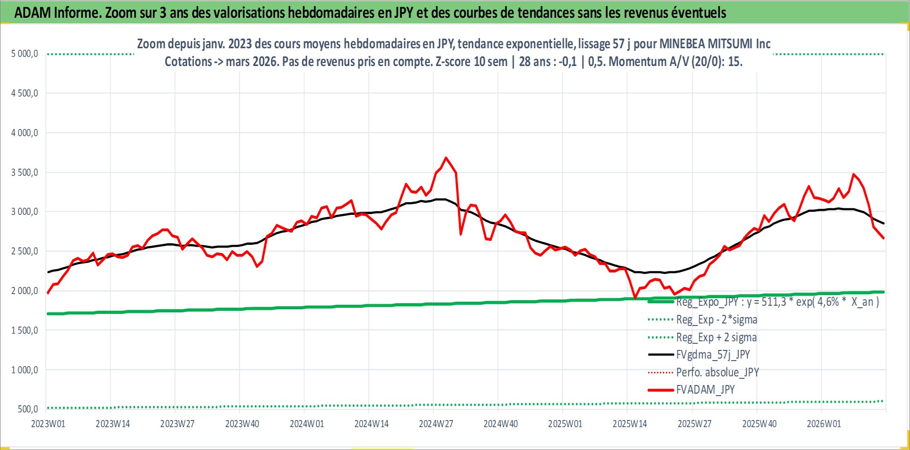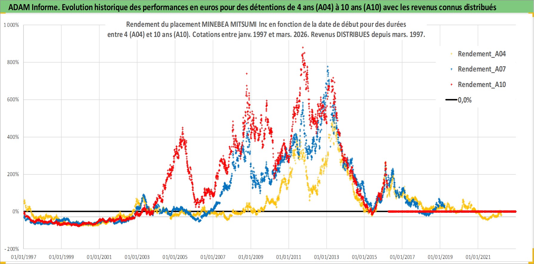 Site dédié aux investisseursPage dédiée sur site financeAnalyse des valorisations hebdomadaires de l'action MINEBEA MITSUMI Inc. Cet actif est cote en JPY. Les valorisations sont en contrevaleur EURO et couvrent les semaines 1997W01 a 2026W13. Les revenus de cet actif financier sont pris en compte depuis la semaine 1997W13. La note globale ESG de cet actif est estimee a 9.0 (apres rebasage entre 0 et 20).