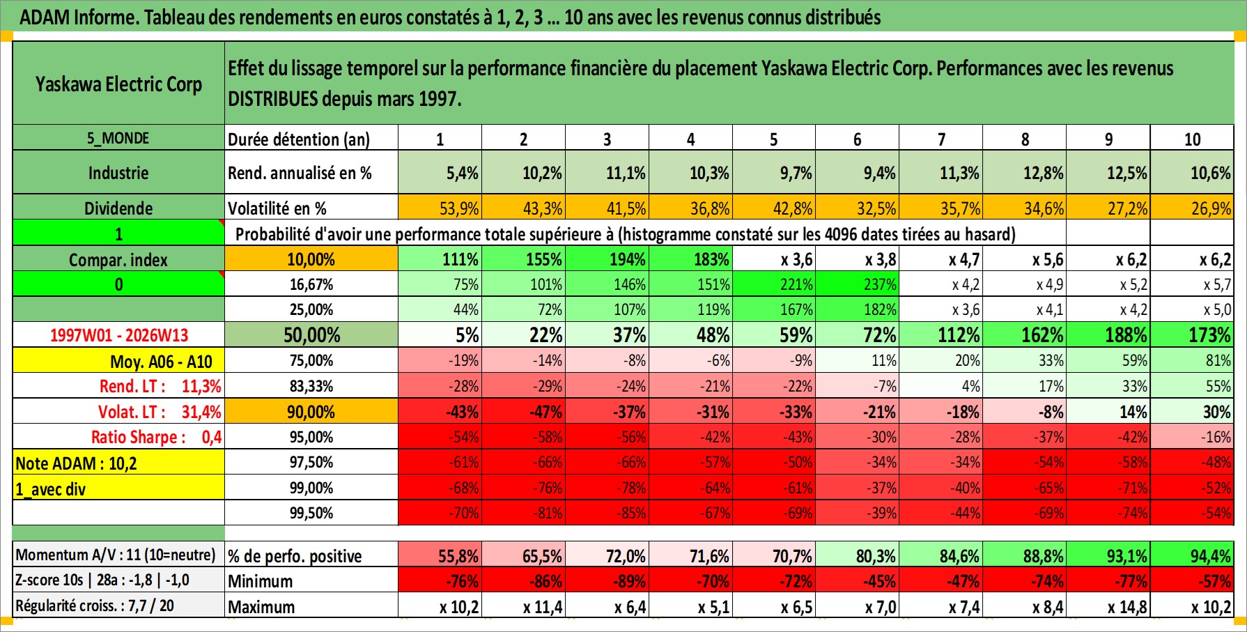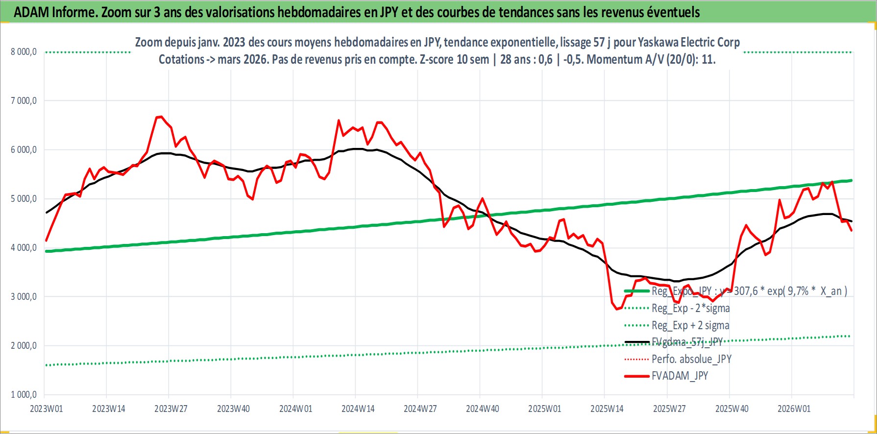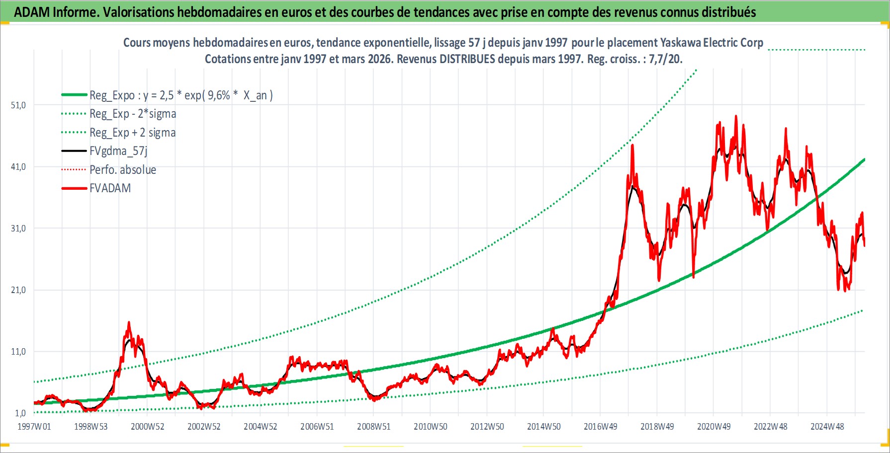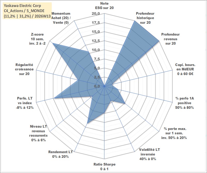 Site dédié aux investisseursPage dédiée sur site financeAnalyse des valorisations hebdomadaires de l'action Yaskawa Electric Corp. Cet actif est cote en JPY. Les valorisations sont en contrevaleur EURO et couvrent les semaines 1997W01 a 2026W13. Les revenus de cet actif financier sont pris en compte depuis la semaine 1997W11. La note ESG de cet actif n'est pas connue.