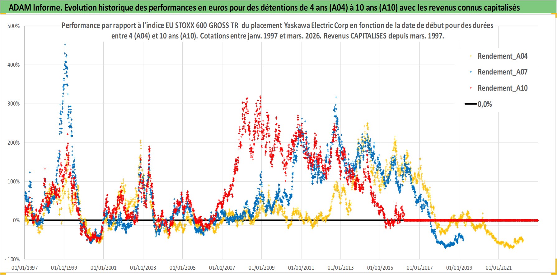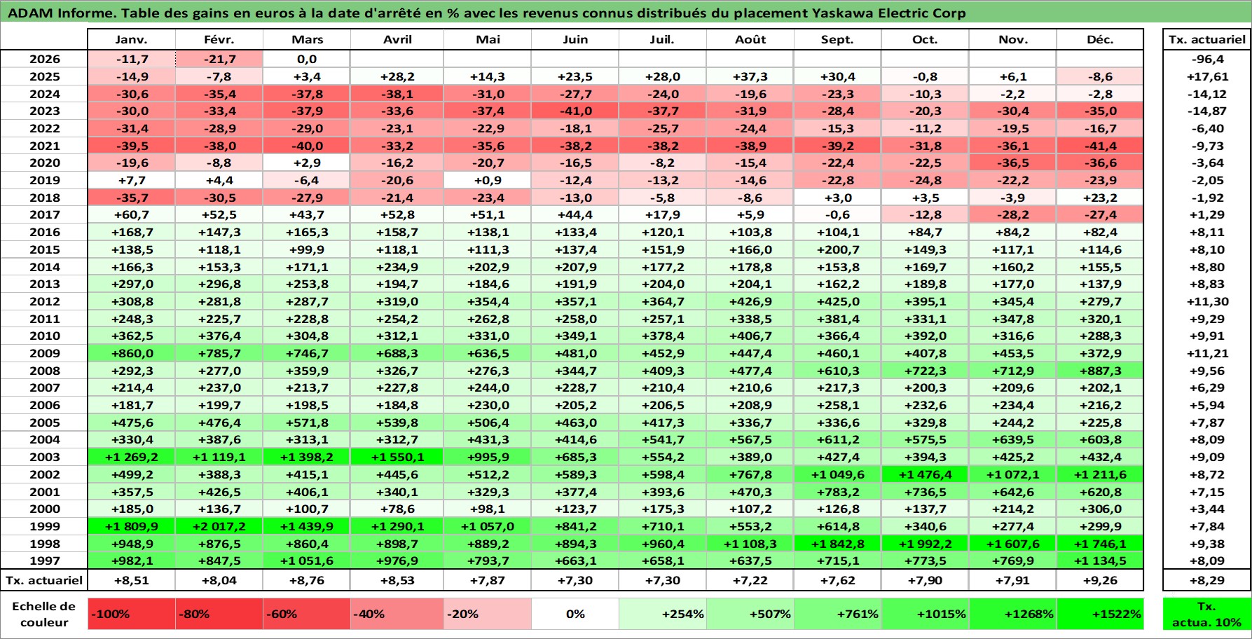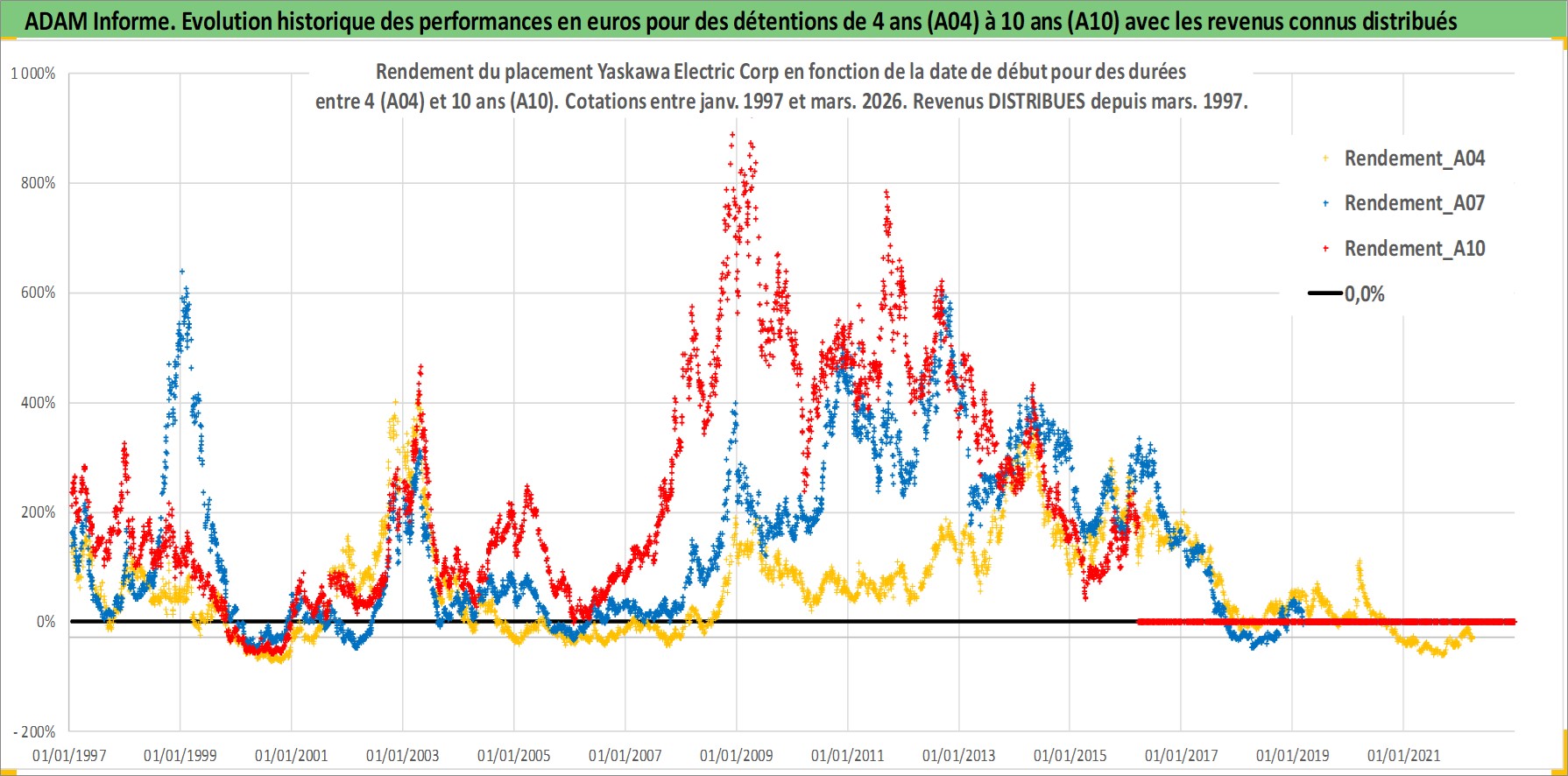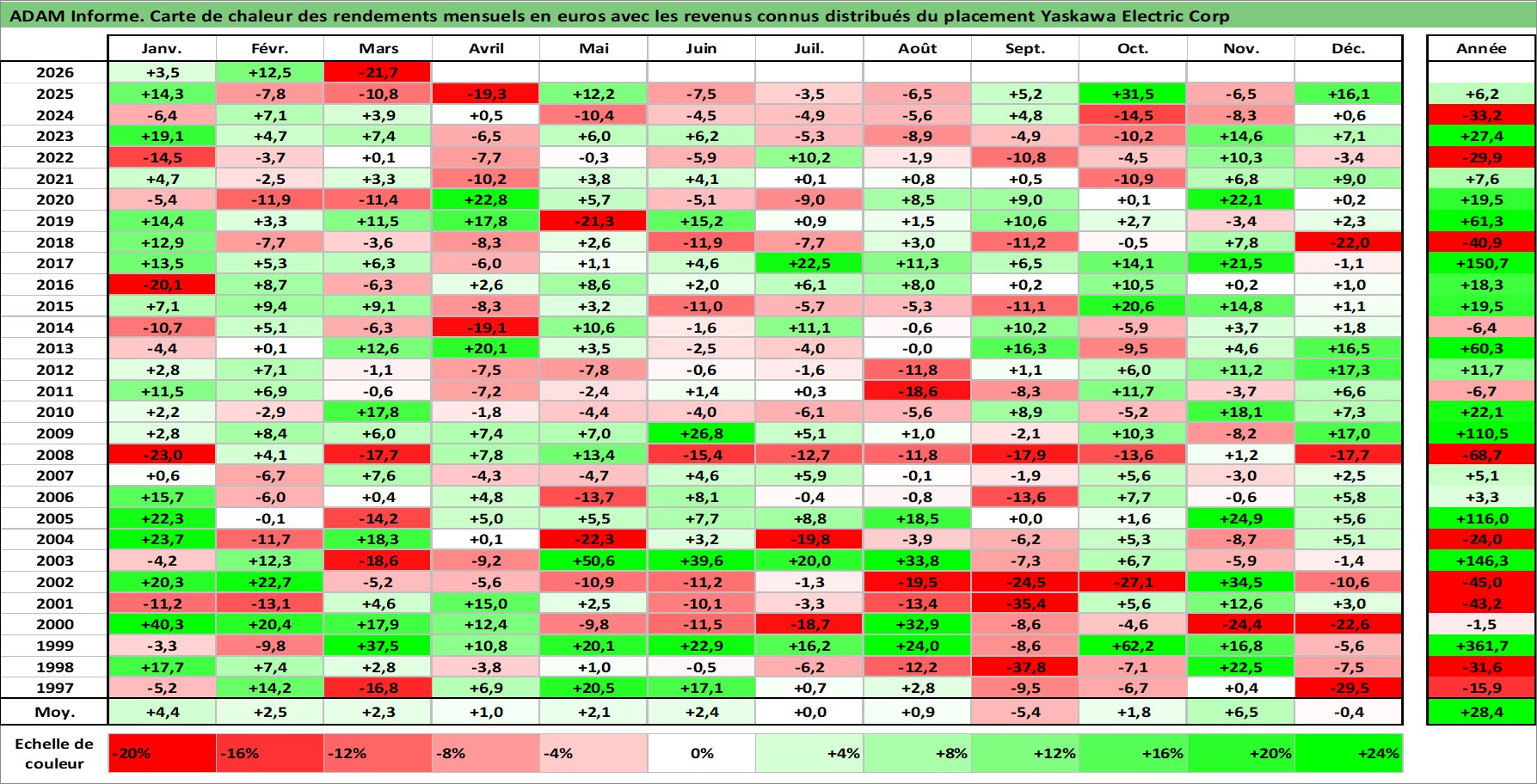 Site dédié aux investisseursPage dédiée sur site financeAnalyse des valorisations hebdomadaires de l'action Yaskawa Electric Corp. Cet actif est cote en JPY. Les valorisations sont en contrevaleur EURO et couvrent les semaines 1997W01 a 2026W13. Les revenus de cet actif financier sont pris en compte depuis la semaine 1997W11. La note ESG de cet actif n'est pas connue.