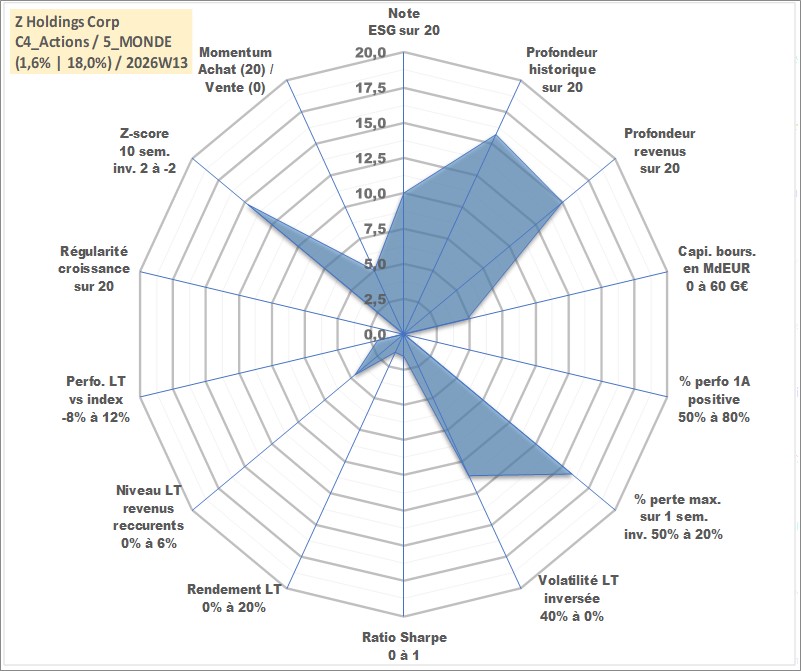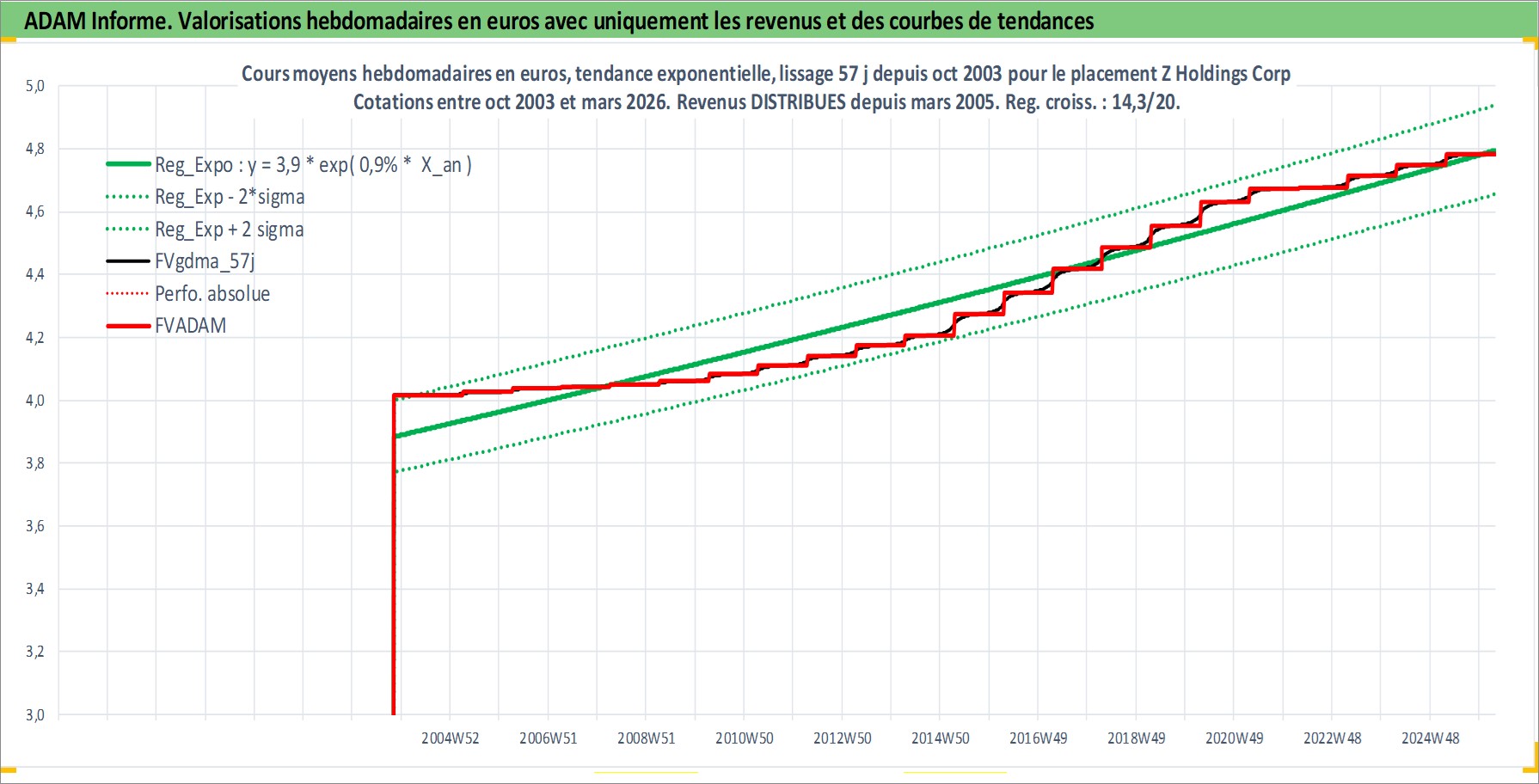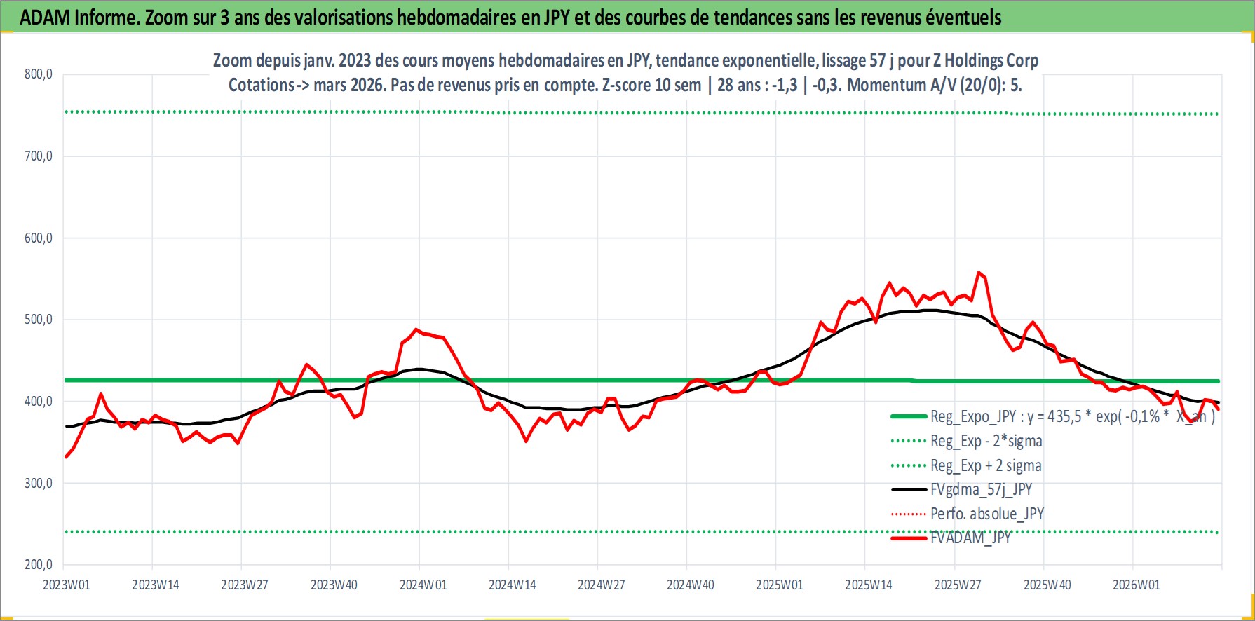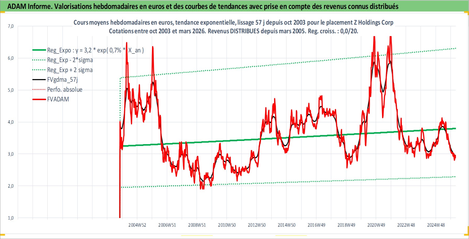 Site dédié aux investisseursPage dédiée sur site financeAnalyse des valorisations hebdomadaires de l'action Z Holdings Corp. Cet actif est cote en JPY. Les valorisations sont en contrevaleur EURO et couvrent les semaines 2003W44 a 2026W13. Les revenus de cet actif financier sont pris en compte depuis la semaine 2005W13. La note globale ESG de cet actif est estimee a 10.0 (apres rebasage entre 0 et 20).