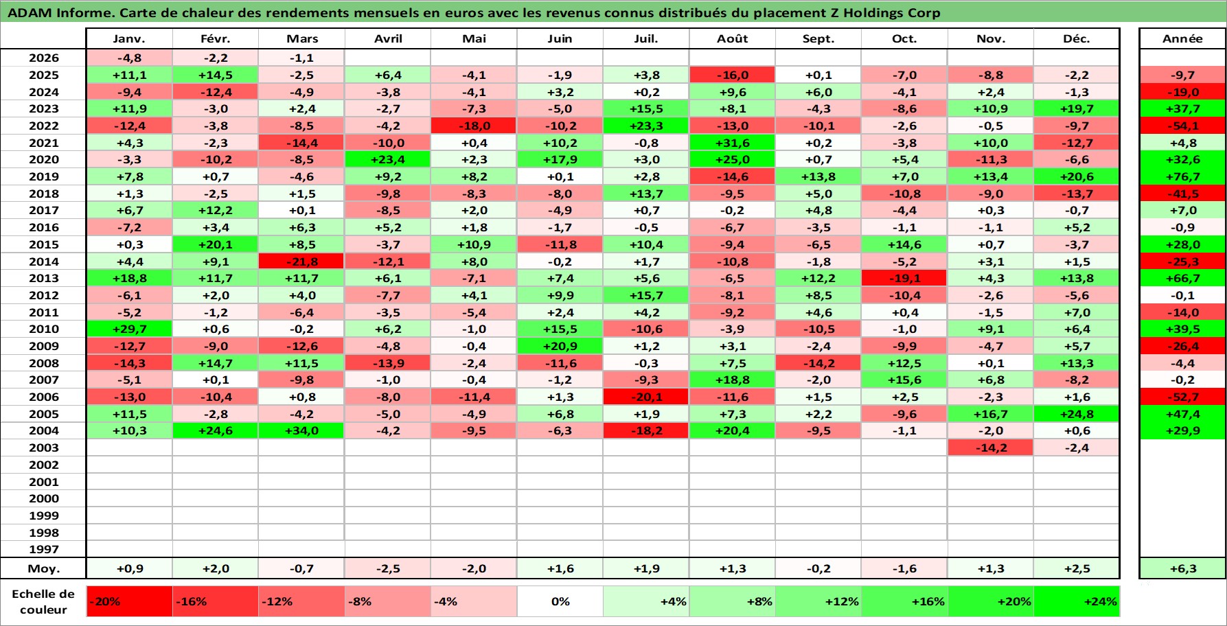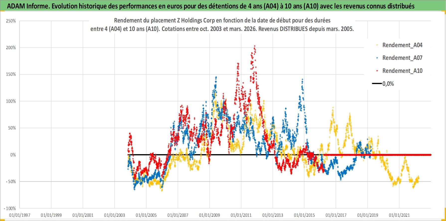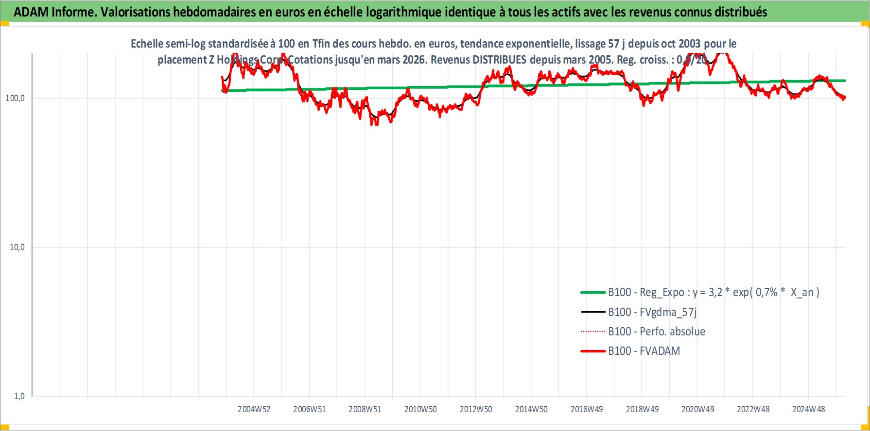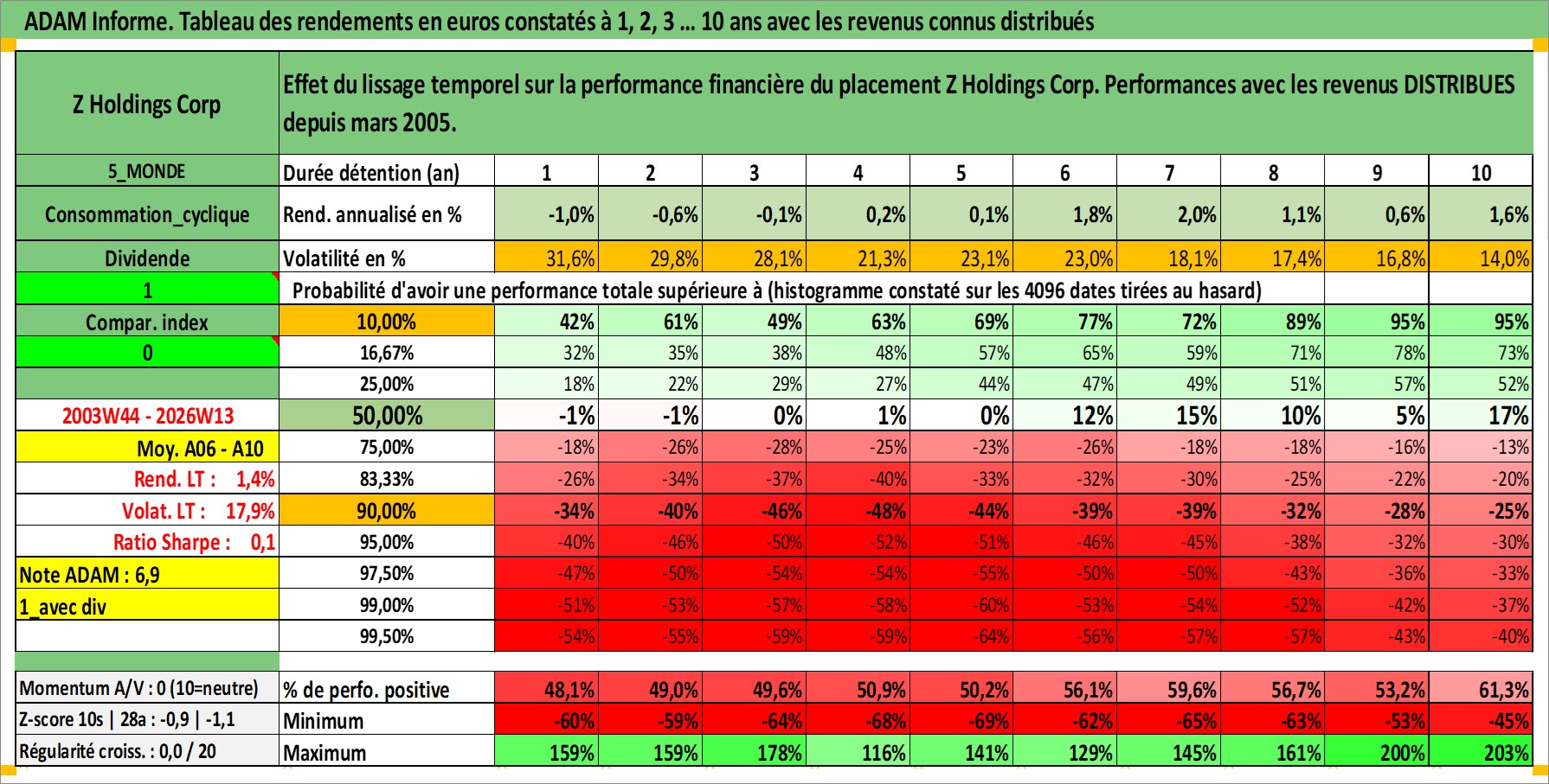 Site dédié aux investisseursPage dédiée sur site financeAnalyse des valorisations hebdomadaires de l'action Z Holdings Corp. Cet actif est cote en JPY. Les valorisations sont en contrevaleur EURO et couvrent les semaines 2003W44 a 2026W13. Les revenus de cet actif financier sont pris en compte depuis la semaine 2005W13. La note globale ESG de cet actif est estimee a 10.0 (apres rebasage entre 0 et 20).