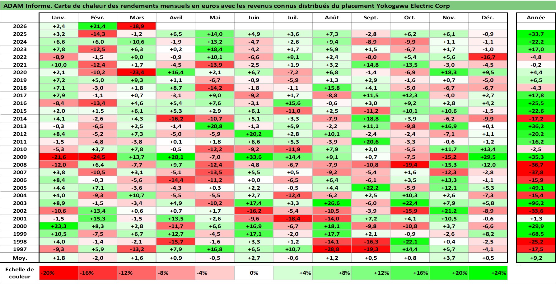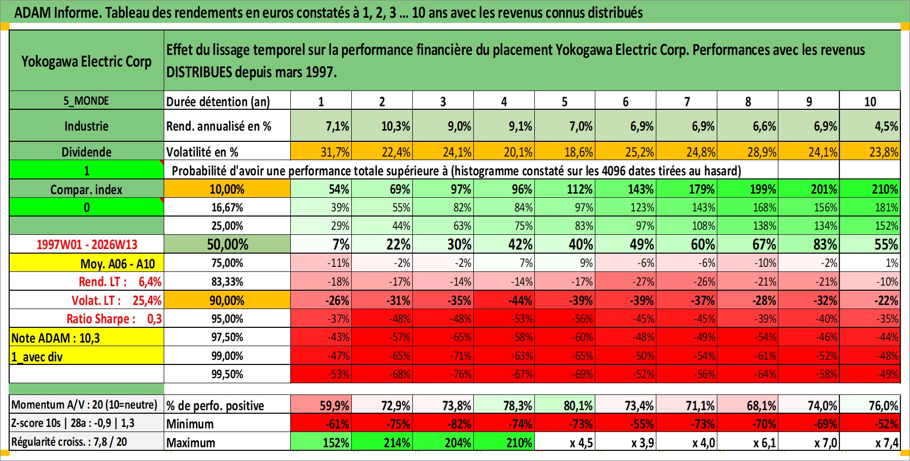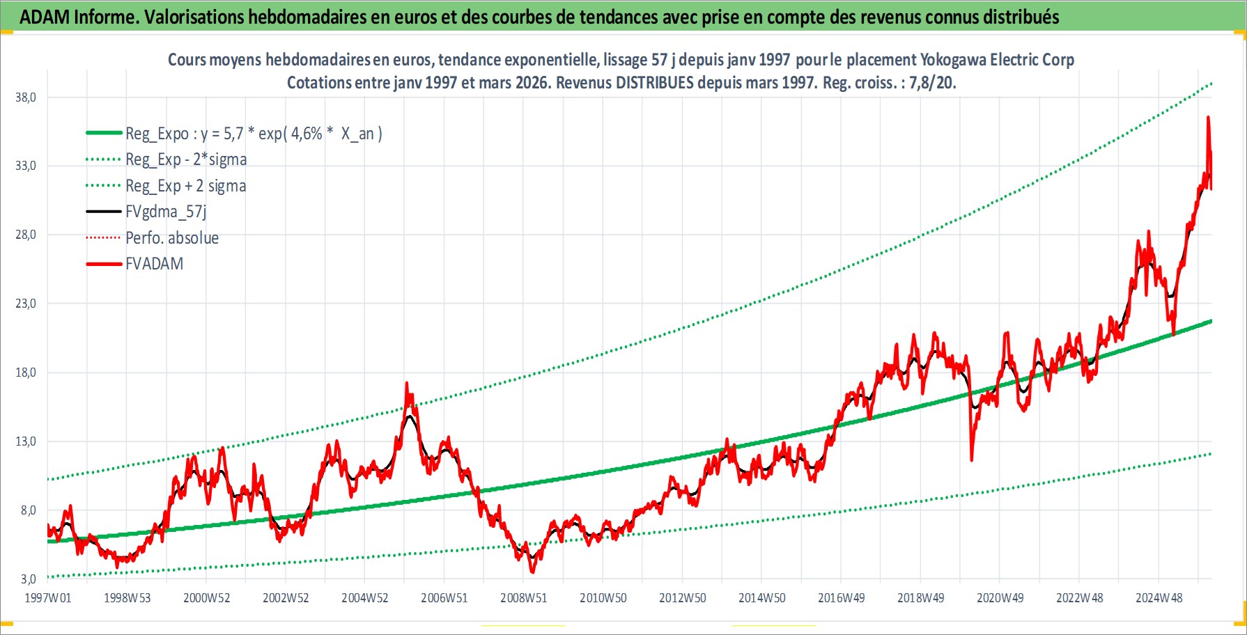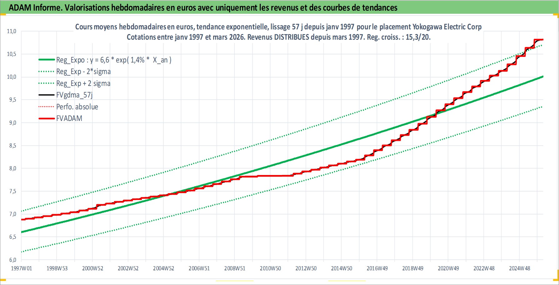 Site dédié aux investisseursPage dédiée sur site financeAnalyse des valorisations hebdomadaires de l'action Yokogawa Electric Corp. Cet actif est cote en JPY. Les valorisations sont en contrevaleur EURO et couvrent les semaines 1997W01 a 2026W13. Les revenus de cet actif financier sont pris en compte depuis la semaine 1997W13. La note ESG de cet actif n'est pas connue.