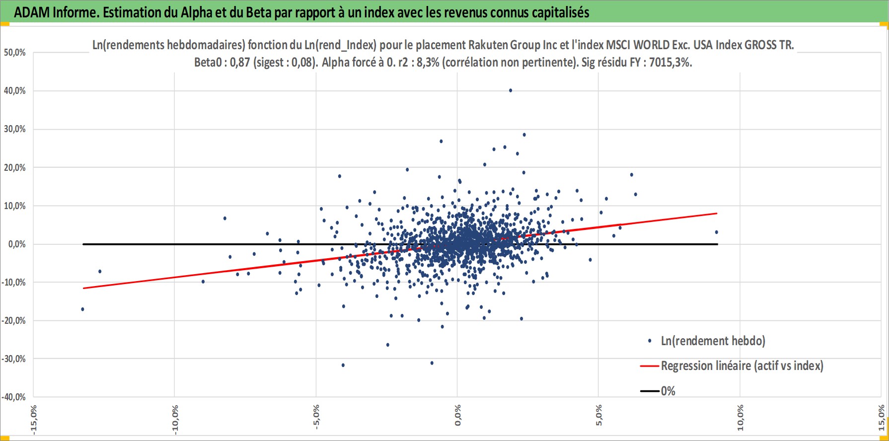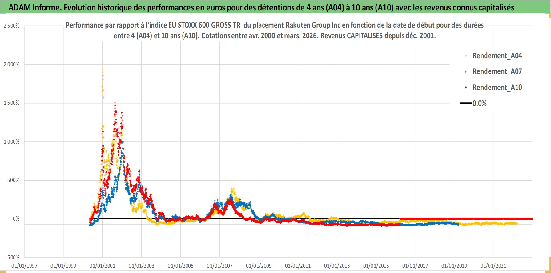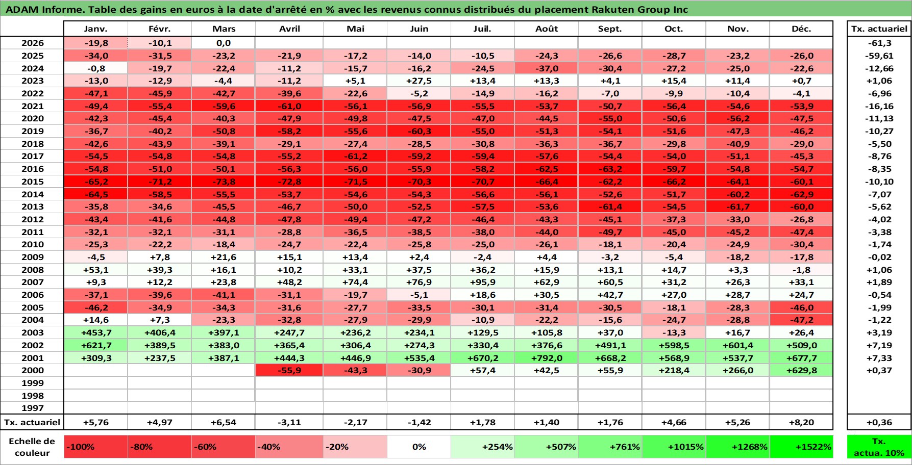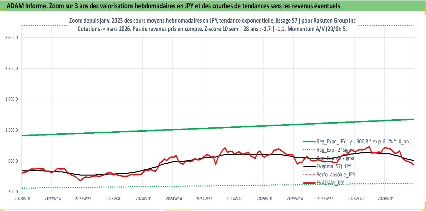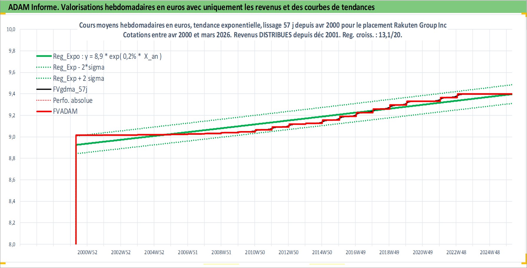 Site dédié aux investisseursPage dédiée sur site financeAnalyse des valorisations hebdomadaires de l'action Rakuten Group Inc. Cet actif est cote en JPY. Les valorisations sont en contrevaleur EURO et couvrent les semaines 2000W17 a 2026W13. Les revenus de cet actif financier sont pris en compte depuis la semaine 2001W52. La note globale ESG de cet actif est estimee a 9.0 (apres rebasage entre 0 et 20).
