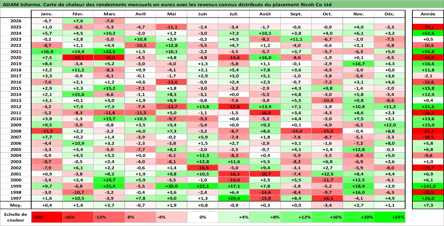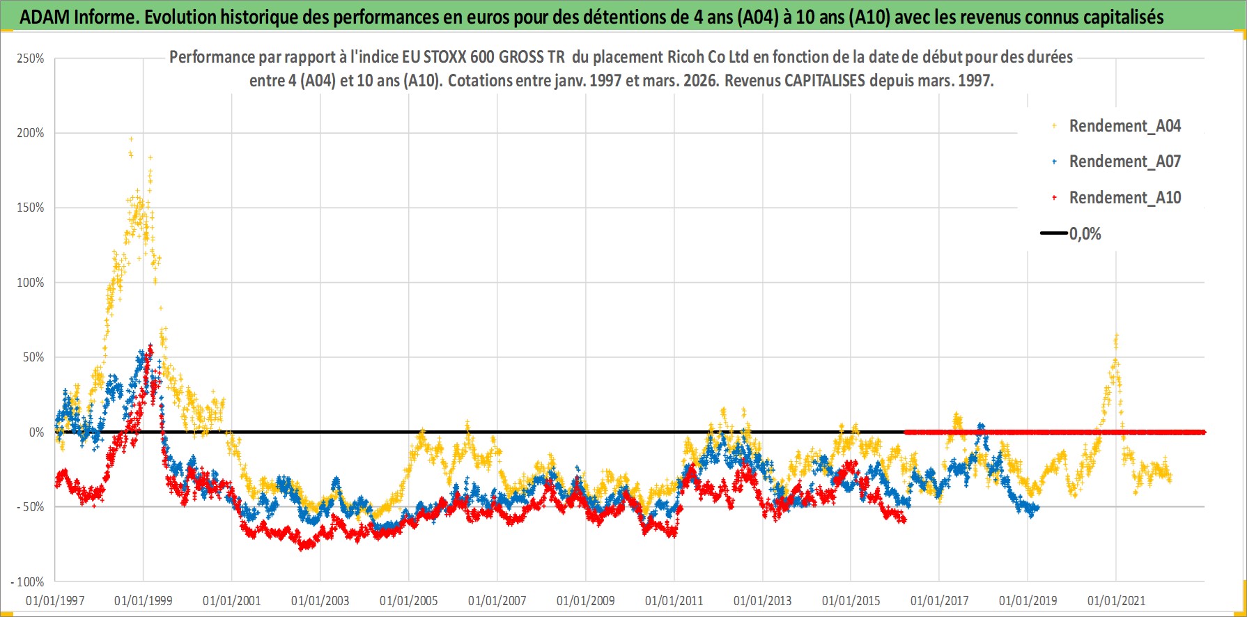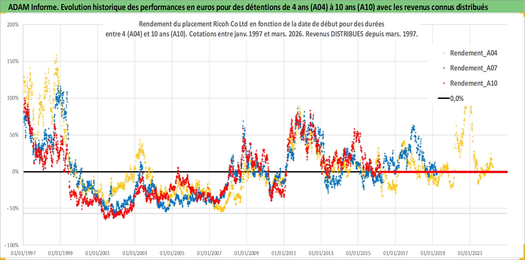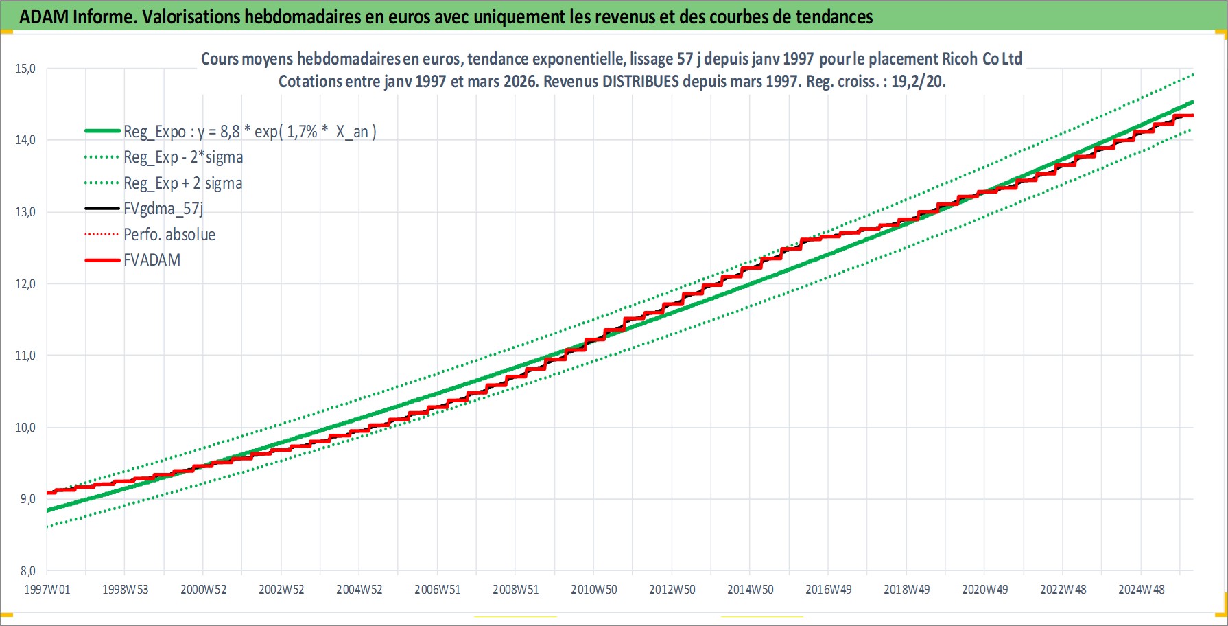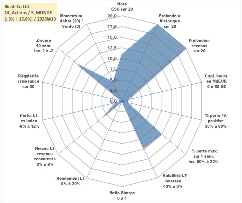 Site dédié aux investisseursPage dédiée sur site financeAnalyse des valorisations hebdomadaires de l'action Ricoh Co Ltd. Cet actif est cote en JPY. Les valorisations sont en contrevaleur EURO et couvrent les semaines 1997W01 a 2026W13. Les revenus de cet actif financier sont pris en compte depuis la semaine 1997W13. La note globale ESG de cet actif est estimee a 11.0 (apres rebasage entre 0 et 20).