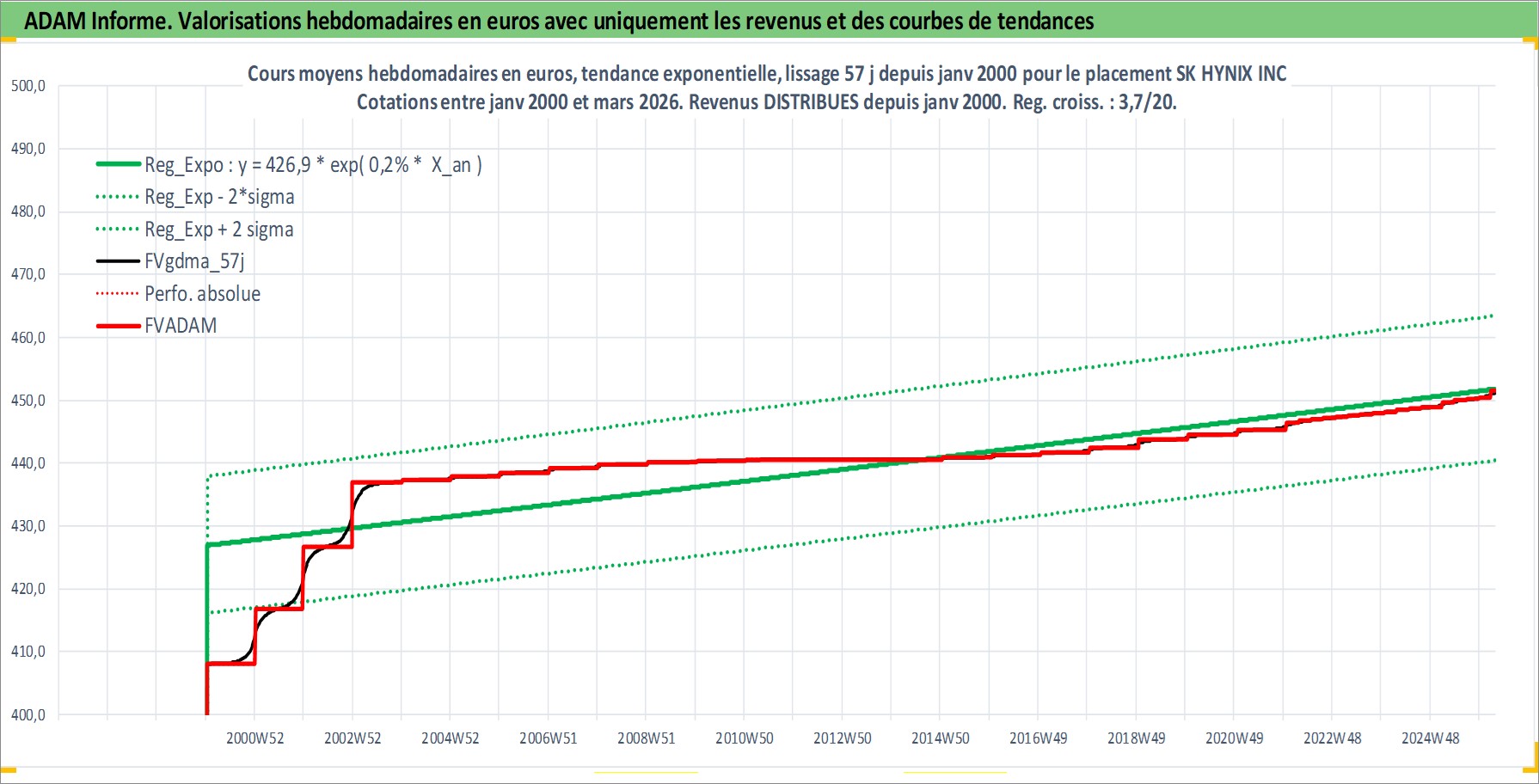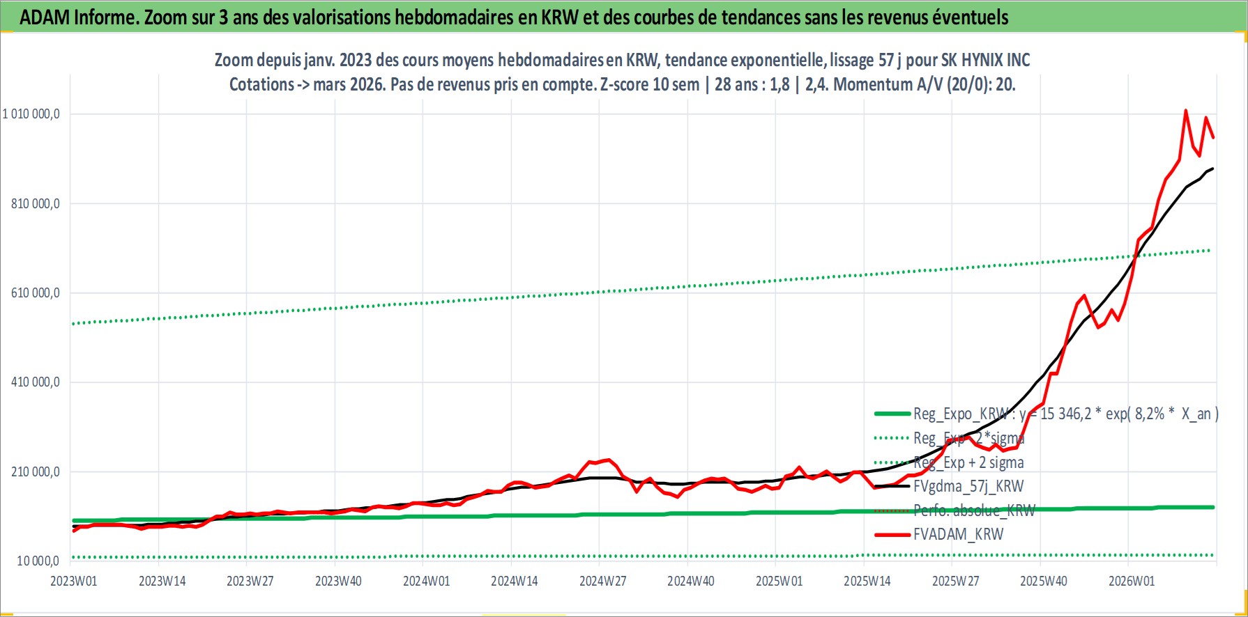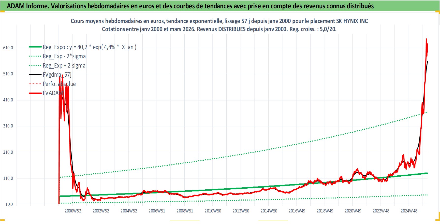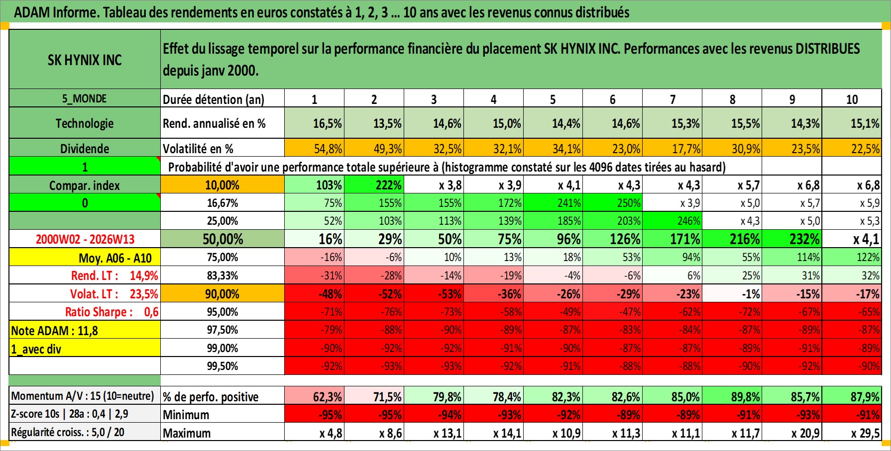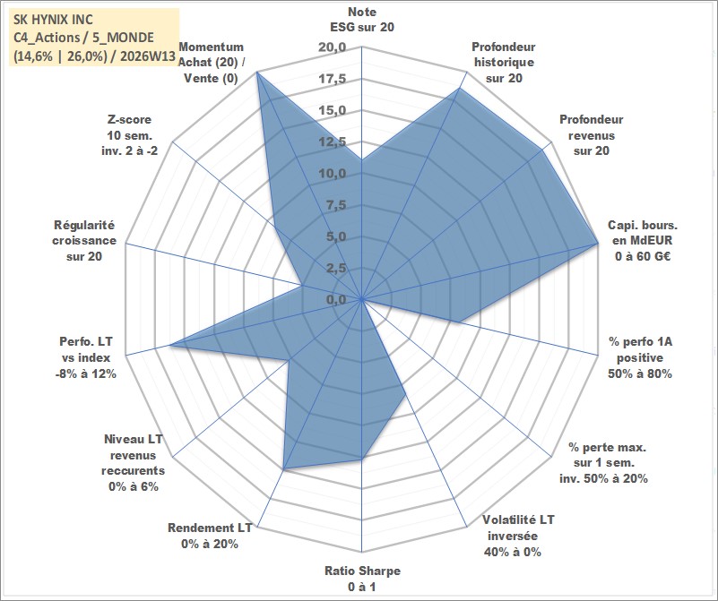 Site dédié aux investisseursPage dédiée sur site financeAnalyse des valorisations hebdomadaires de l'action SK HYNIX INC. Cet actif est cote en KRW. Les valorisations sont en contrevaleur EURO et couvrent les semaines 2000W02 a 2026W13. Les revenus de cet actif financier sont pris en compte depuis la semaine 2000W01. La note globale ESG de cet actif est estimee a 11.0 (apres rebasage entre 0 et 20).