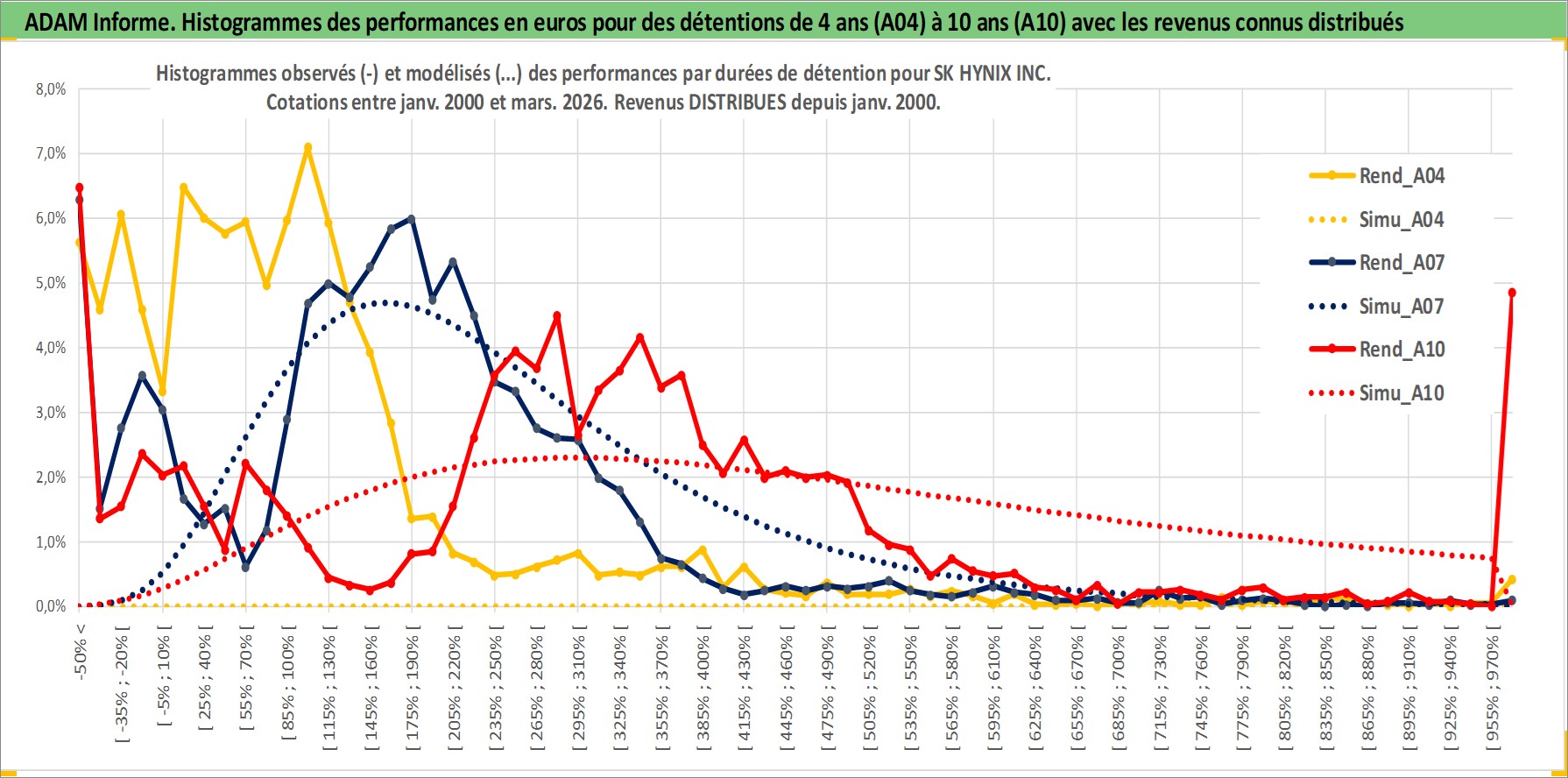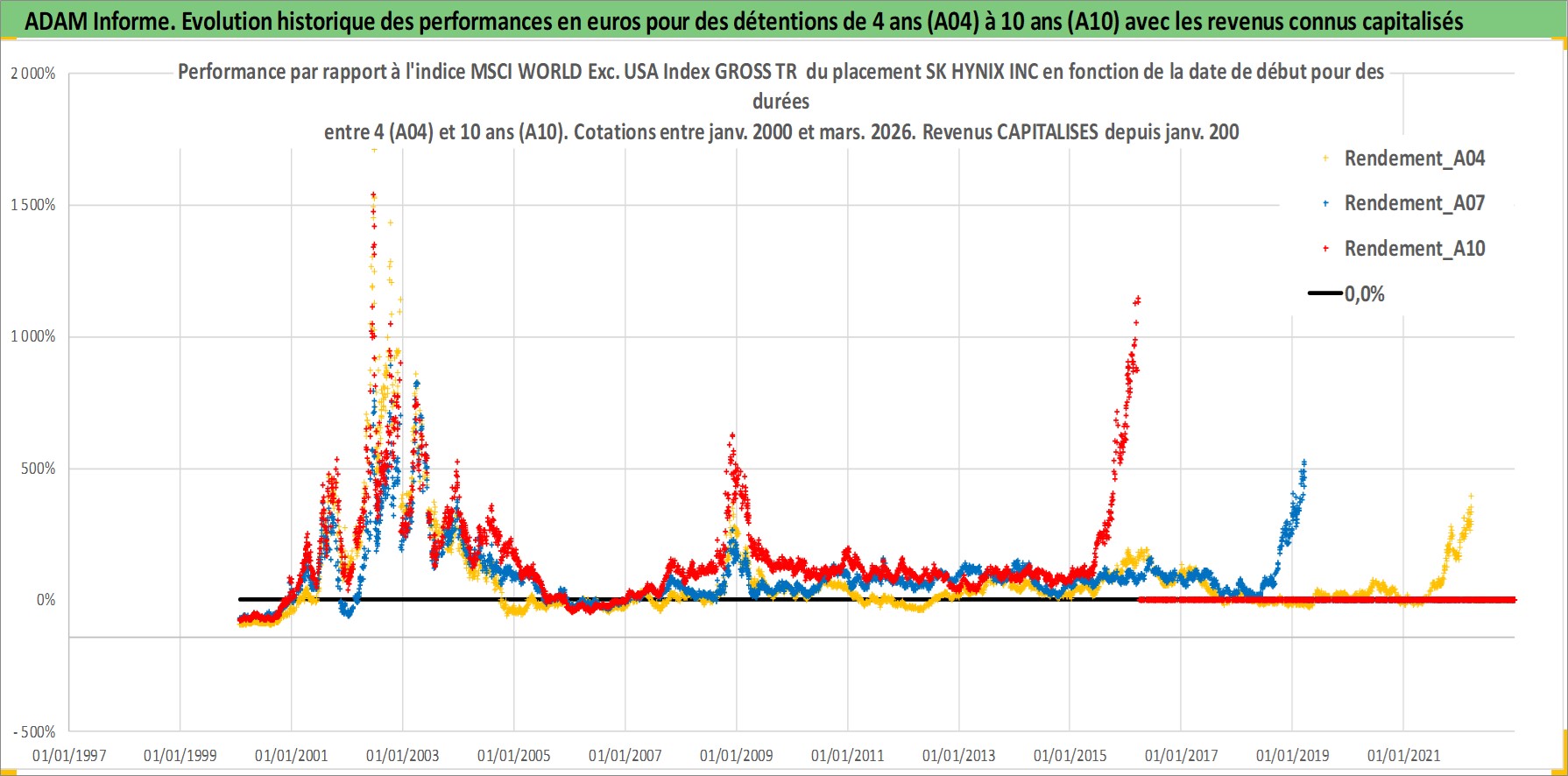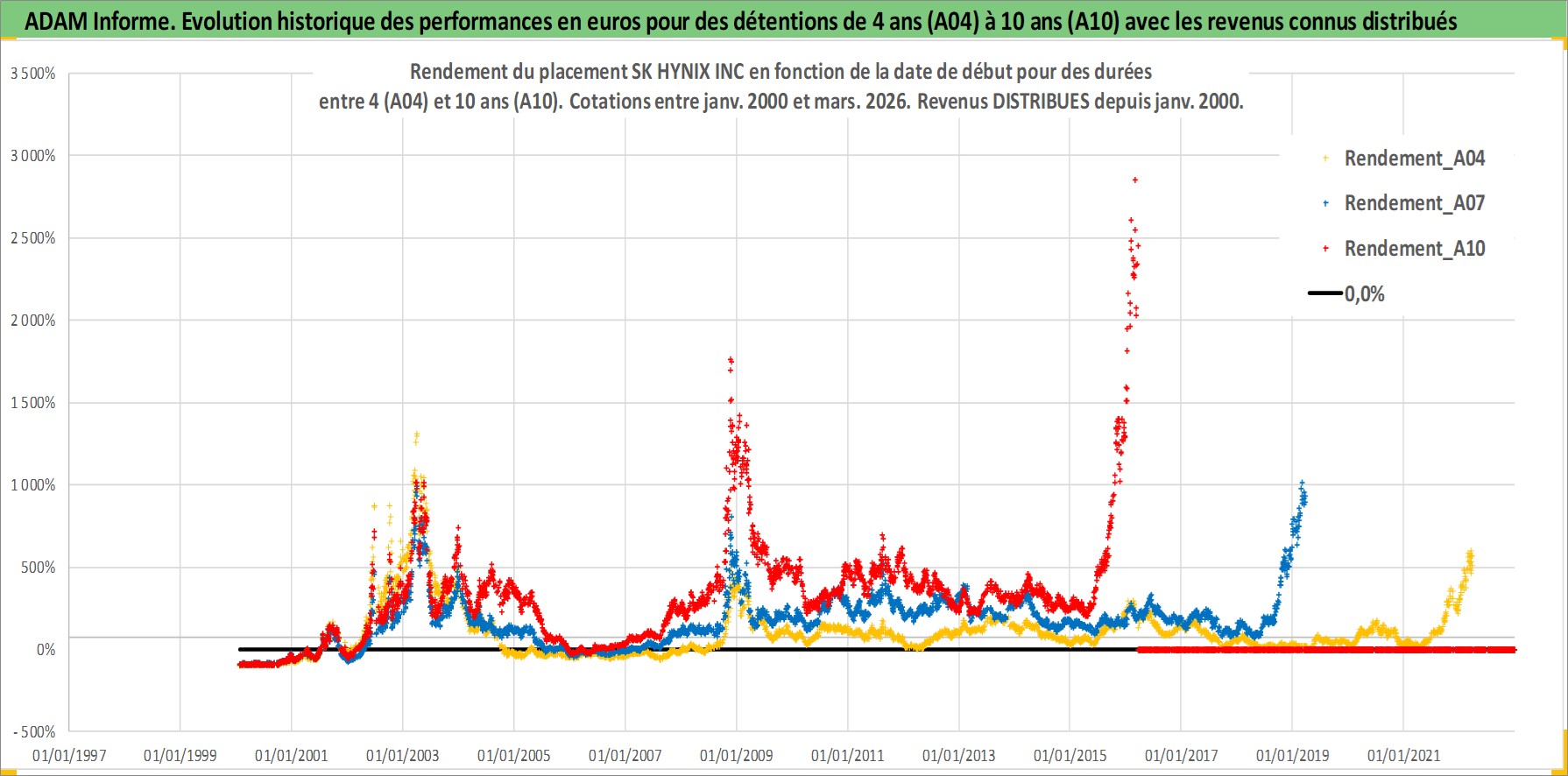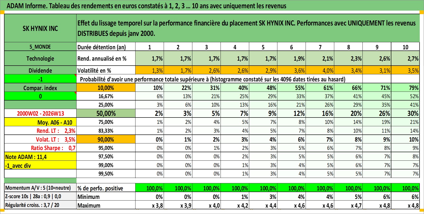Site dédié aux investisseursPage dédiée sur site financeAnalyse des valorisations hebdomadaires de l'action SK HYNIX INC. Cet actif est cote en KRW. Les valorisations sont en contrevaleur EURO et couvrent les semaines 2000W02 a 2026W13. Les revenus de cet actif financier sont pris en compte depuis la semaine 2000W01. La note globale ESG de cet actif est estimee a 11.0 (apres rebasage entre 0 et 20).