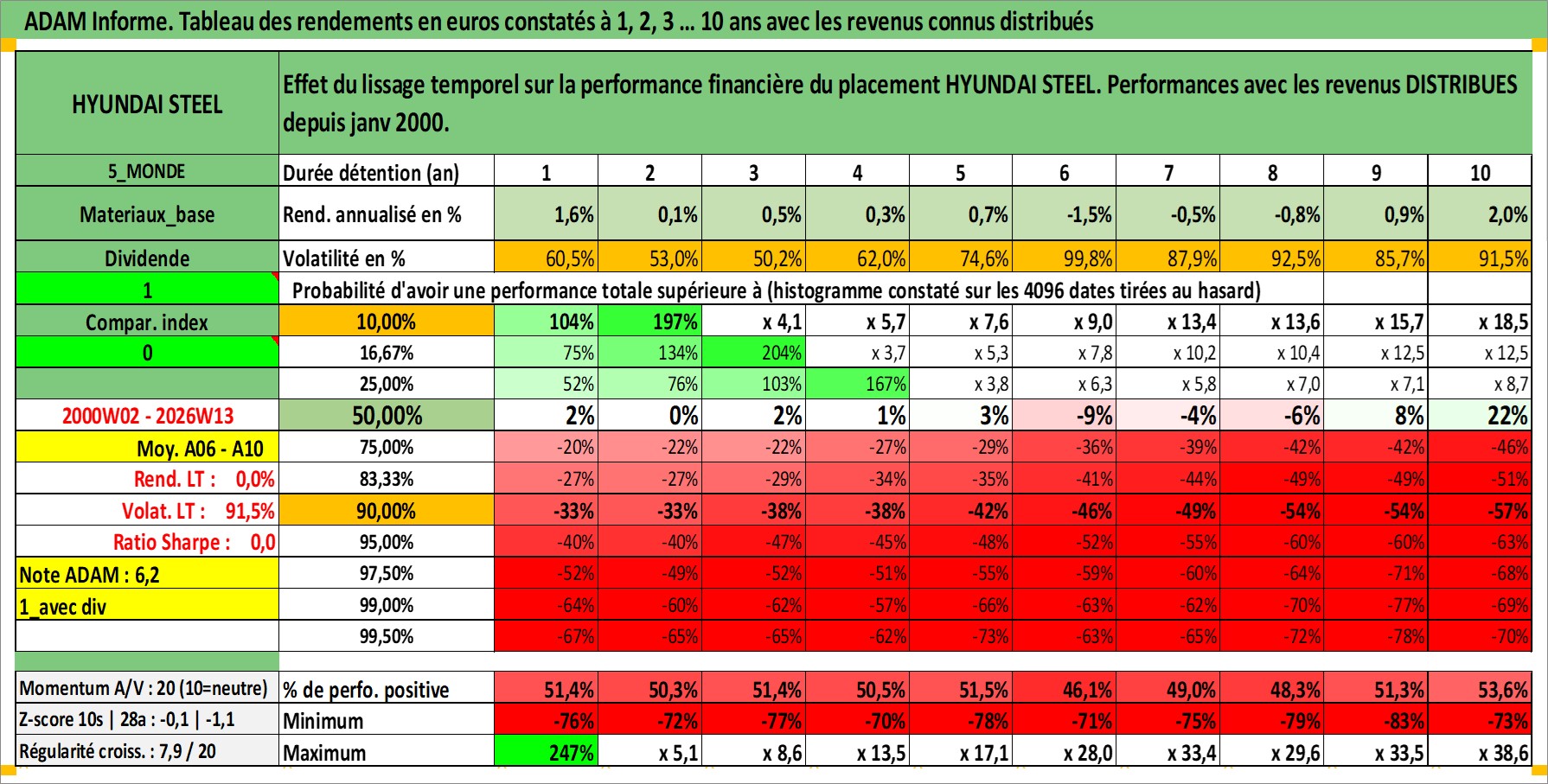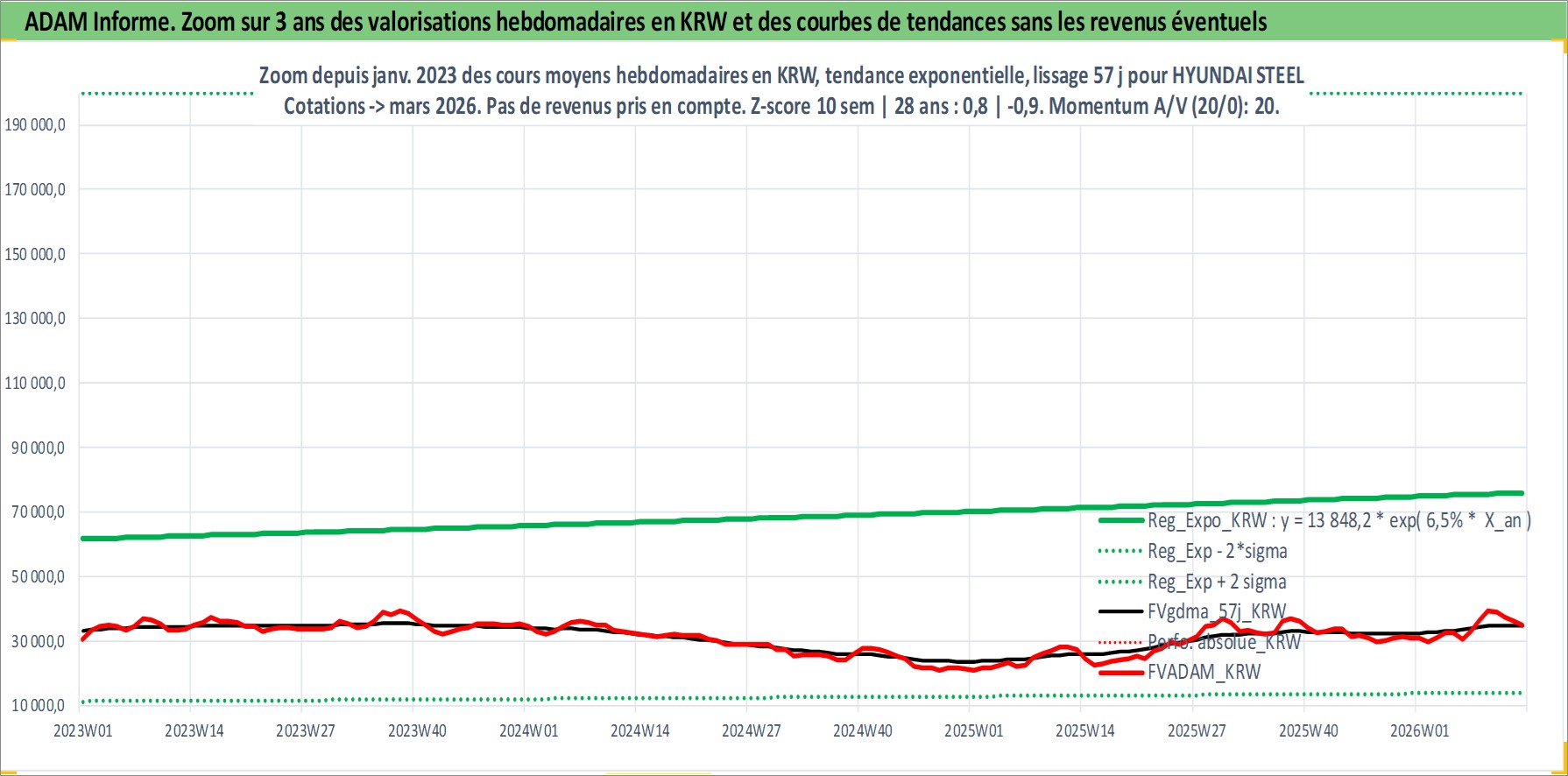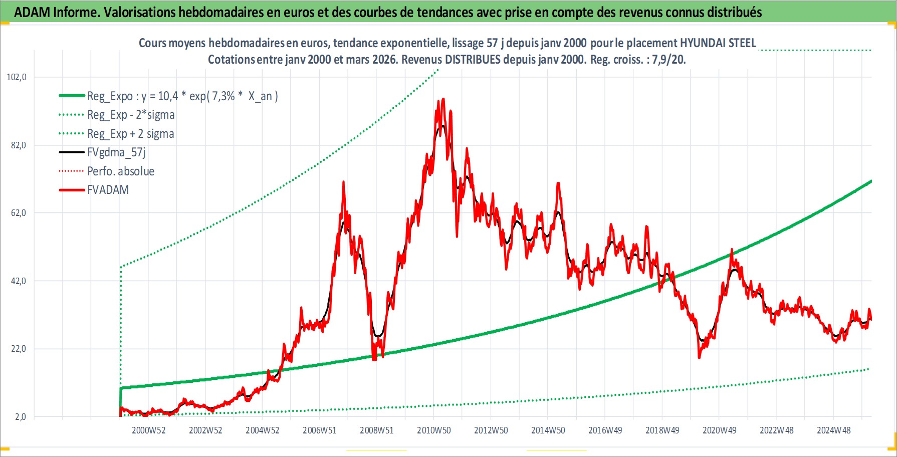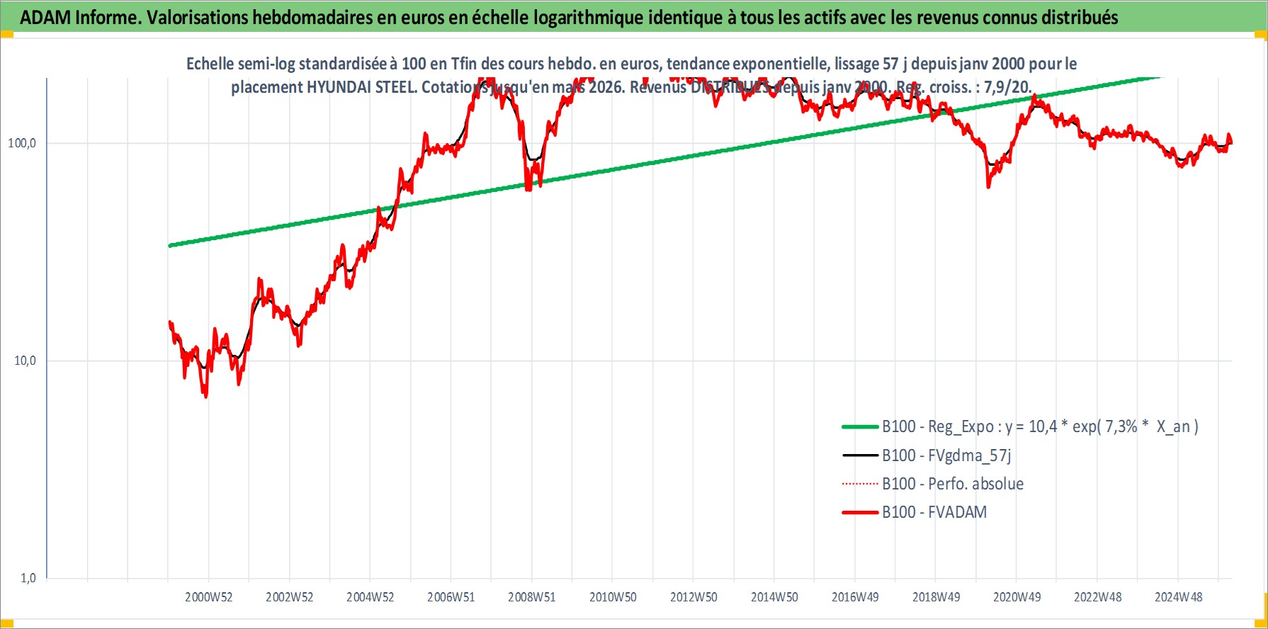 Site dédié aux investisseursPage dédiée sur site financeAnalyse des valorisations hebdomadaires de l'action HYUNDAI STEEL. Cet actif est cote en KRW. Les valorisations sont en contrevaleur EURO et couvrent les semaines 2000W02 a 2026W13. Les revenus de cet actif financier sont pris en compte depuis la semaine 2000W01. La note globale ESG de cet actif est estimee a 3.0 (apres rebasage entre 0 et 20).