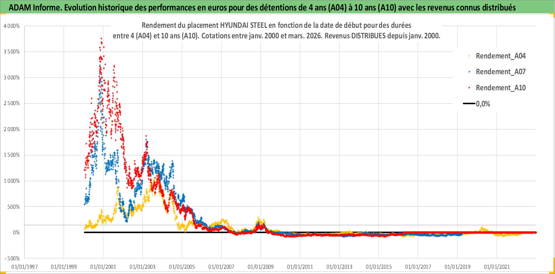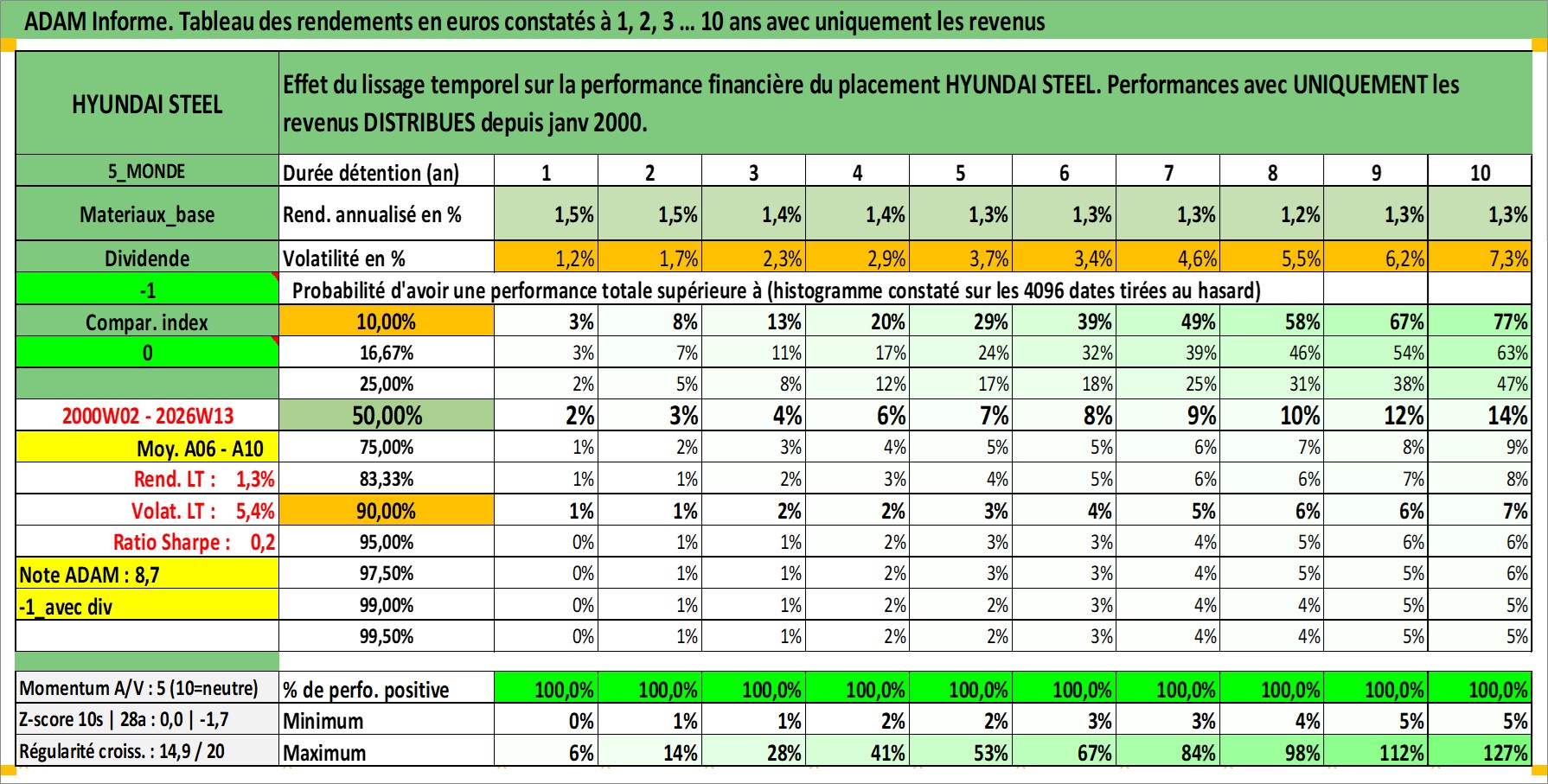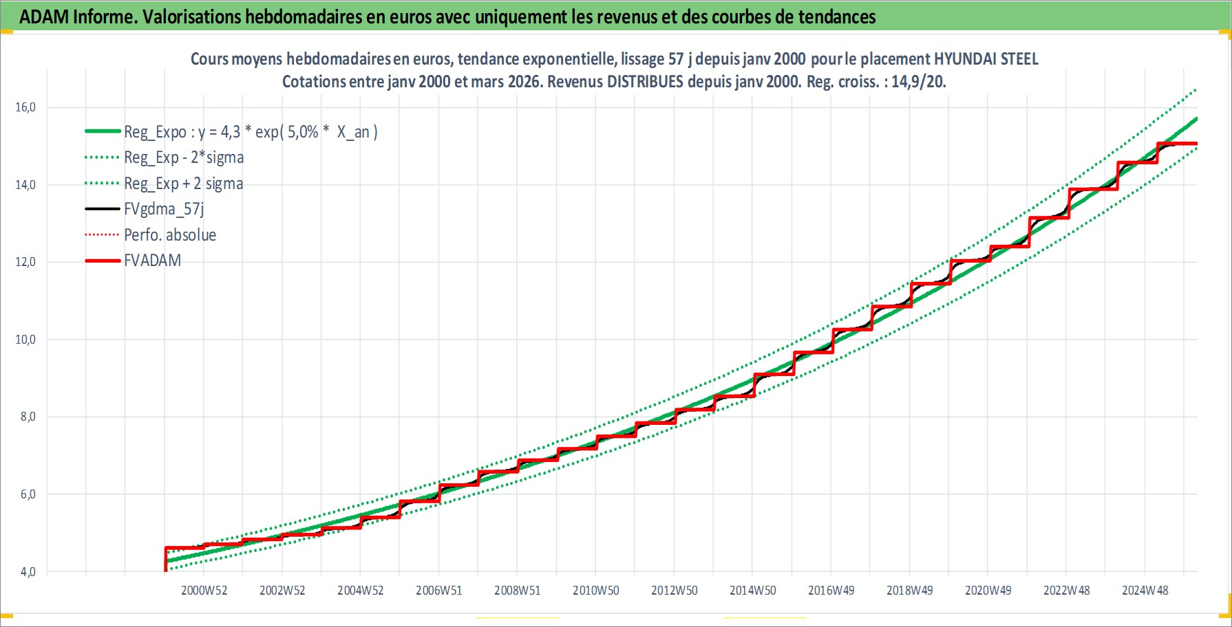 Site dédié aux investisseursPage dédiée sur site financeAnalyse des valorisations hebdomadaires de l'action HYUNDAI STEEL. Cet actif est cote en KRW. Les valorisations sont en contrevaleur EURO et couvrent les semaines 2000W02 a 2026W13. Les revenus de cet actif financier sont pris en compte depuis la semaine 2000W01. La note globale ESG de cet actif est estimee a 3.0 (apres rebasage entre 0 et 20).