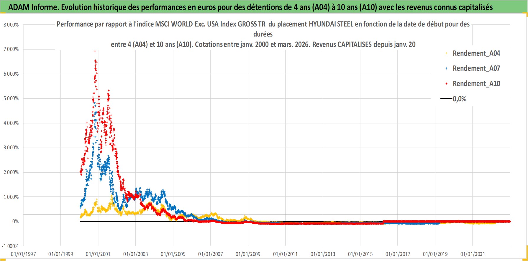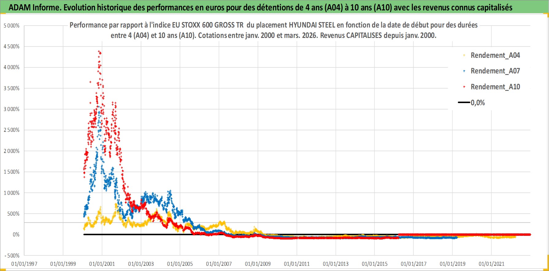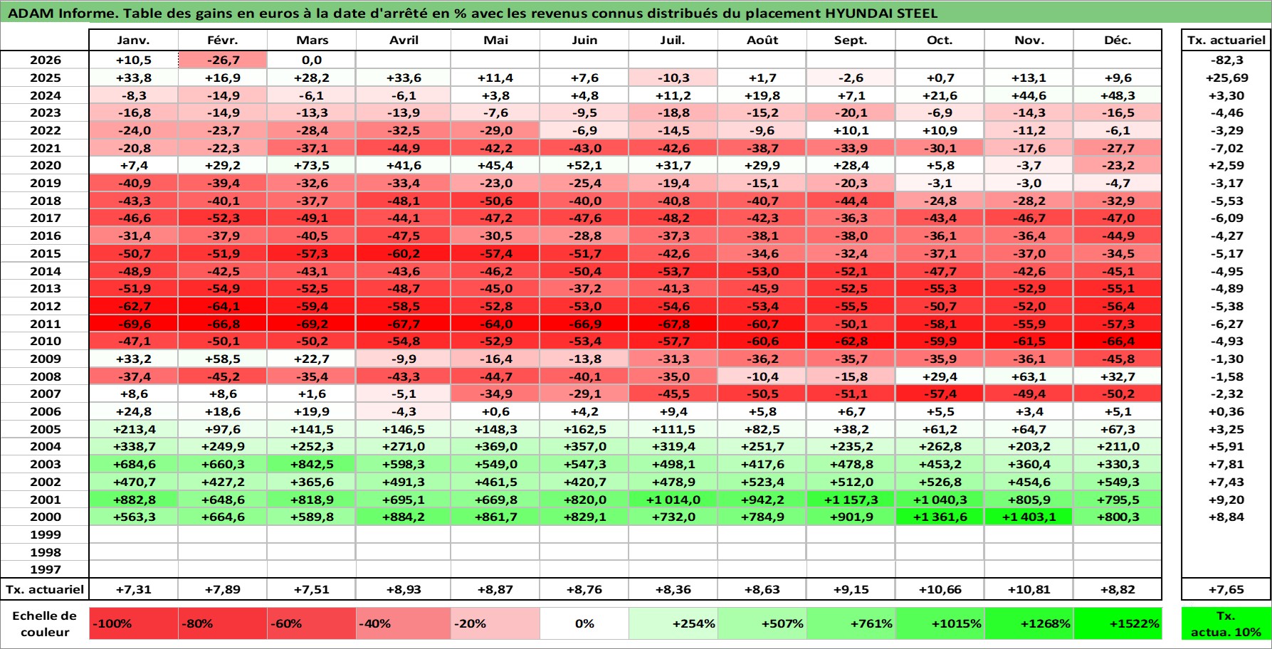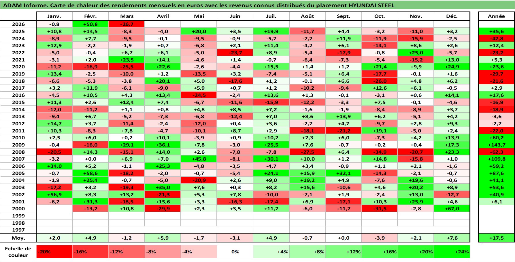 Site dédié aux investisseursPage dédiée sur site financeAnalyse des valorisations hebdomadaires de l'action HYUNDAI STEEL. Cet actif est cote en KRW. Les valorisations sont en contrevaleur EURO et couvrent les semaines 2000W02 a 2026W13. Les revenus de cet actif financier sont pris en compte depuis la semaine 2000W01. La note globale ESG de cet actif est estimee a 3.0 (apres rebasage entre 0 et 20).