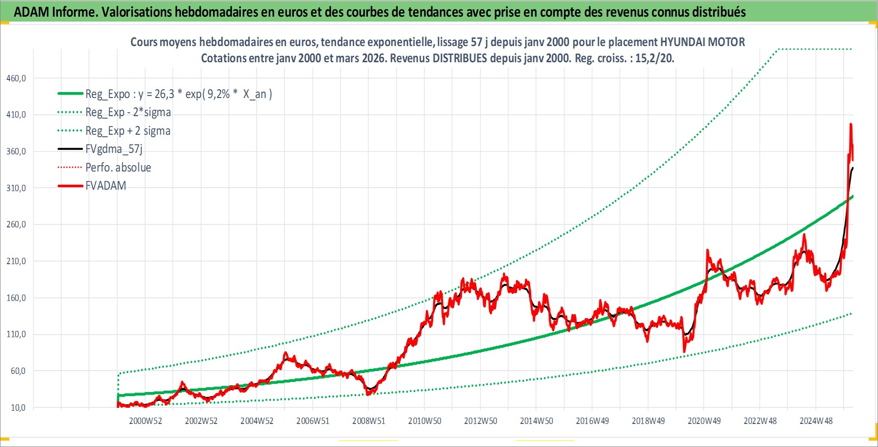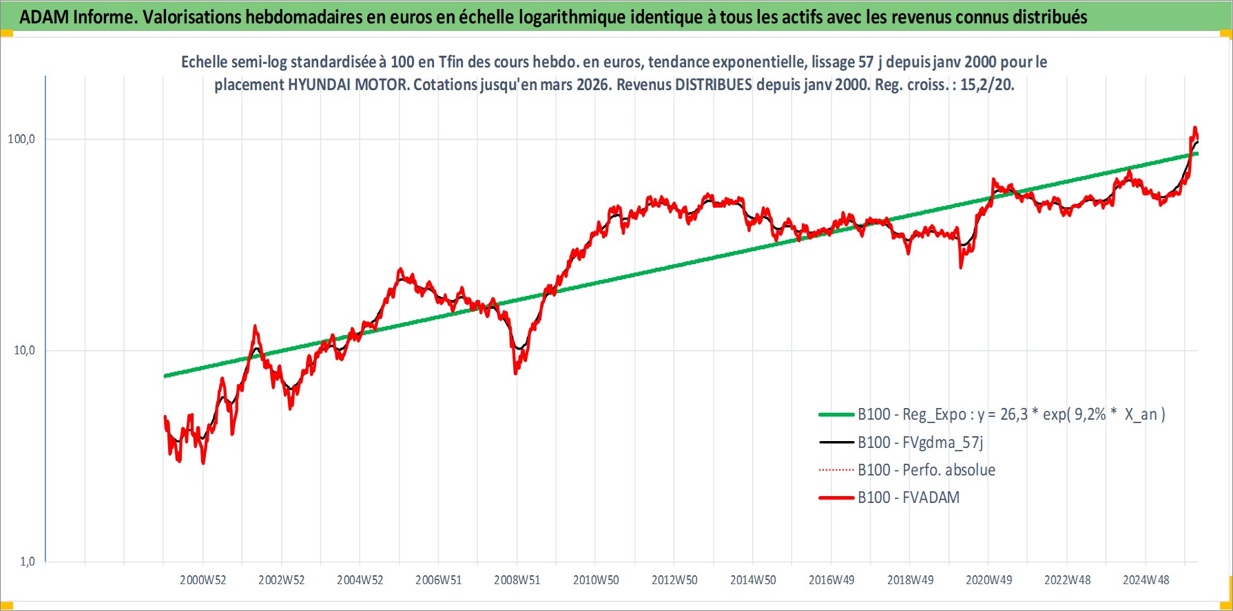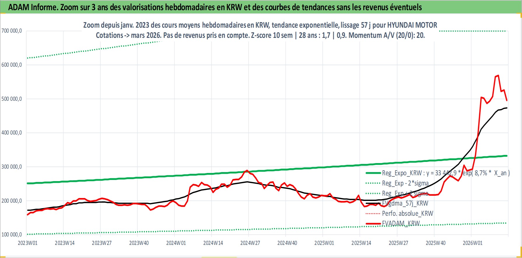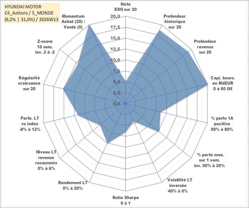 Site dédié aux investisseursPage dédiée sur site financeAnalyse des valorisations hebdomadaires de l'action HYUNDAI MOTOR. Cet actif est cote en KRW. Les valorisations sont en contrevaleur EURO et couvrent les semaines 2000W02 a 2026W13. Les revenus de cet actif financier sont pris en compte depuis la semaine 2000W01. La note globale ESG de cet actif est estimee a 5.0 (apres rebasage entre 0 et 20).