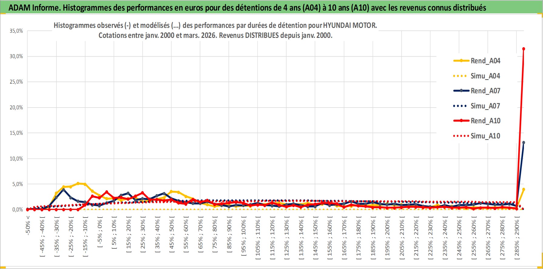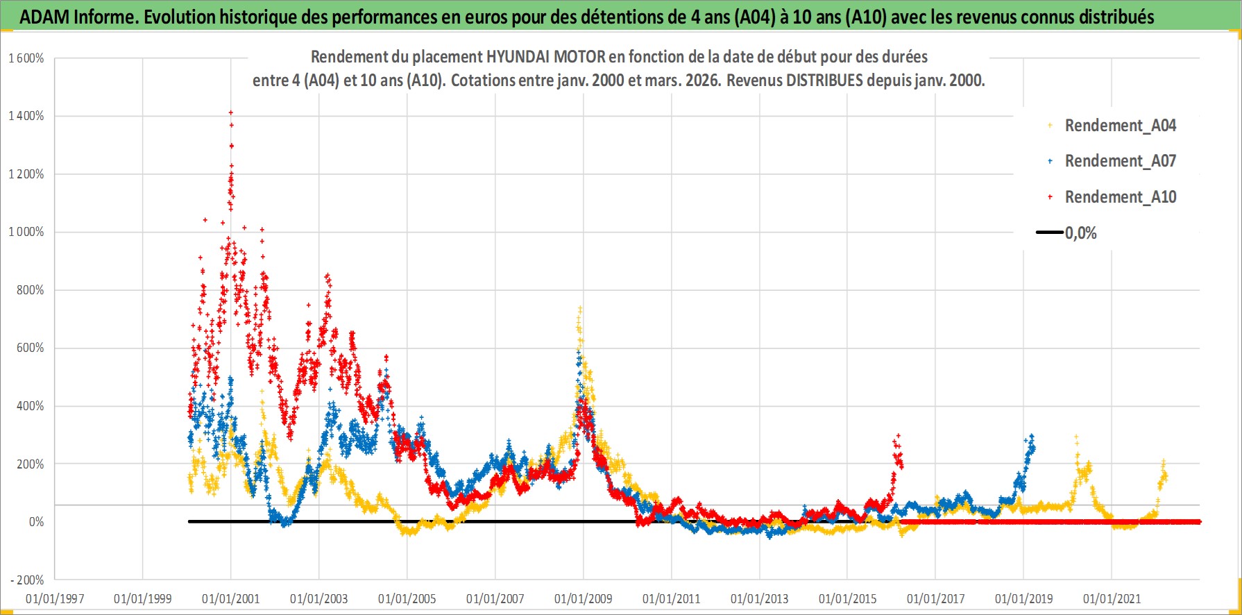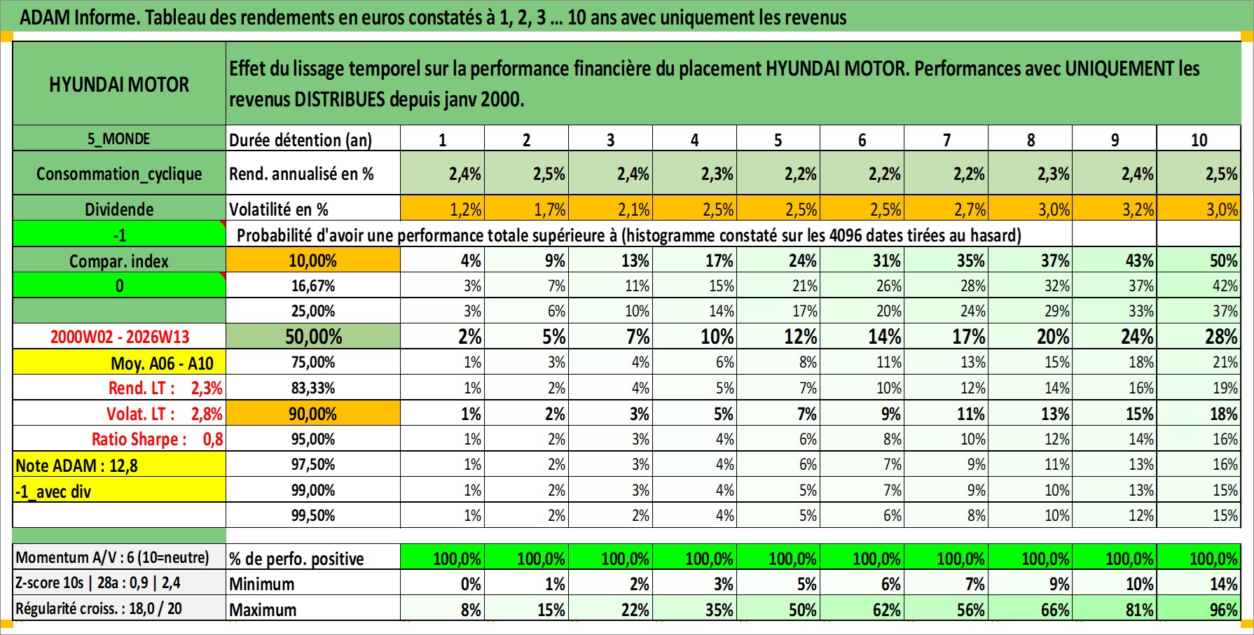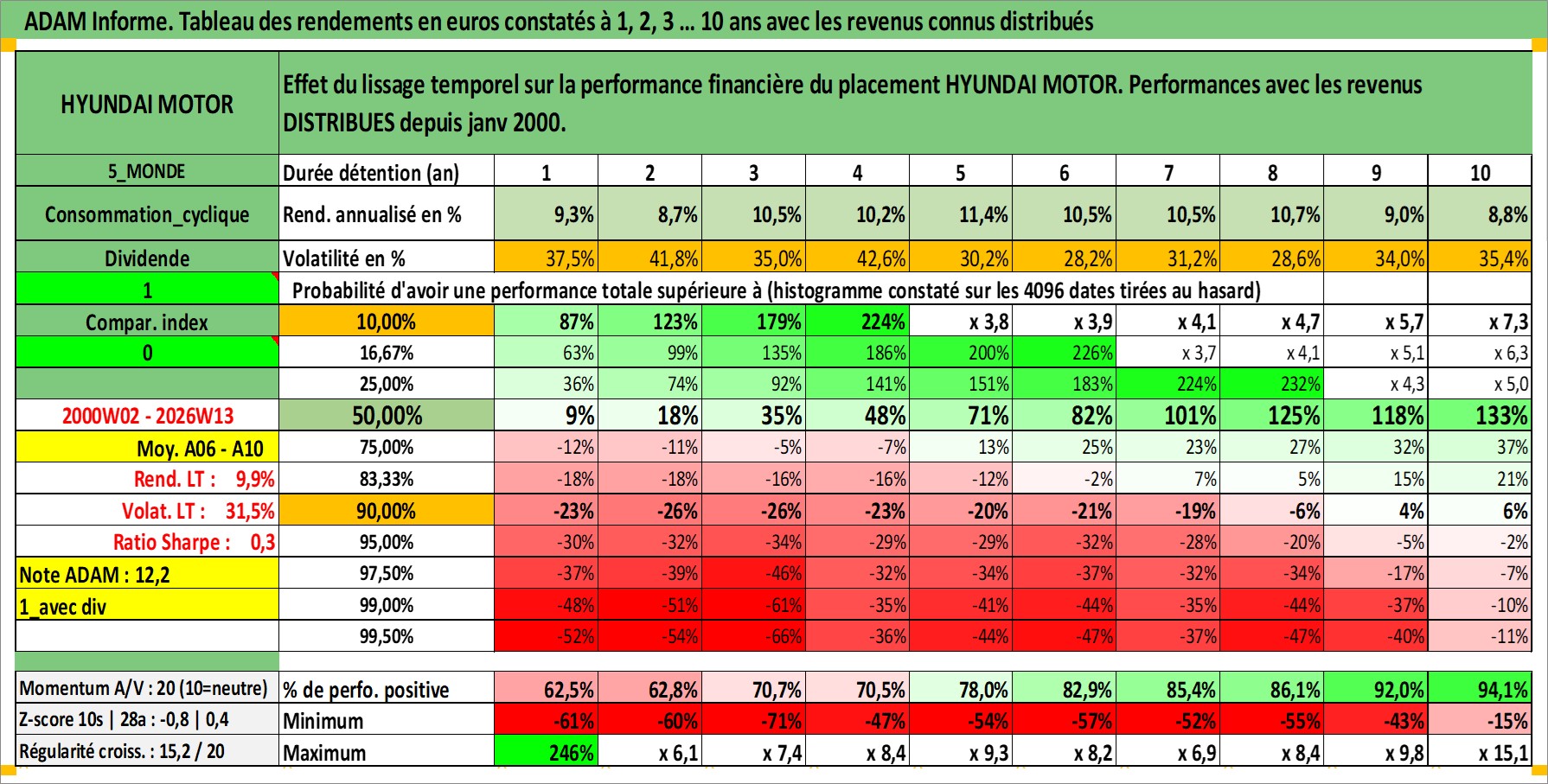 Site dédié aux investisseursPage dédiée sur site financeAnalyse des valorisations hebdomadaires de l'action HYUNDAI MOTOR. Cet actif est cote en KRW. Les valorisations sont en contrevaleur EURO et couvrent les semaines 2000W02 a 2026W13. Les revenus de cet actif financier sont pris en compte depuis la semaine 2000W01. La note globale ESG de cet actif est estimee a 5.0 (apres rebasage entre 0 et 20).