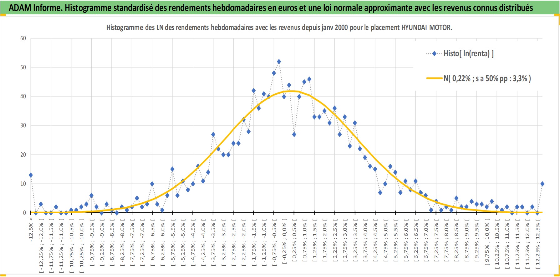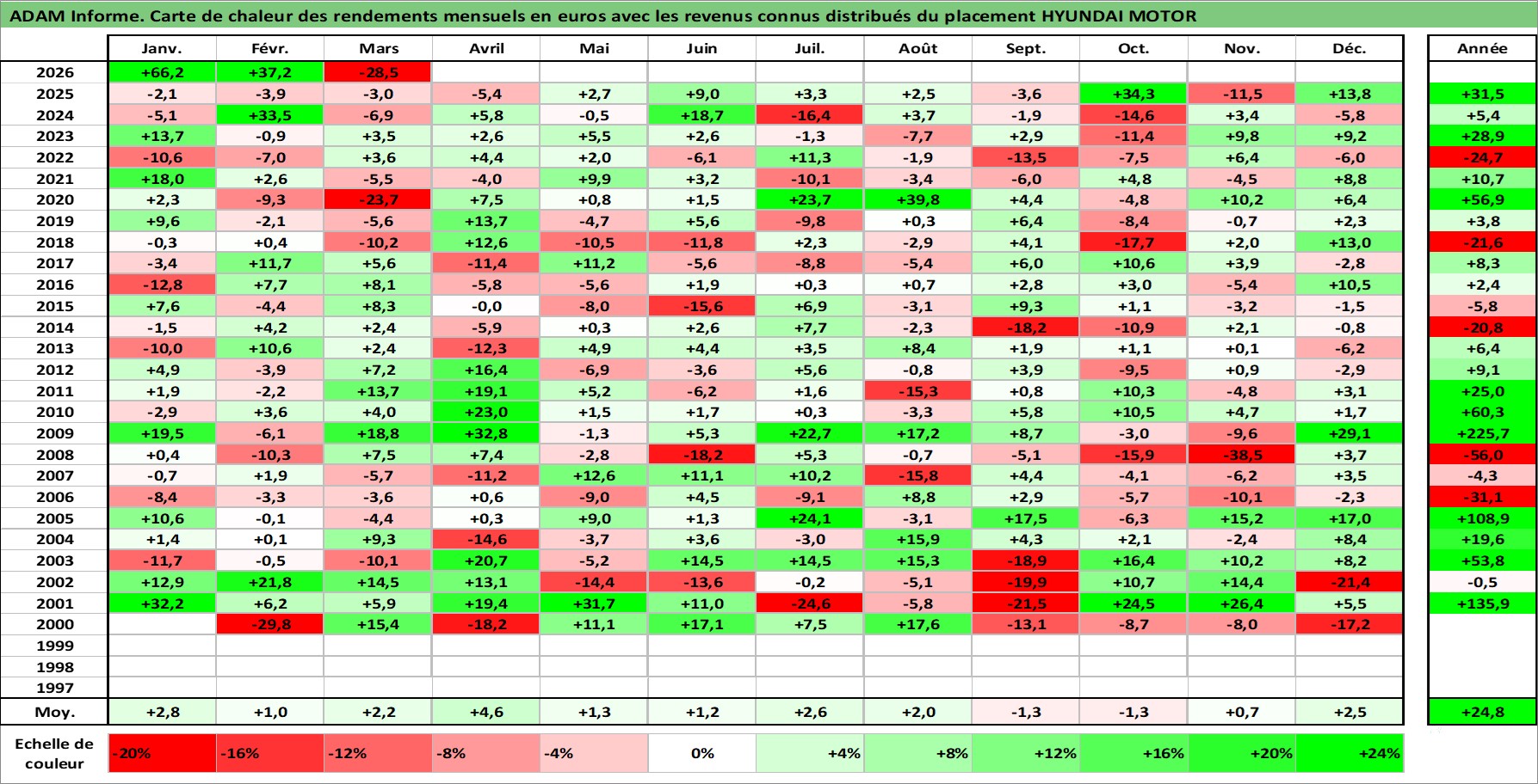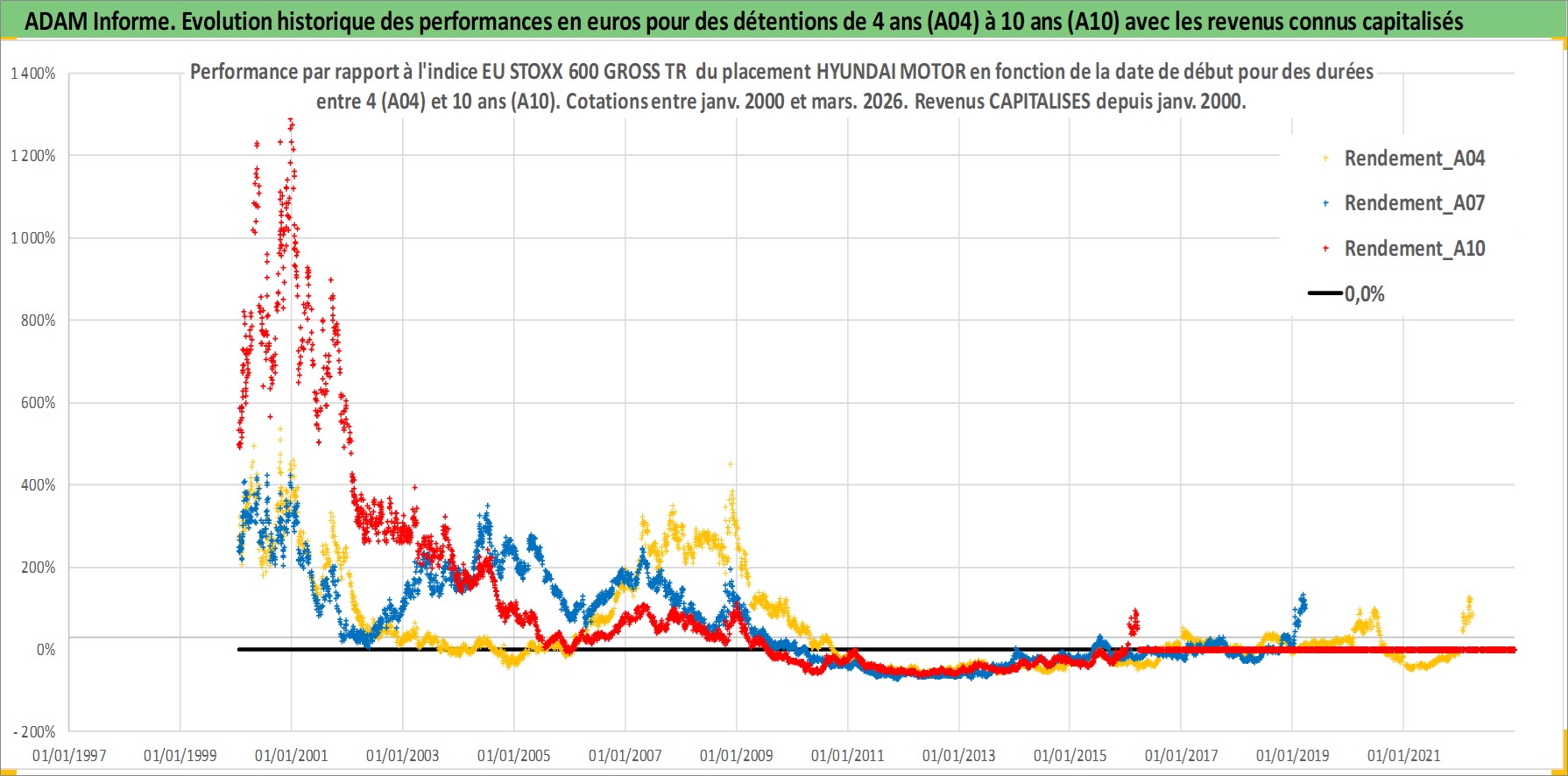 Site dédié aux investisseursPage dédiée sur site financeAnalyse des valorisations hebdomadaires de l'action HYUNDAI MOTOR. Cet actif est cote en KRW. Les valorisations sont en contrevaleur EURO et couvrent les semaines 2000W02 a 2026W13. Les revenus de cet actif financier sont pris en compte depuis la semaine 2000W01. La note globale ESG de cet actif est estimee a 5.0 (apres rebasage entre 0 et 20).