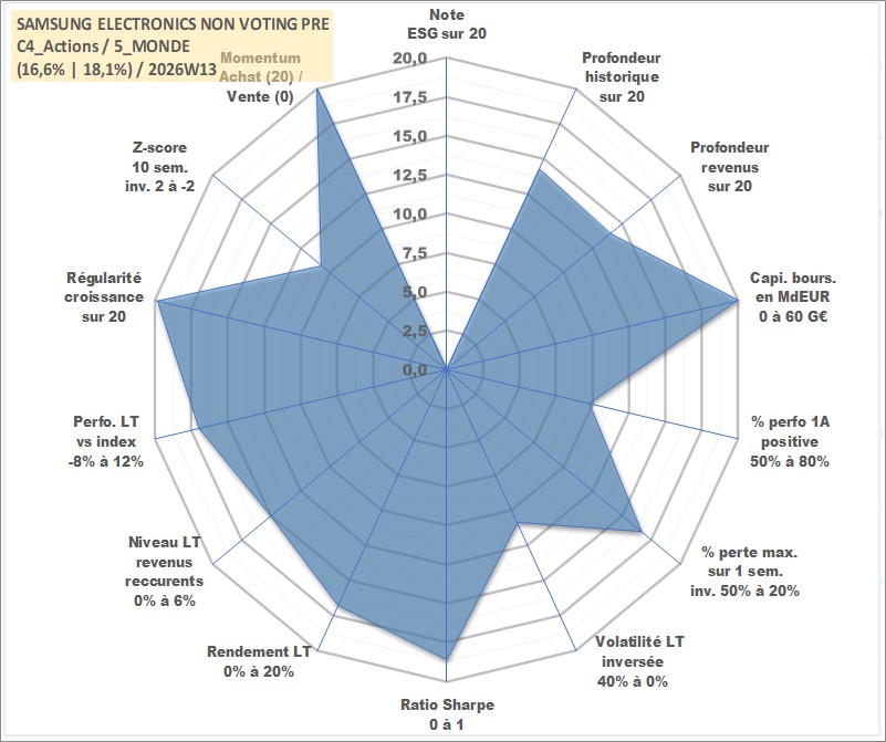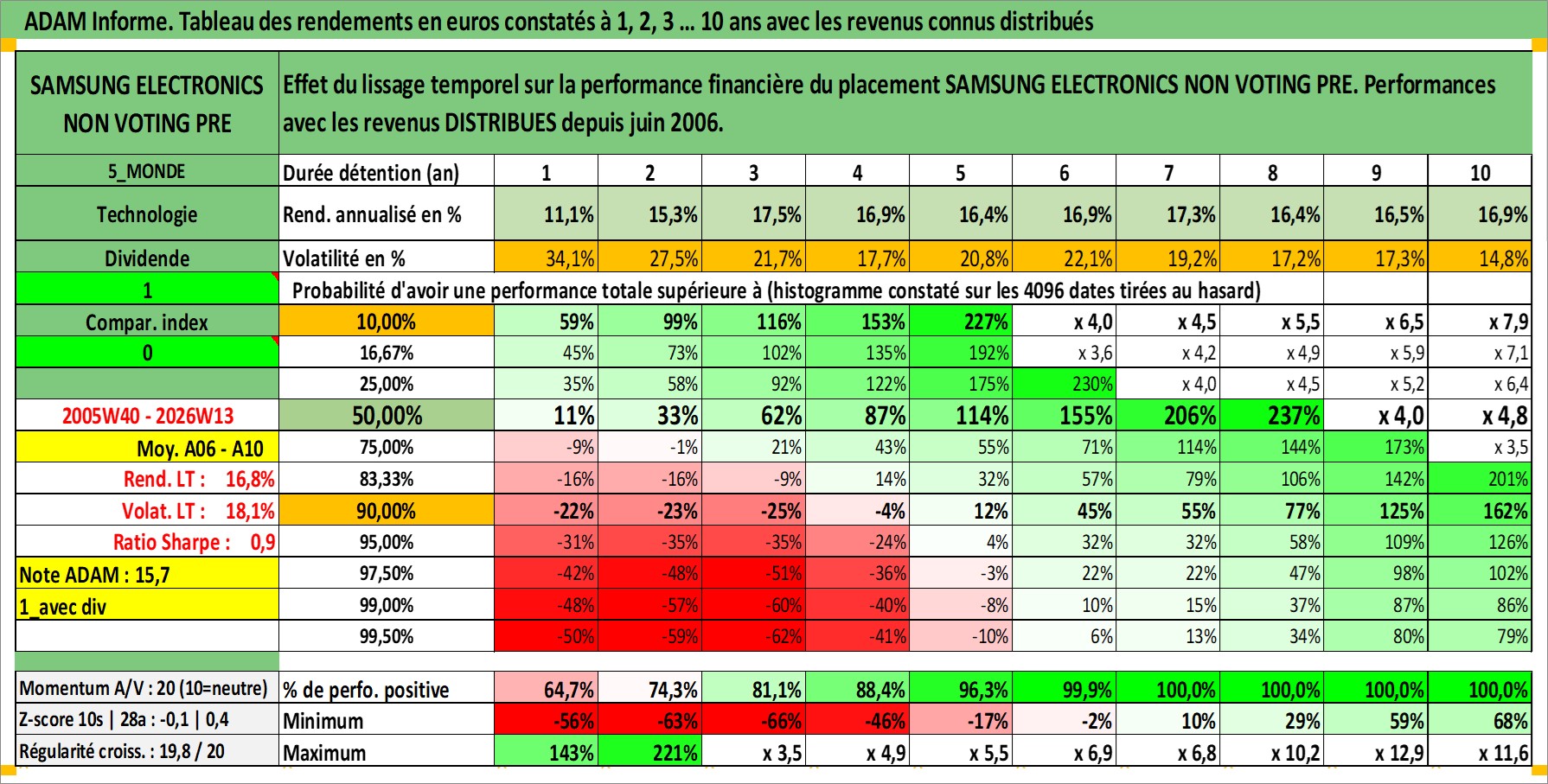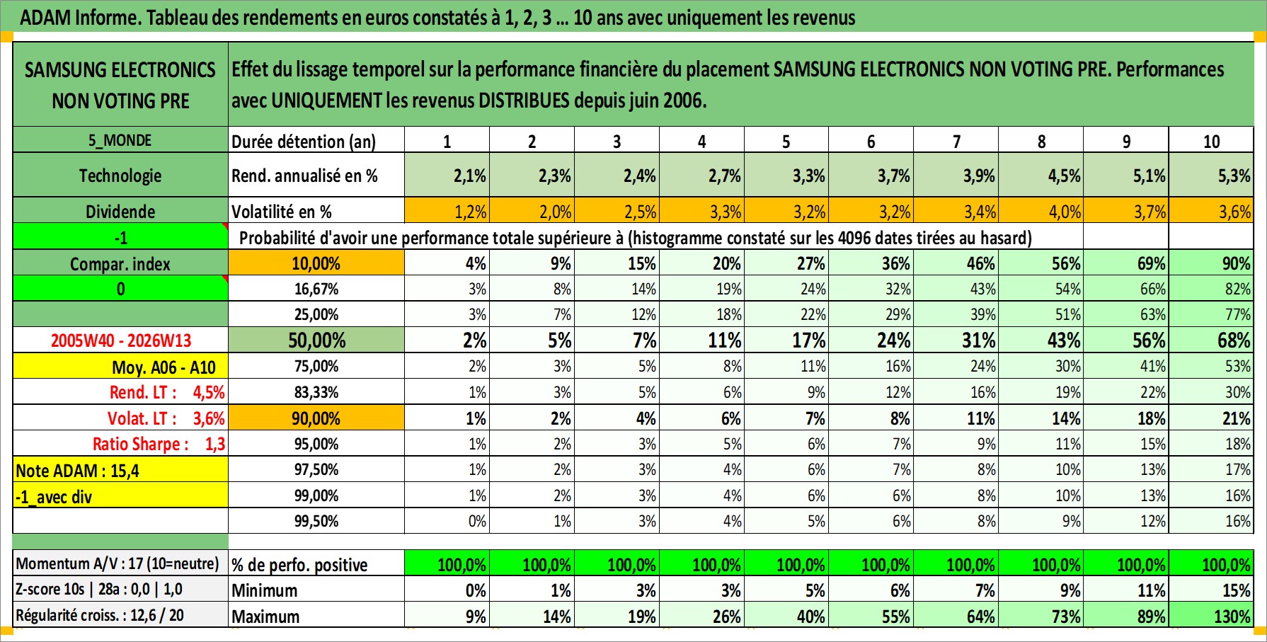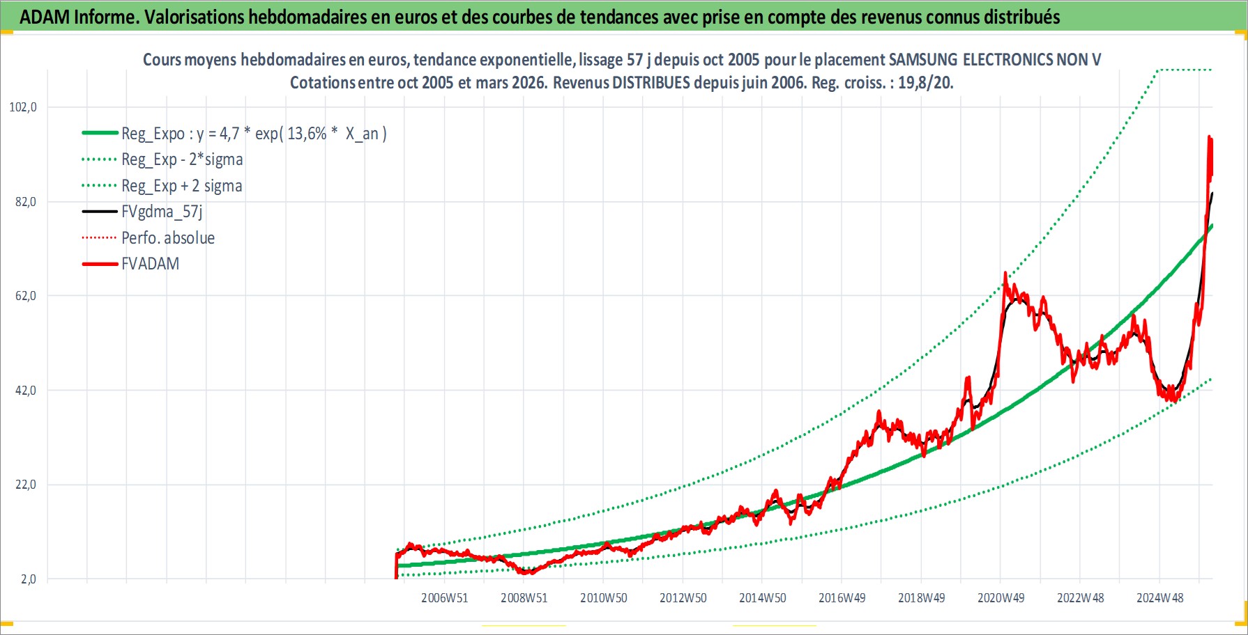 Site dédié aux investisseursPage dédiée sur site financeAnalyse des valorisations hebdomadaires de l'action SAMSUNG ELECTRONICS NON VOTING PRE. Cet actif est cote en KRW. Les valorisations sont en contrevaleur EURO et couvrent les semaines 2005W40 a 2026W13. Les revenus de cet actif financier sont pris en compte depuis la semaine 2006W26. La note ESG de cet actif n'est pas connue.