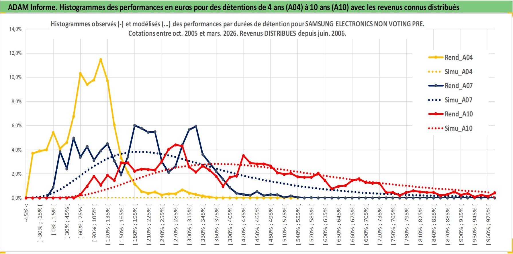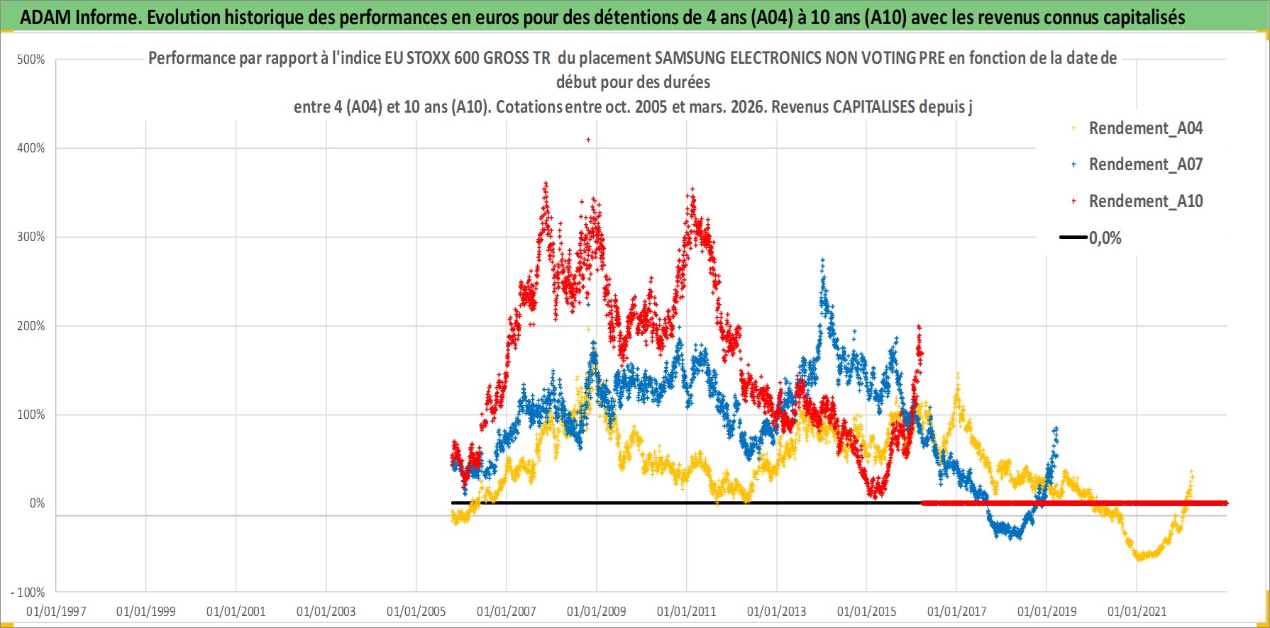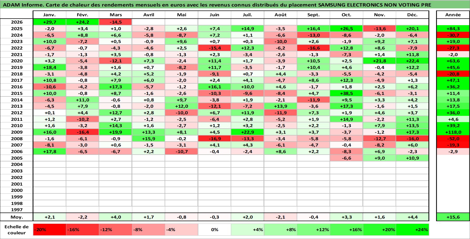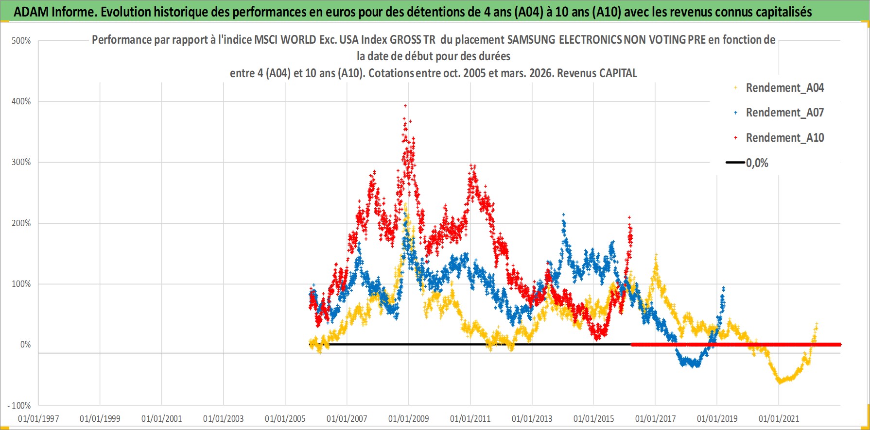 Site dédié aux investisseursPage dédiée sur site financeAnalyse des valorisations hebdomadaires de l'action SAMSUNG ELECTRONICS NON VOTING PRE. Cet actif est cote en KRW. Les valorisations sont en contrevaleur EURO et couvrent les semaines 2005W40 a 2026W13. Les revenus de cet actif financier sont pris en compte depuis la semaine 2006W26. La note ESG de cet actif n'est pas connue.