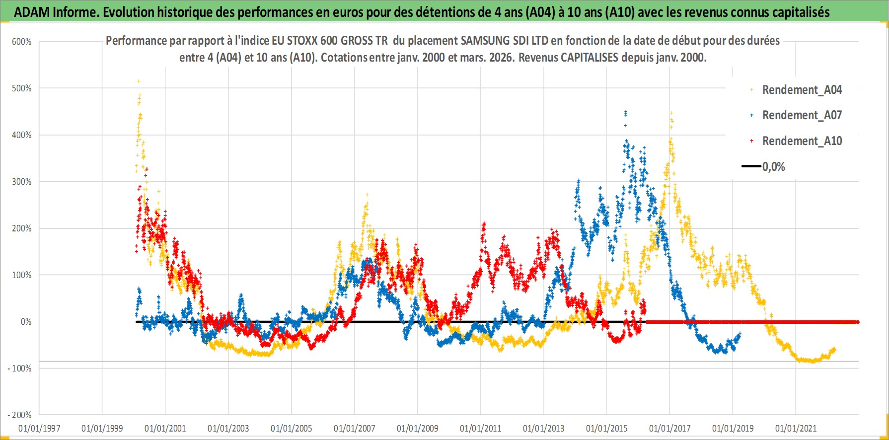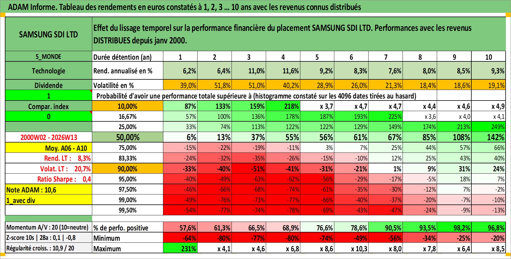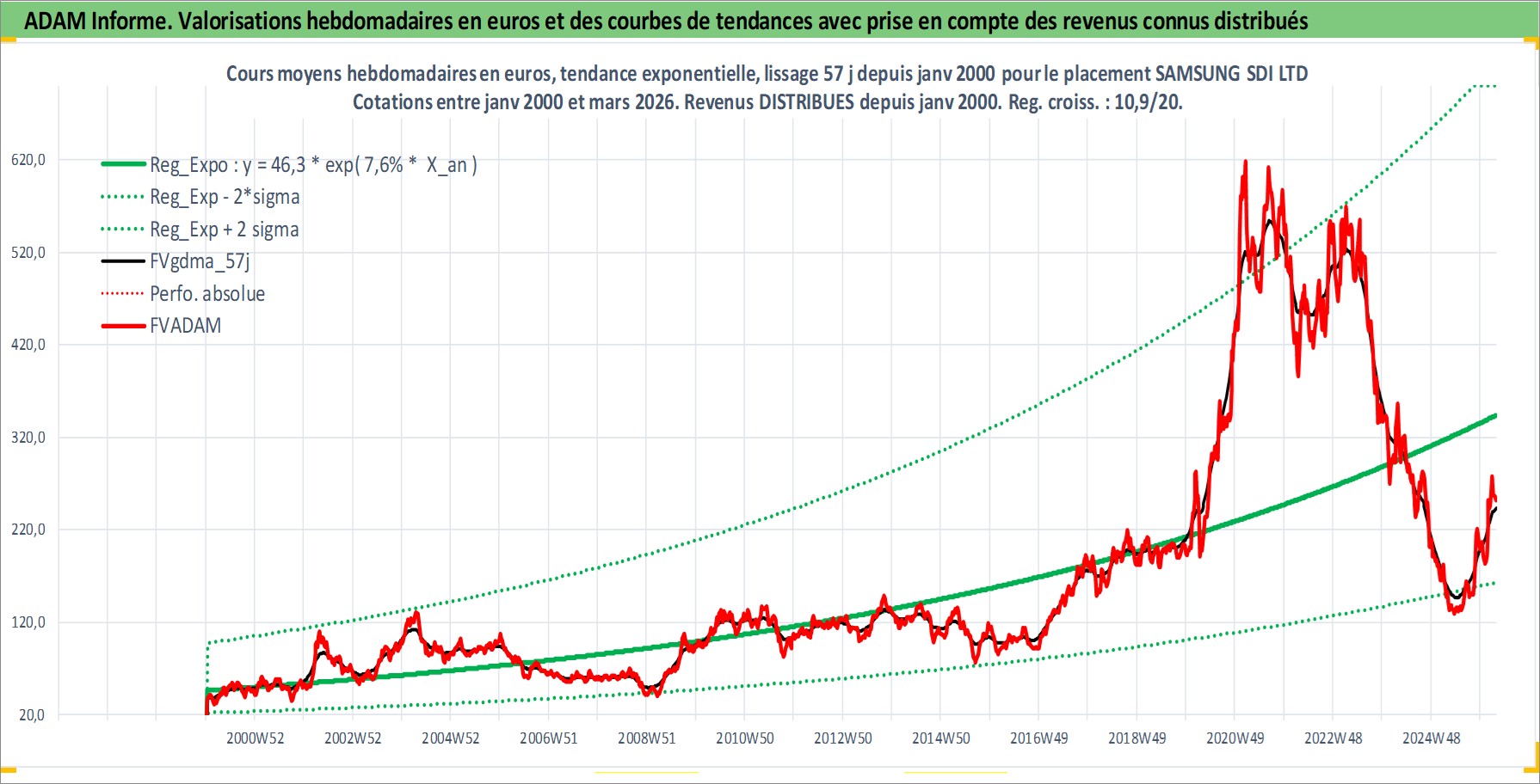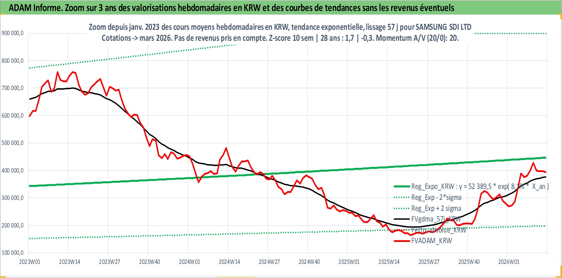 Site dédié aux investisseursPage dédiée sur site financeAnalyse des valorisations hebdomadaires de l'action SAMSUNG SDI LTD. Cet actif est cote en KRW. Les valorisations sont en contrevaleur EURO et couvrent les semaines 2000W02 a 2026W13. Les revenus de cet actif financier sont pris en compte depuis la semaine 2000W01. La note globale ESG de cet actif est estimee a 10.0 (apres rebasage entre 0 et 20).