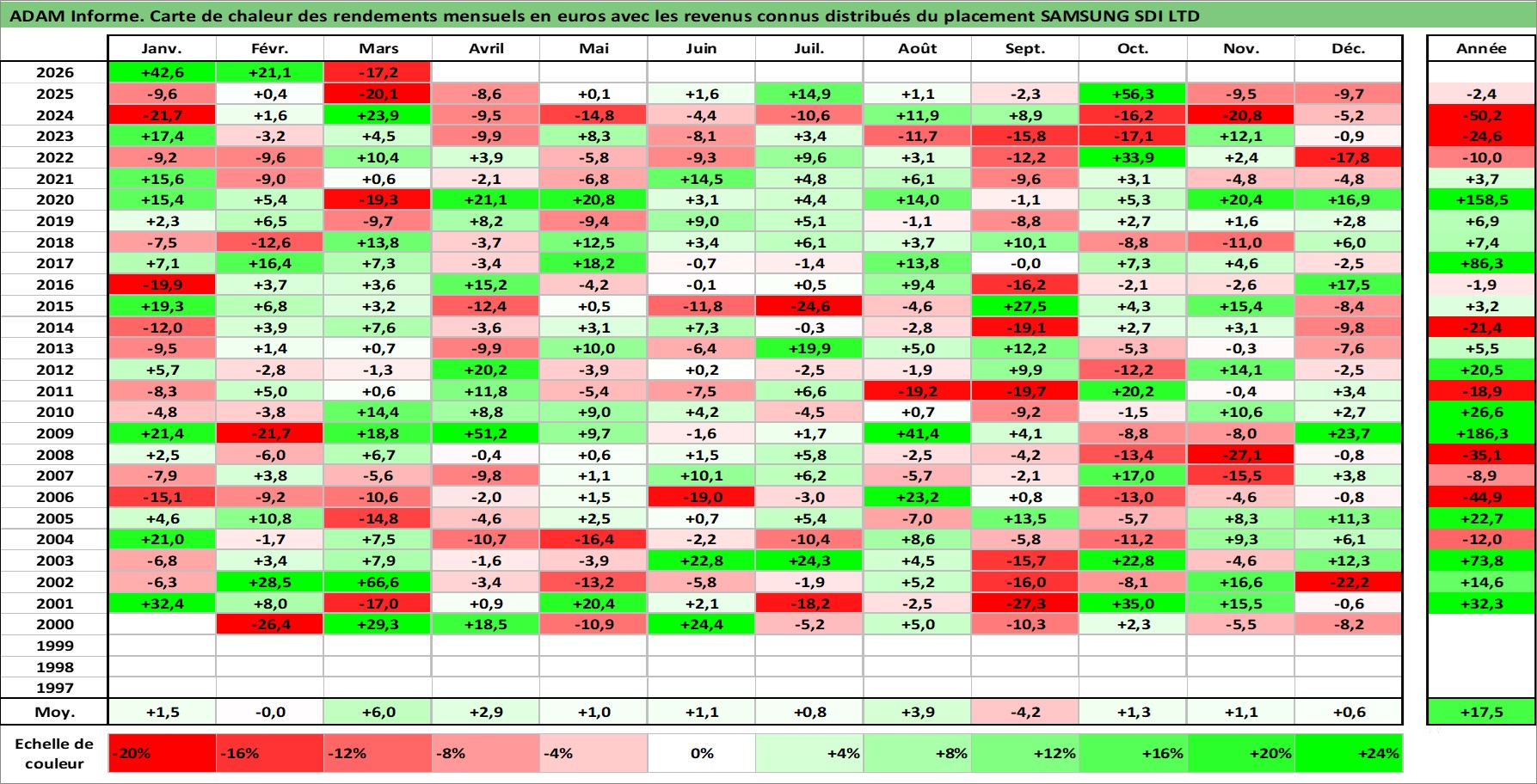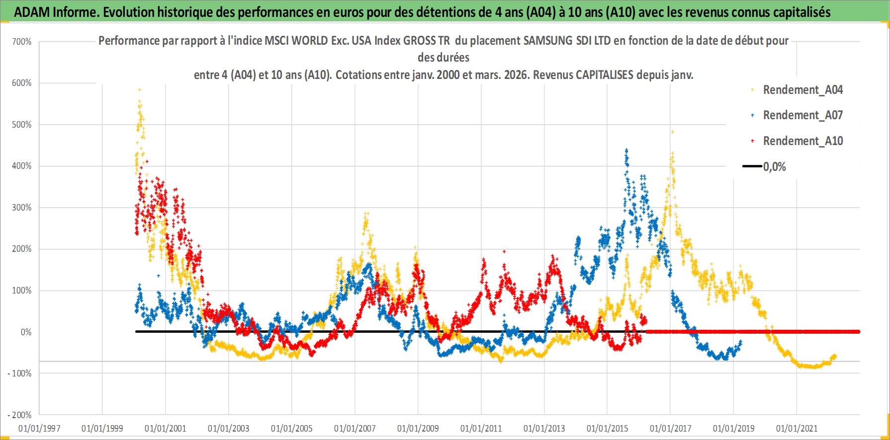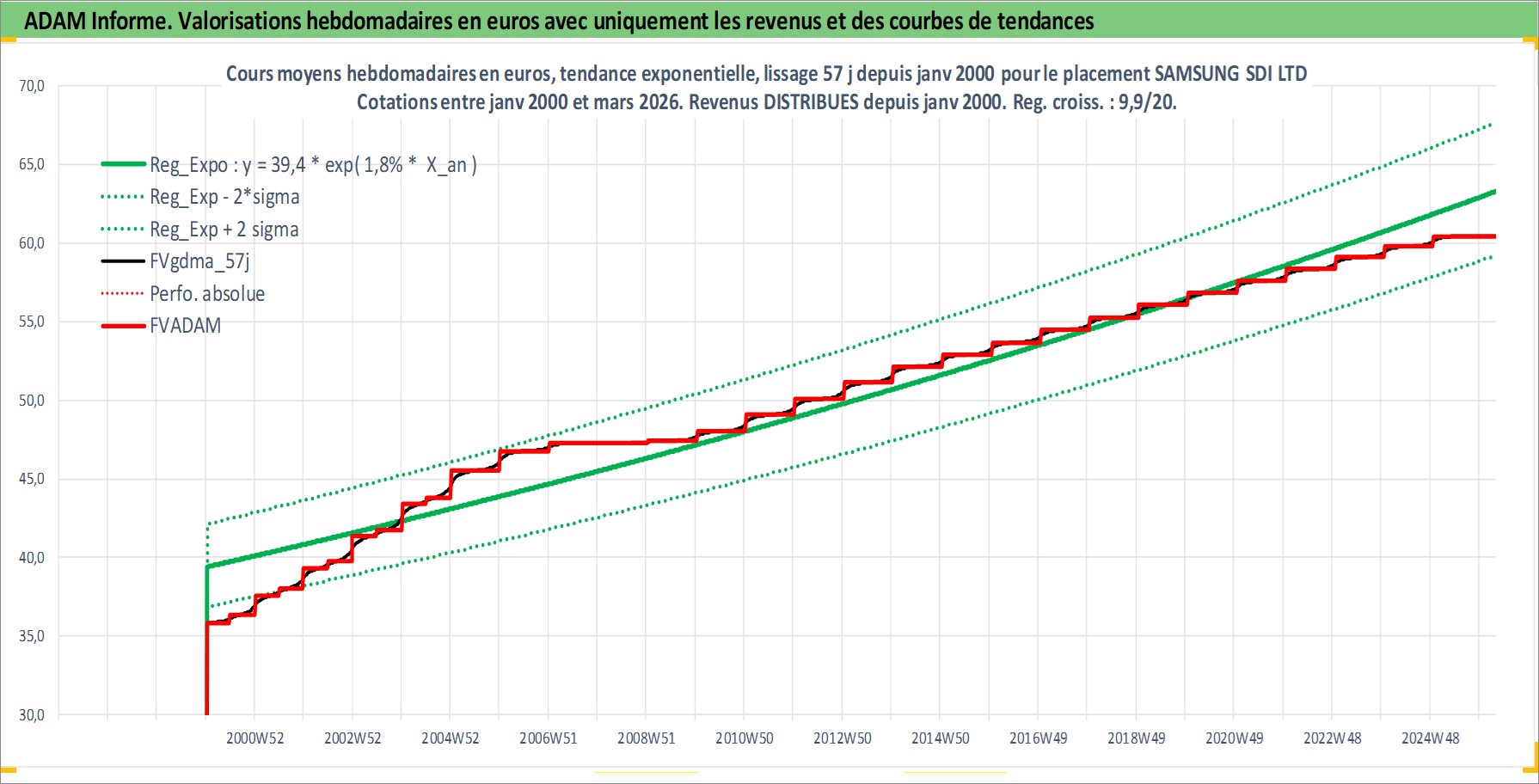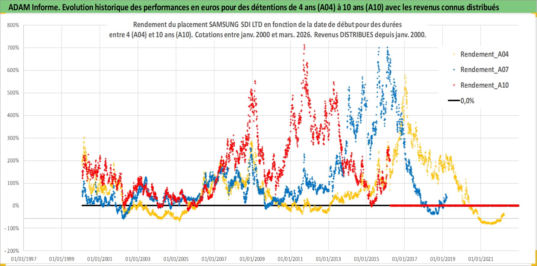 Site dédié aux investisseursPage dédiée sur site financeAnalyse des valorisations hebdomadaires de l'action SAMSUNG SDI LTD. Cet actif est cote en KRW. Les valorisations sont en contrevaleur EURO et couvrent les semaines 2000W02 a 2026W13. Les revenus de cet actif financier sont pris en compte depuis la semaine 2000W01. La note globale ESG de cet actif est estimee a 10.0 (apres rebasage entre 0 et 20).