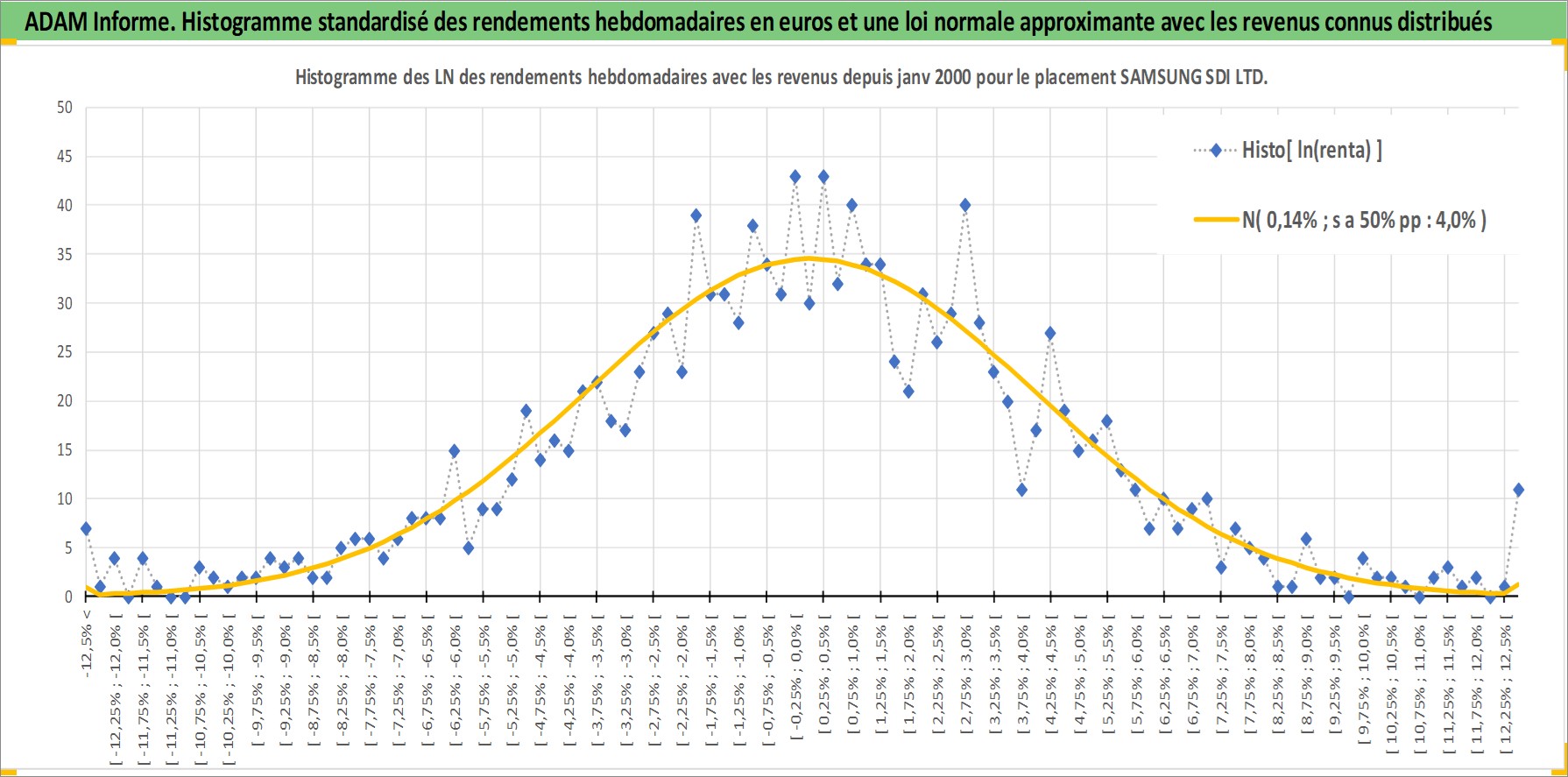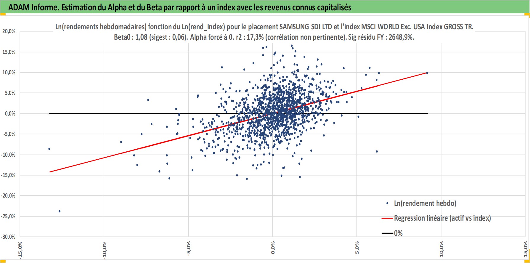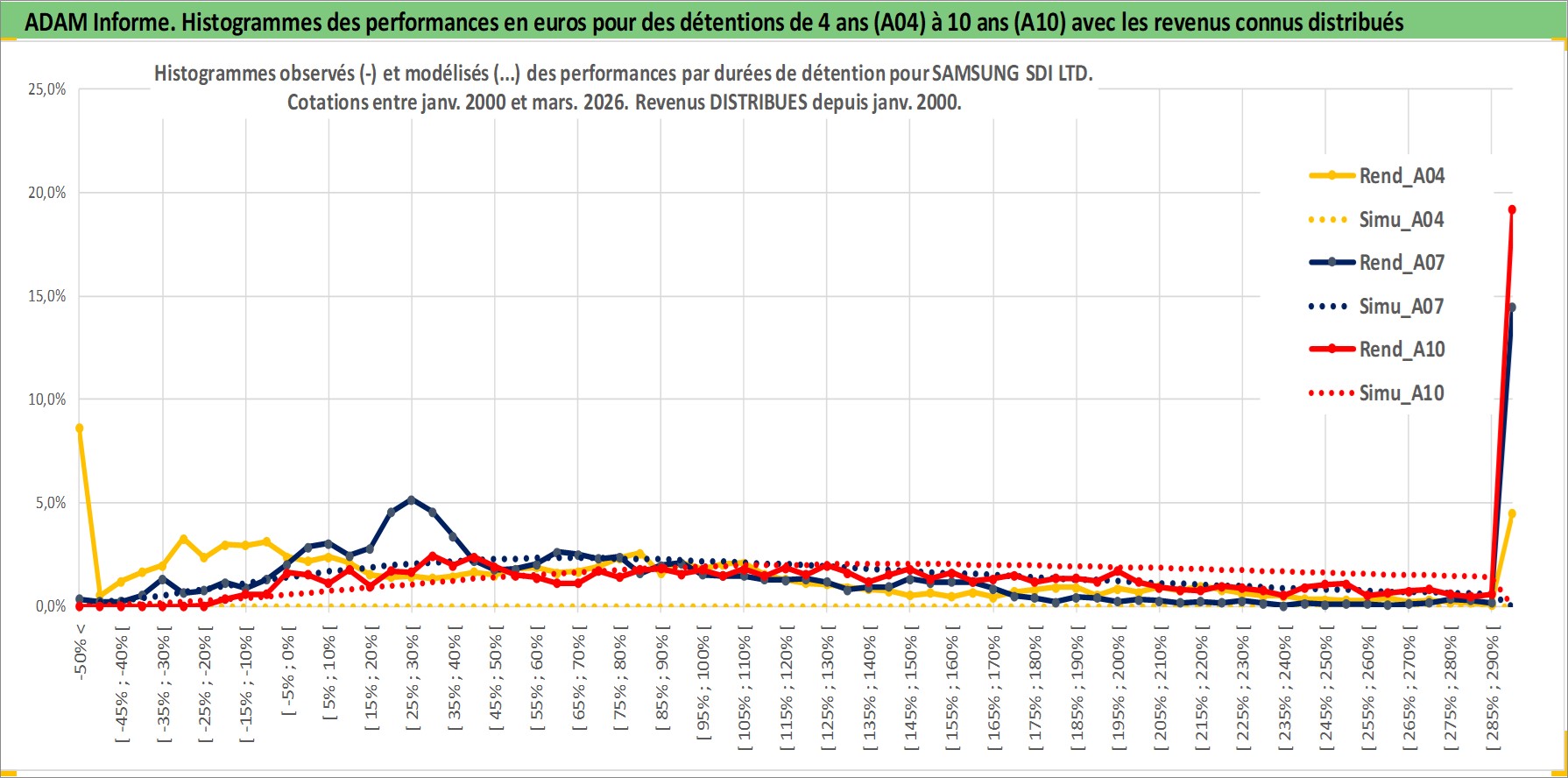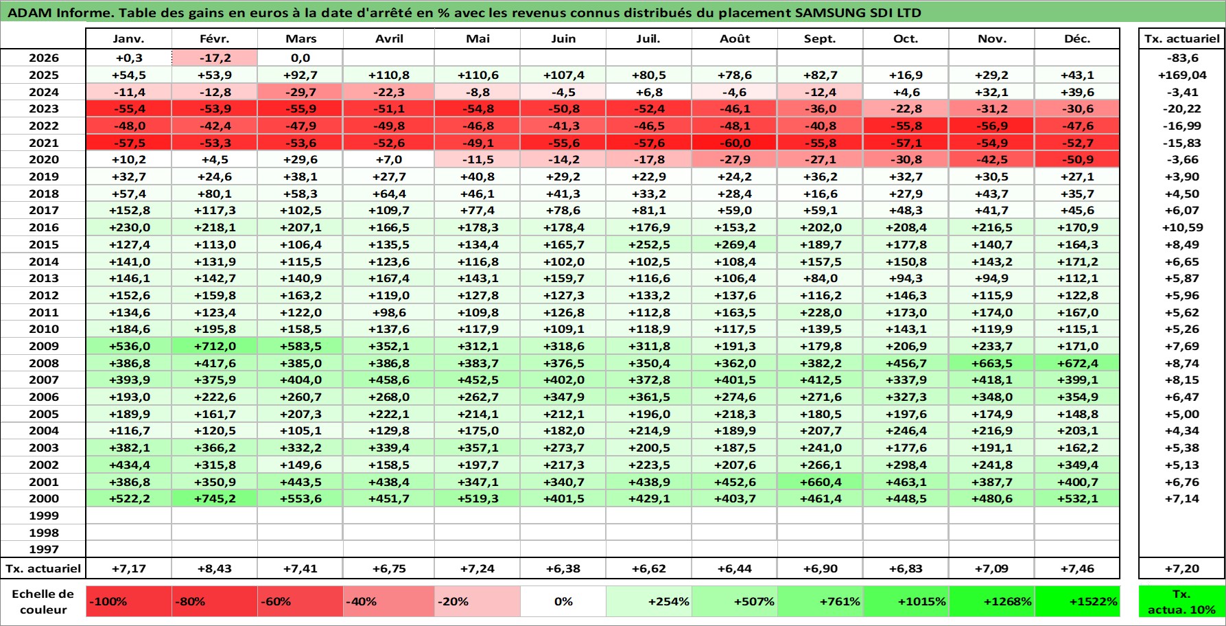 Site dédié aux investisseursPage dédiée sur site financeAnalyse des valorisations hebdomadaires de l'action SAMSUNG SDI LTD. Cet actif est cote en KRW. Les valorisations sont en contrevaleur EURO et couvrent les semaines 2000W02 a 2026W13. Les revenus de cet actif financier sont pris en compte depuis la semaine 2000W01. La note globale ESG de cet actif est estimee a 10.0 (apres rebasage entre 0 et 20).
