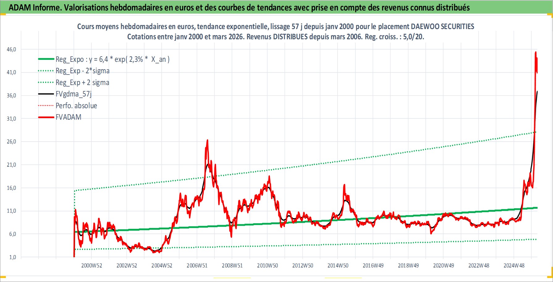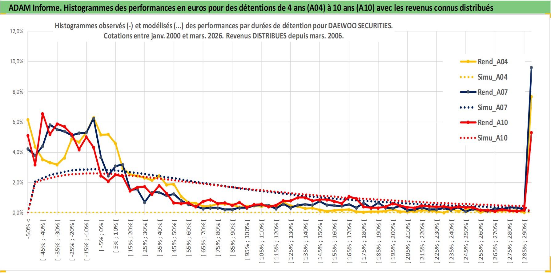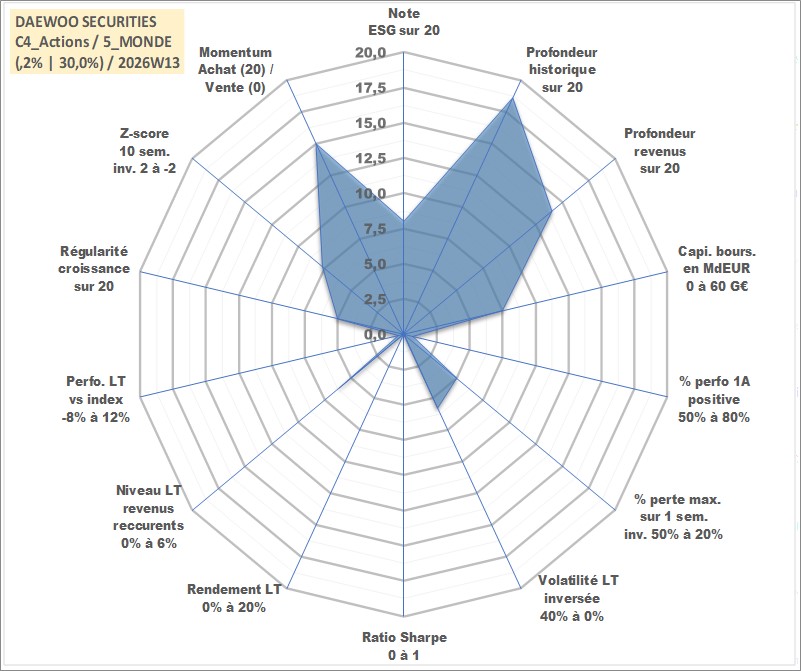 Site dédié aux investisseursPage dédiée sur site financeAnalyse des valorisations hebdomadaires de l'action DAEWOO SECURITIES. Cet actif est cote en KRW. Les valorisations sont en contrevaleur EURO et couvrent les semaines 2000W02 a 2026W13. Les revenus de cet actif financier sont pris en compte depuis la semaine 2006W13. La note globale ESG de cet actif est estimee a 8.0 (apres rebasage entre 0 et 20).