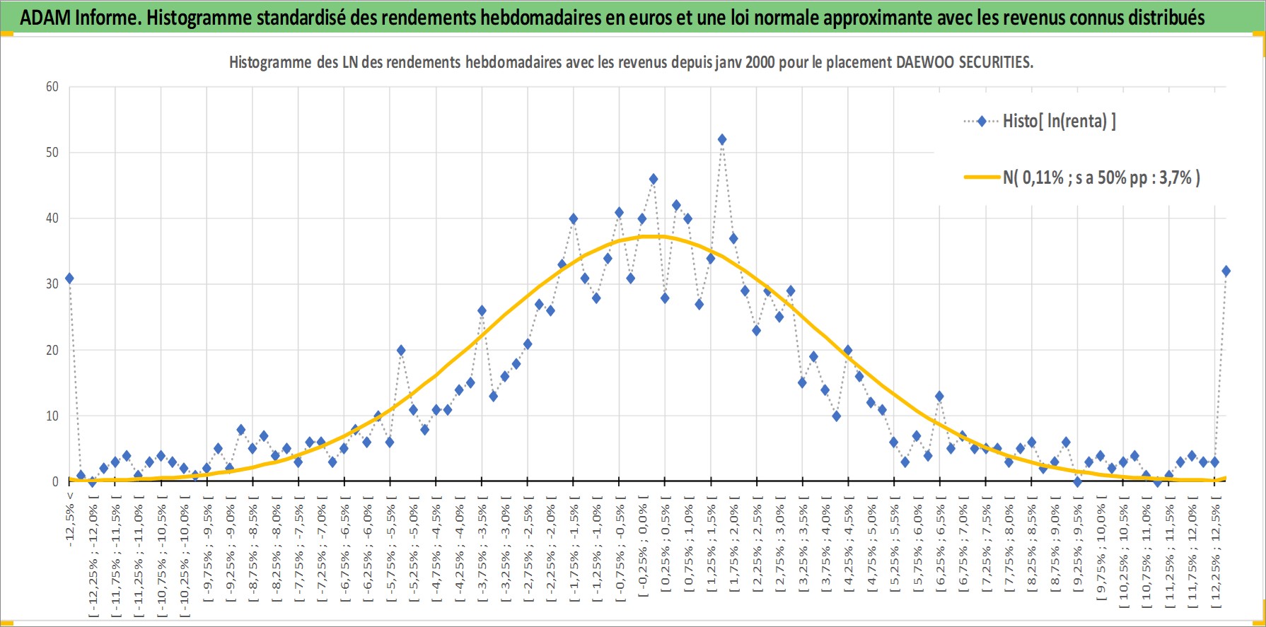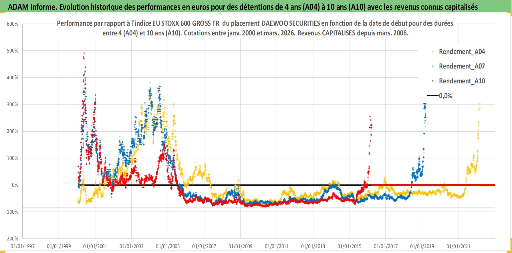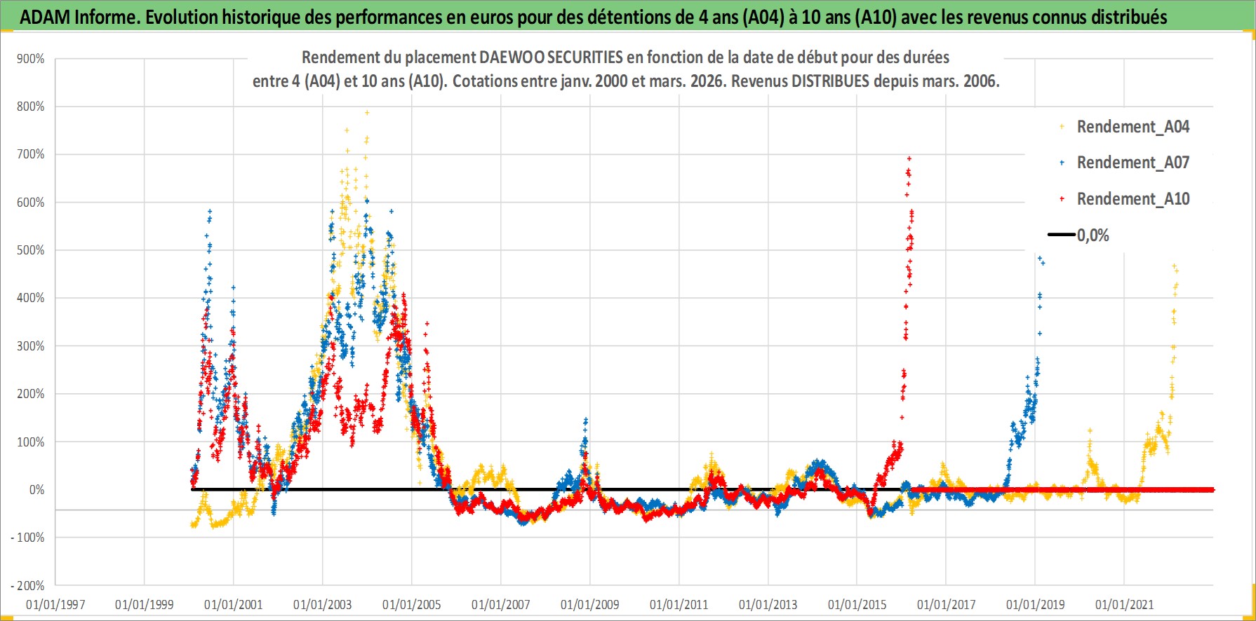 Site dédié aux investisseursPage dédiée sur site financeAnalyse des valorisations hebdomadaires de l'action DAEWOO SECURITIES. Cet actif est cote en KRW. Les valorisations sont en contrevaleur EURO et couvrent les semaines 2000W02 a 2026W13. Les revenus de cet actif financier sont pris en compte depuis la semaine 2006W13. La note globale ESG de cet actif est estimee a 8.0 (apres rebasage entre 0 et 20).