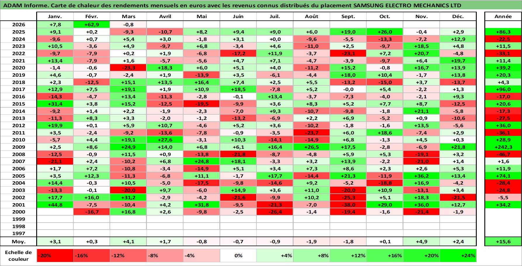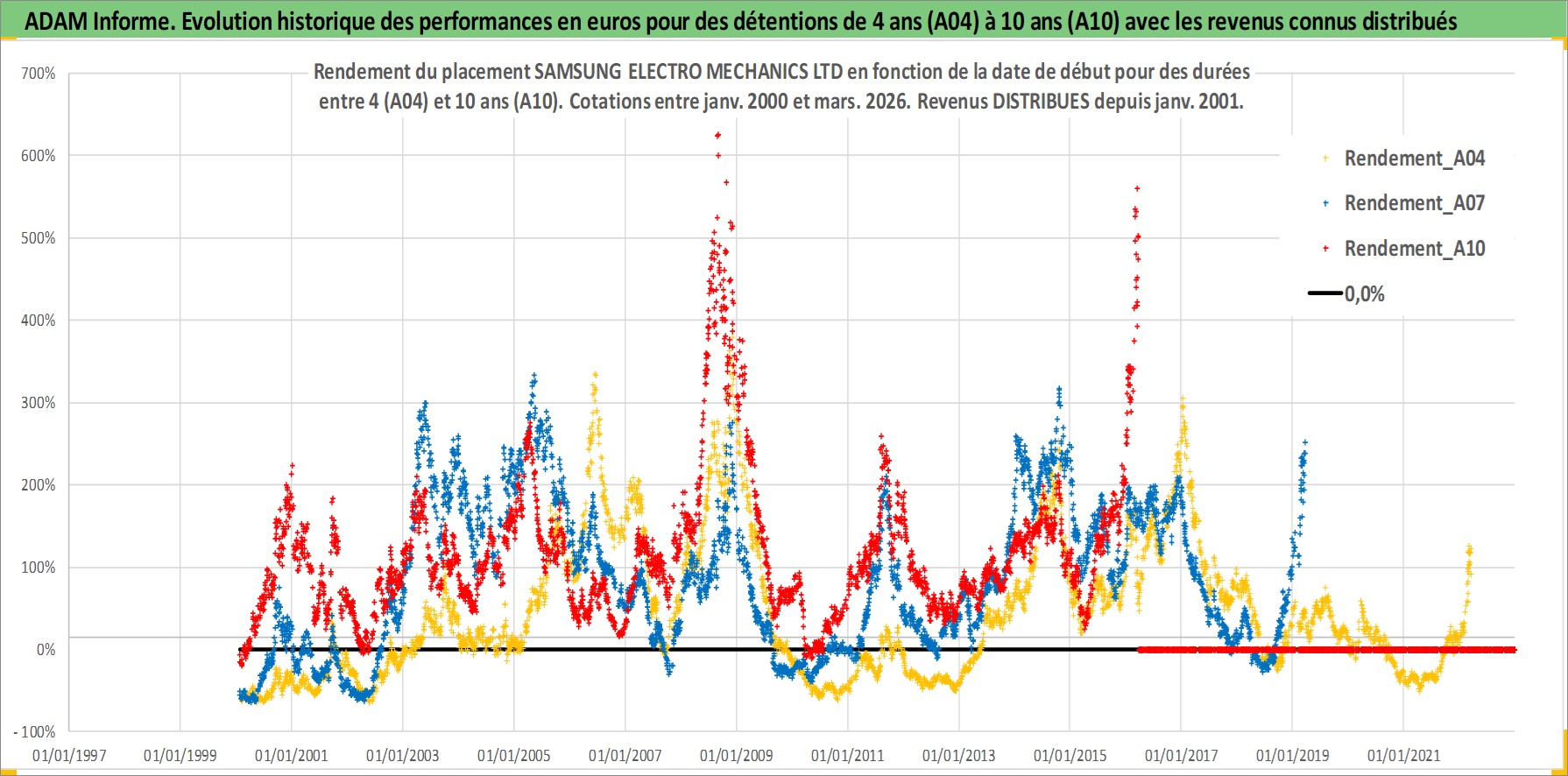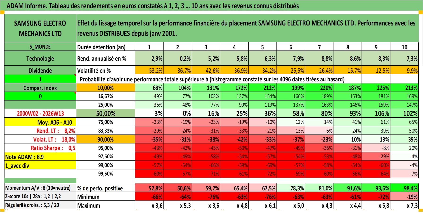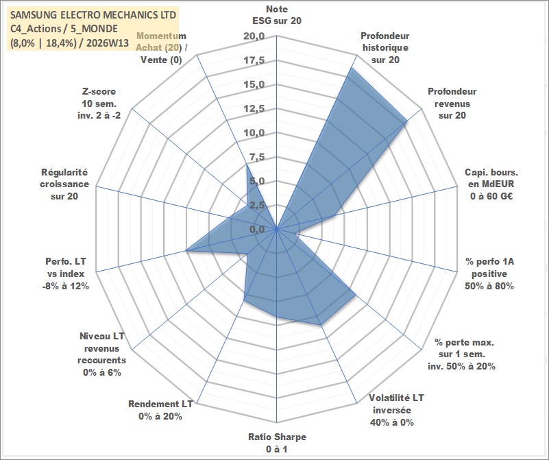 Site dédié aux investisseursPage dédiée sur site financeAnalyse des valorisations hebdomadaires de l'action SAMSUNG ELECTRO MECHANICS LTD. Cet actif est cote en KRW. Les valorisations sont en contrevaleur EURO et couvrent les semaines 2000W02 a 2026W13. Les revenus de cet actif financier sont pris en compte depuis la semaine 2001W01. La note ESG de cet actif n'est pas connue.