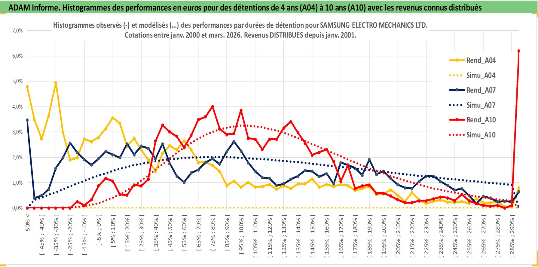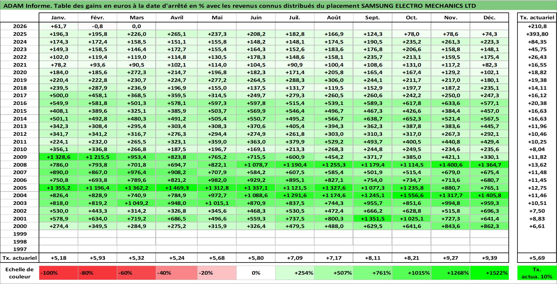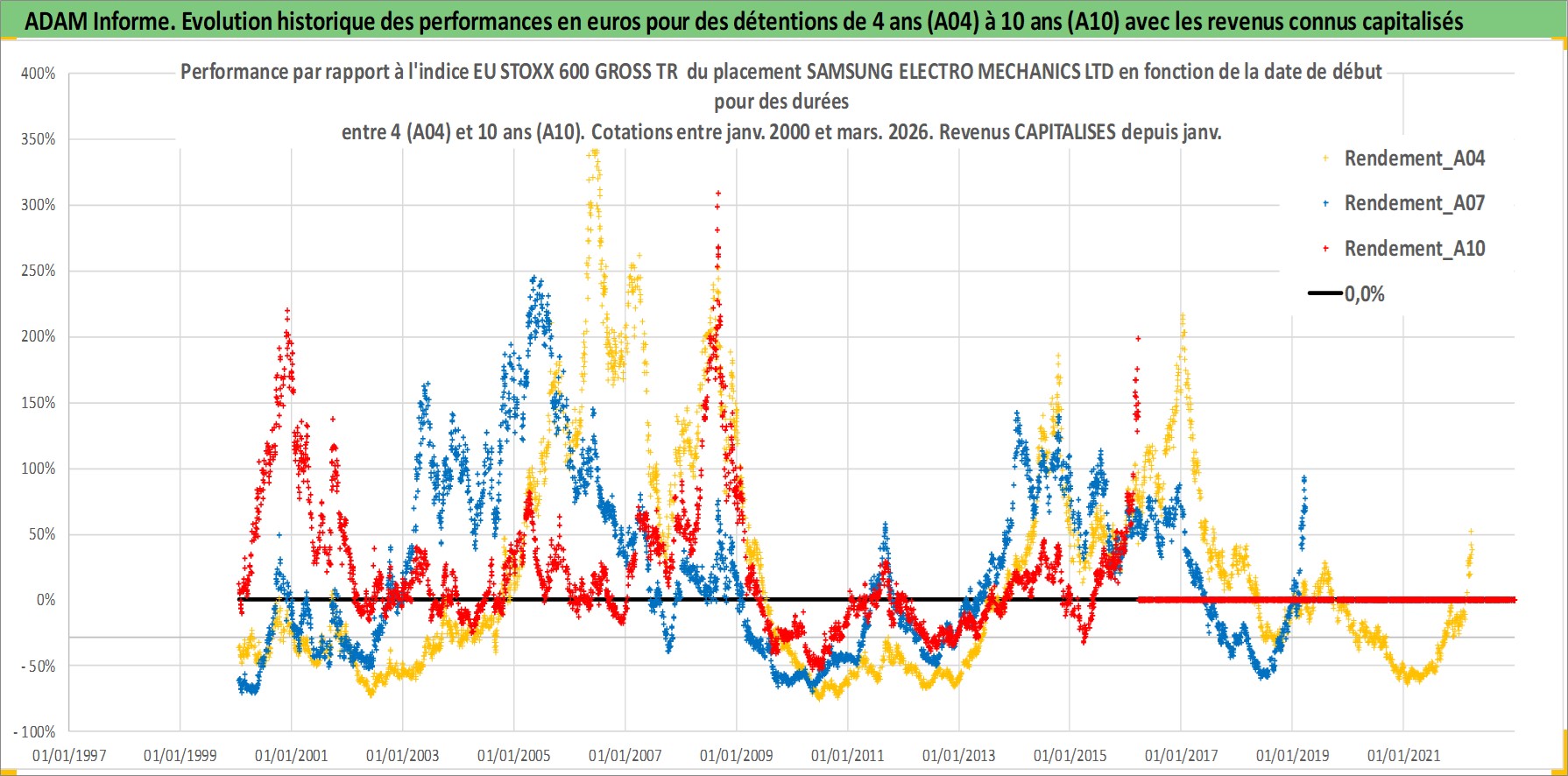 Site dédié aux investisseursPage dédiée sur site financeAnalyse des valorisations hebdomadaires de l'action SAMSUNG ELECTRO MECHANICS LTD. Cet actif est cote en KRW. Les valorisations sont en contrevaleur EURO et couvrent les semaines 2000W02 a 2026W13. Les revenus de cet actif financier sont pris en compte depuis la semaine 2001W01. La note ESG de cet actif n'est pas connue.