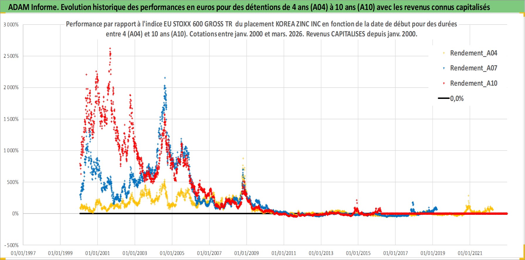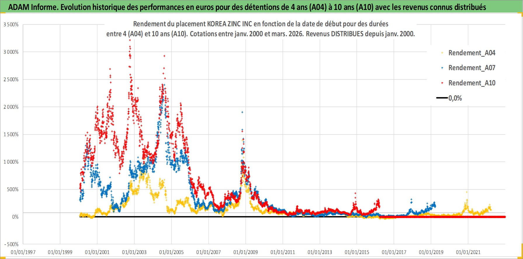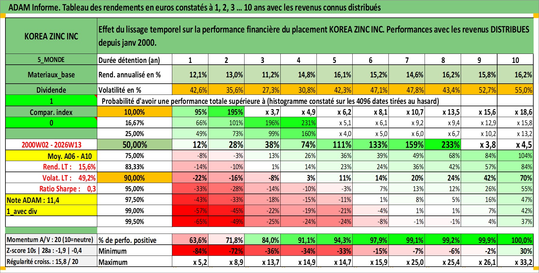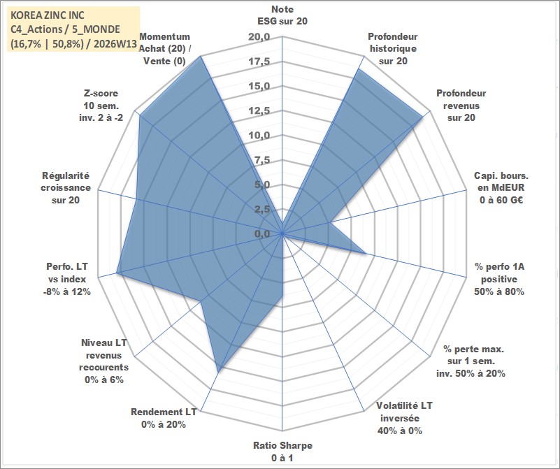 Site dédié aux investisseursPage dédiée sur site financeAnalyse des valorisations hebdomadaires de l'action KOREA ZINC INC. Cet actif est cote en KRW. Les valorisations sont en contrevaleur EURO et couvrent les semaines 2000W02 a 2026W13. Les revenus de cet actif financier sont pris en compte depuis la semaine 2000W01. La note globale ESG de cet actif est estimee a 1.0 (apres rebasage entre 0 et 20).