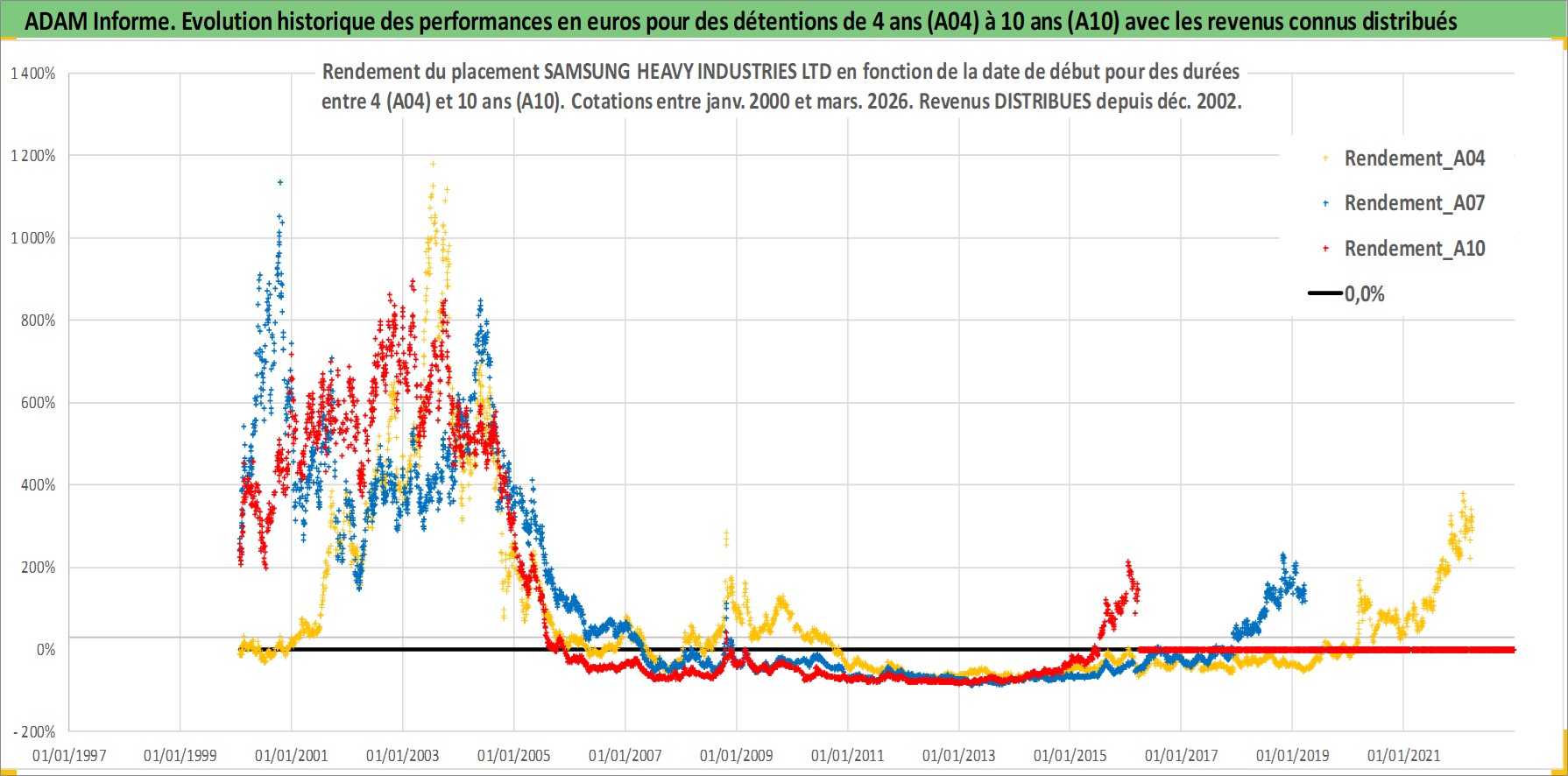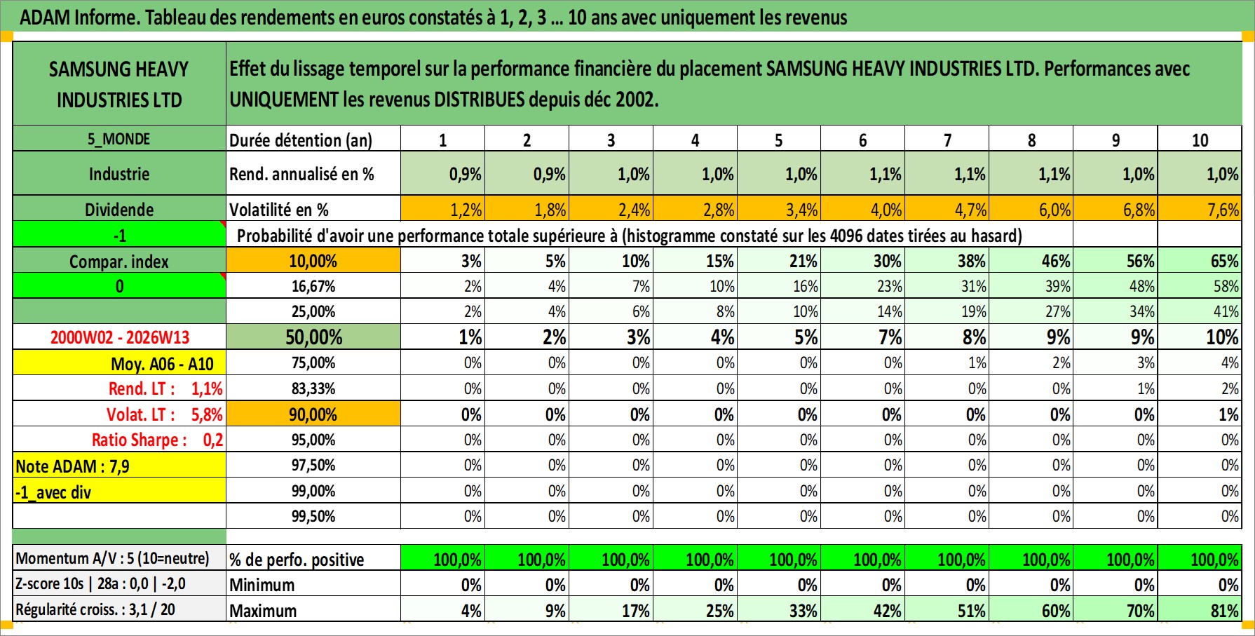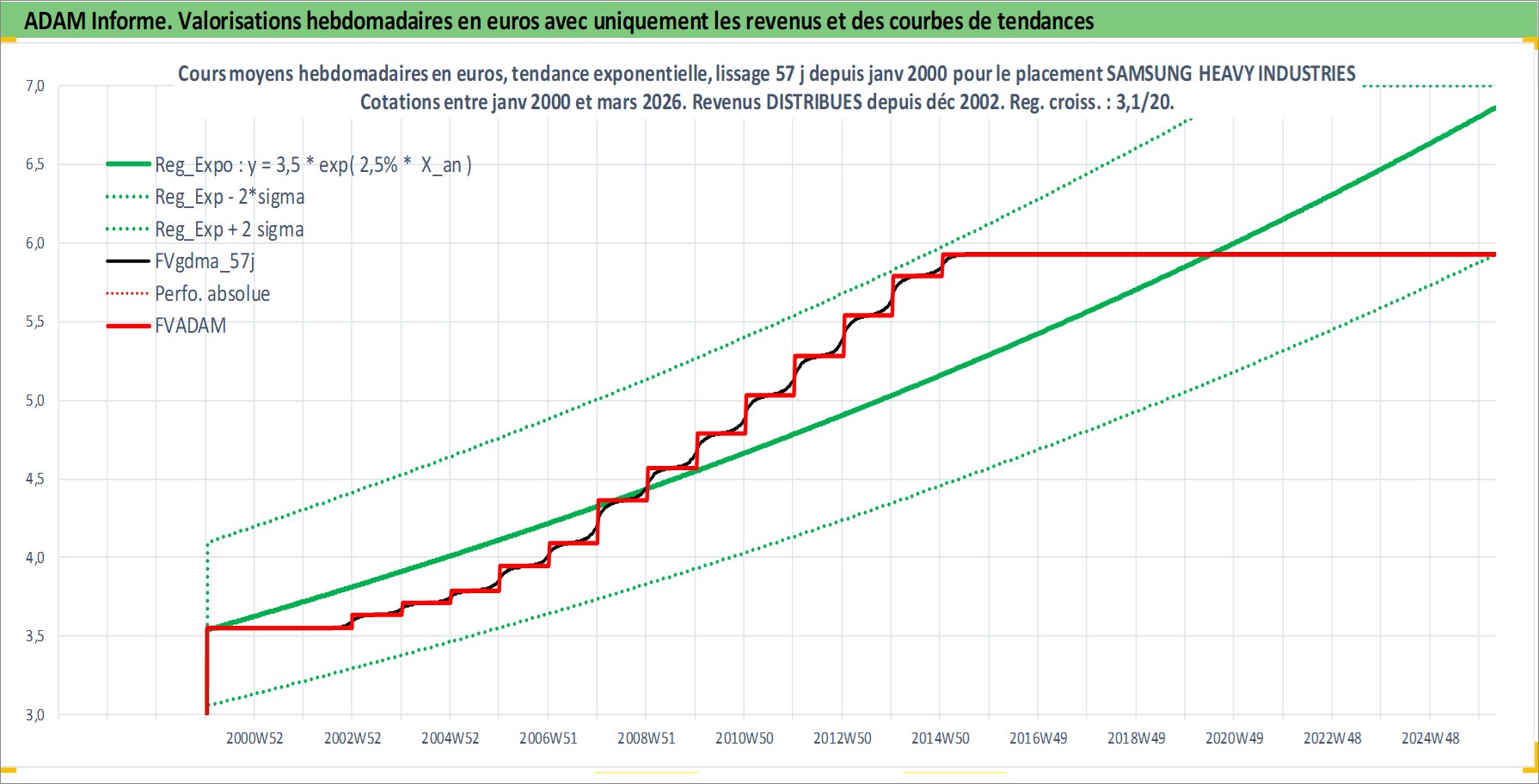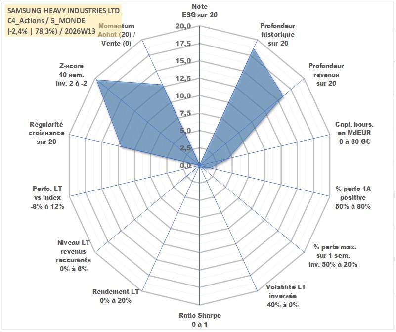 Site dédié aux investisseursPage dédiée sur site financeAnalyse des valorisations hebdomadaires de l'action SAMSUNG HEAVY INDUSTRIES LTD. Cet actif est cote en KRW. Les valorisations sont en contrevaleur EURO et couvrent les semaines 2000W02 a 2026W13. Les revenus de cet actif financier sont pris en compte depuis la semaine 2002W52. La note ESG de cet actif n'est pas connue.