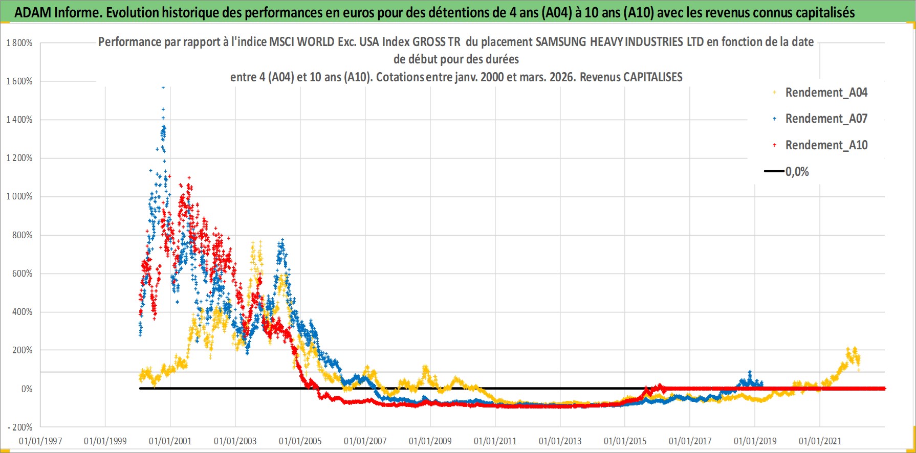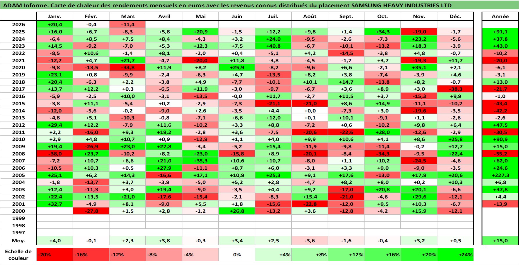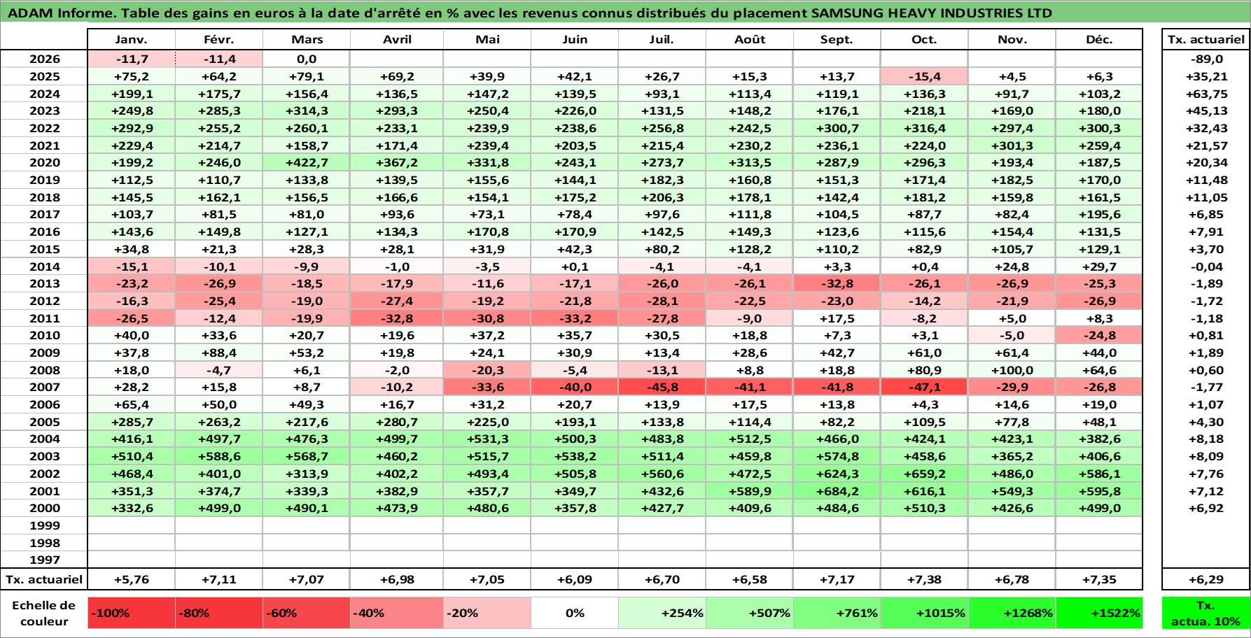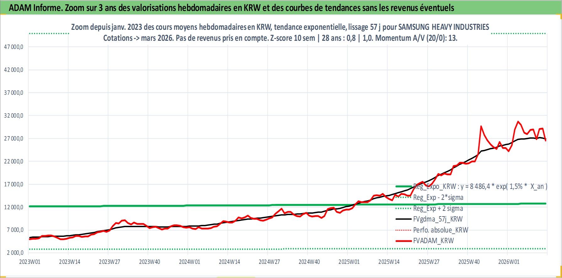 Site dédié aux investisseursPage dédiée sur site financeAnalyse des valorisations hebdomadaires de l'action SAMSUNG HEAVY INDUSTRIES LTD. Cet actif est cote en KRW. Les valorisations sont en contrevaleur EURO et couvrent les semaines 2000W02 a 2026W13. Les revenus de cet actif financier sont pris en compte depuis la semaine 2002W52. La note ESG de cet actif n'est pas connue.