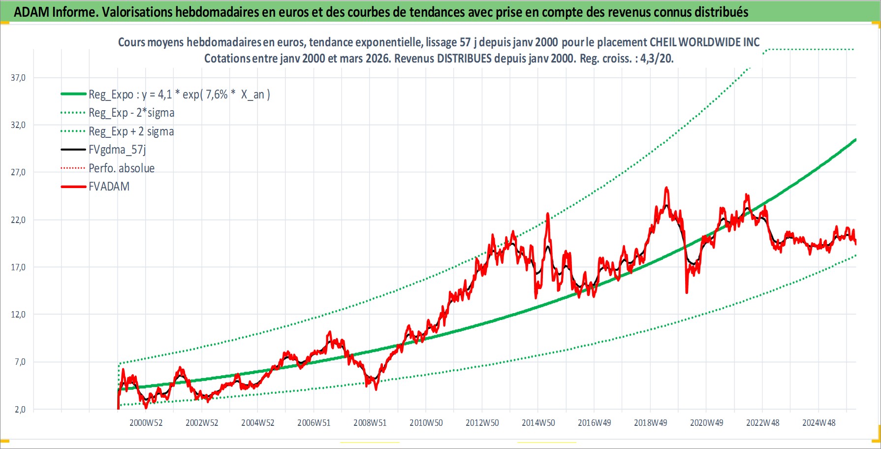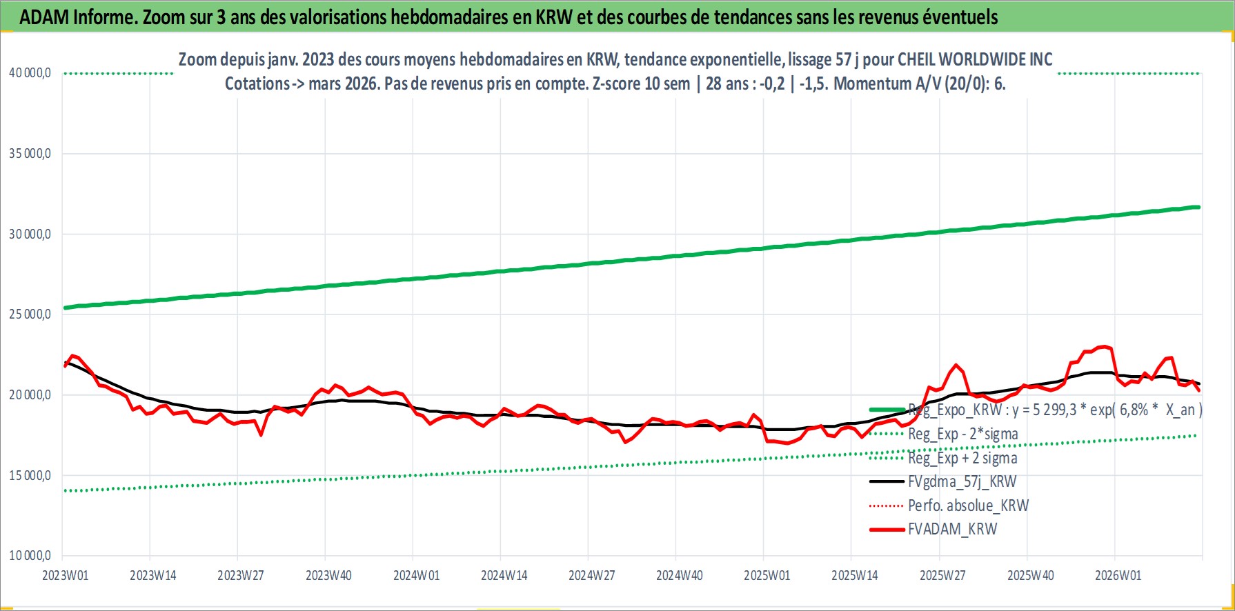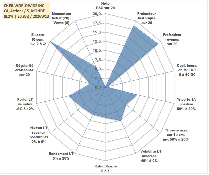Site dédié aux investisseursPage dédiée sur site financeAnalyse des valorisations hebdomadaires de l'action CHEIL WORLDWIDE INC. Cet actif est cote en KRW. Les valorisations sont en contrevaleur EURO et couvrent les semaines 2000W02 a 2026W13. Les revenus de cet actif financier sont pris en compte depuis la semaine 2000W01. La note ESG de cet actif n'est pas connue.