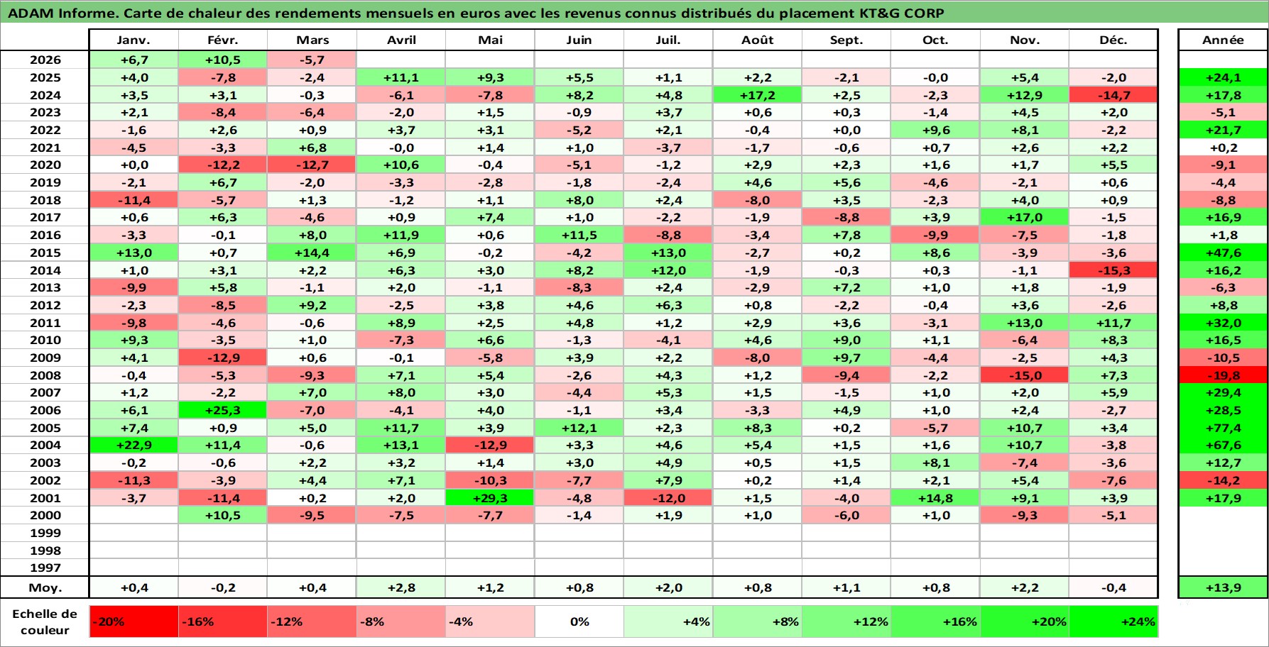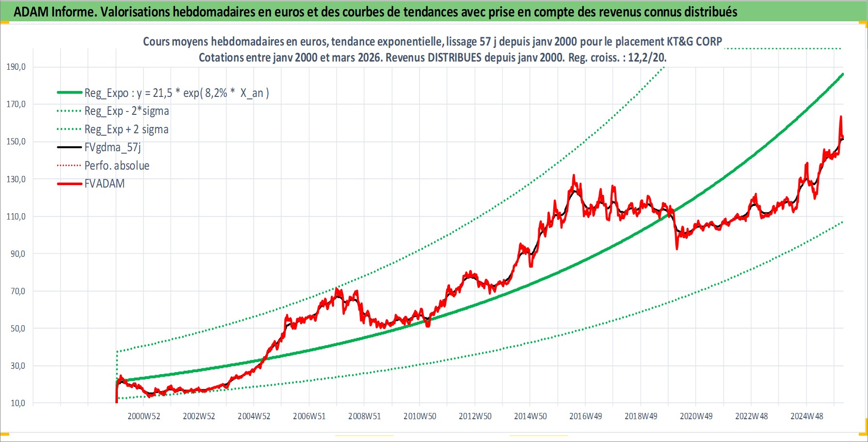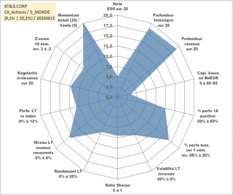 Site dédié aux investisseursPage dédiée sur site financeAnalyse des valorisations hebdomadaires de l'action KT&G CORP. Cet actif est cote en KRW. Les valorisations sont en contrevaleur EURO et couvrent les semaines 2000W02 a 2026W13. Les revenus de cet actif financier sont pris en compte depuis la semaine 2000W01. La note globale ESG de cet actif est estimee a 5.0 (apres rebasage entre 0 et 20).