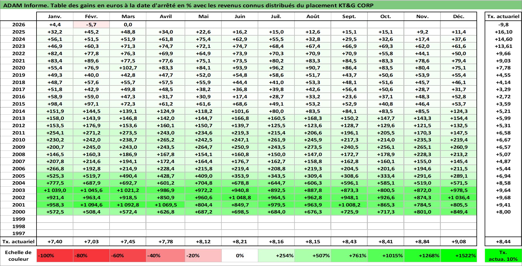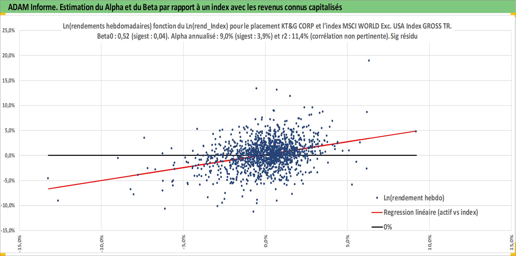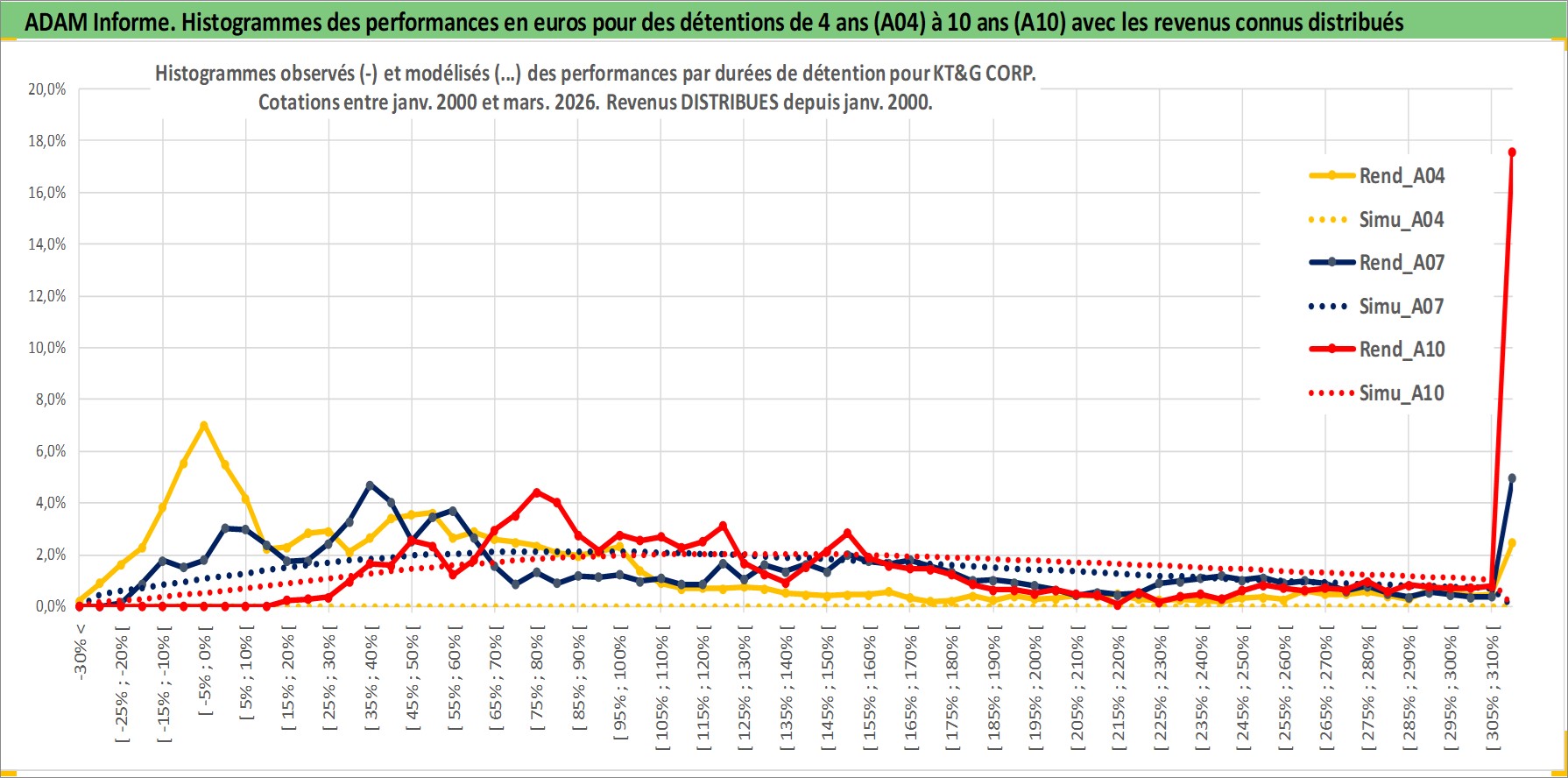 Site dédié aux investisseursPage dédiée sur site financeAnalyse des valorisations hebdomadaires de l'action KT&G CORP. Cet actif est cote en KRW. Les valorisations sont en contrevaleur EURO et couvrent les semaines 2000W02 a 2026W13. Les revenus de cet actif financier sont pris en compte depuis la semaine 2000W01. La note globale ESG de cet actif est estimee a 5.0 (apres rebasage entre 0 et 20).