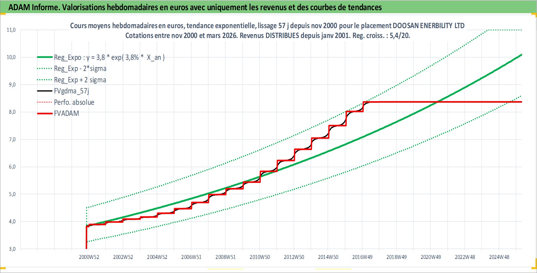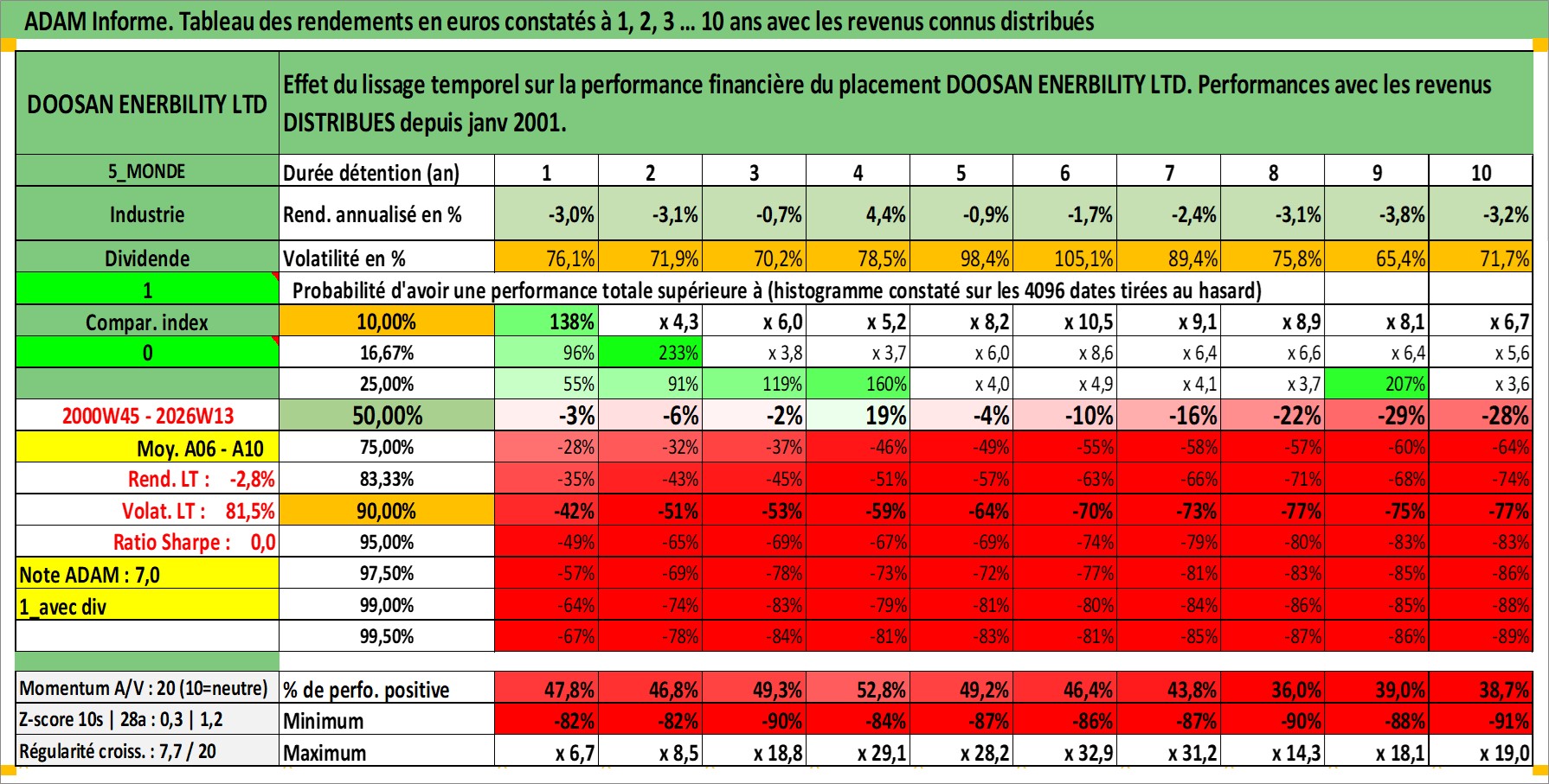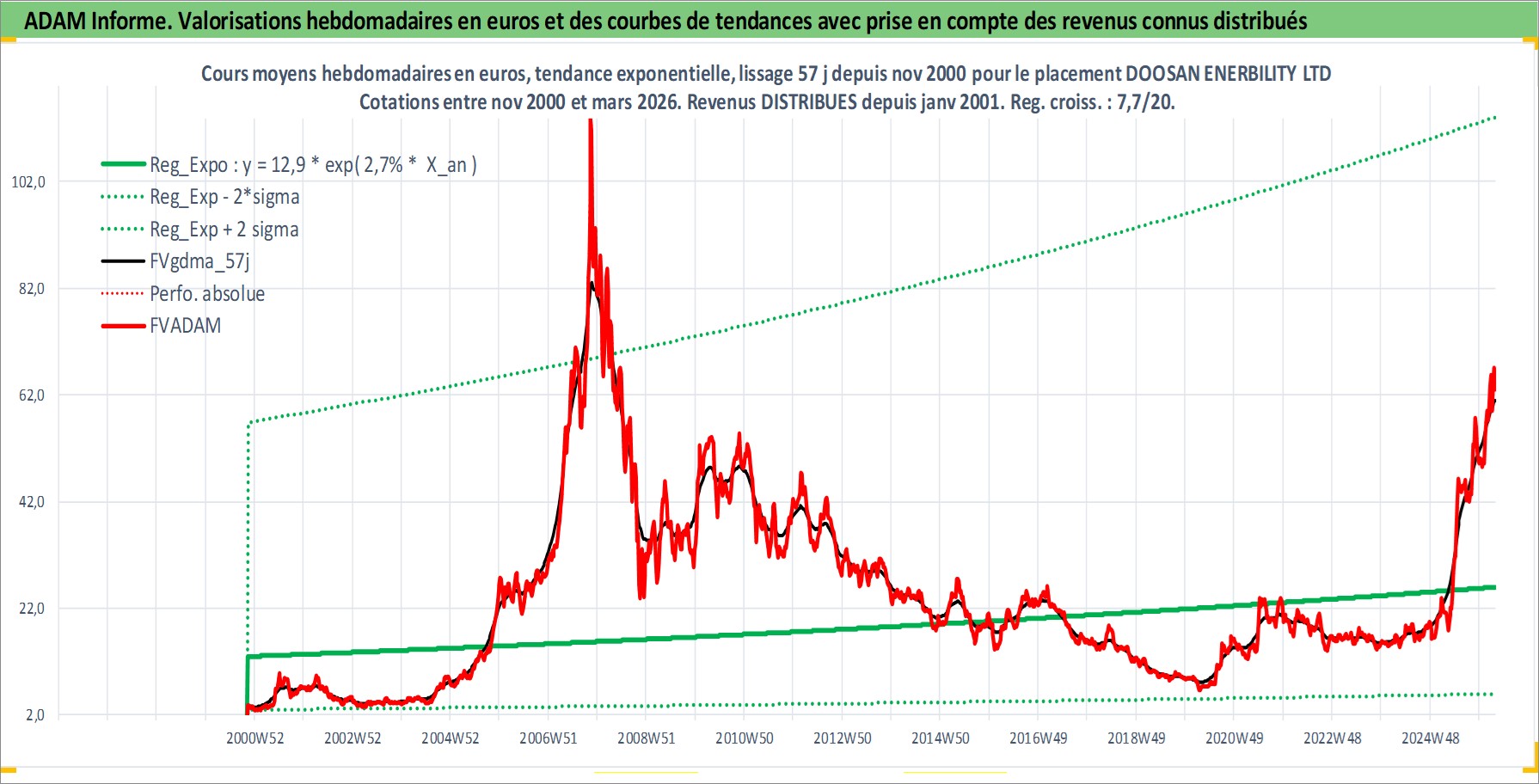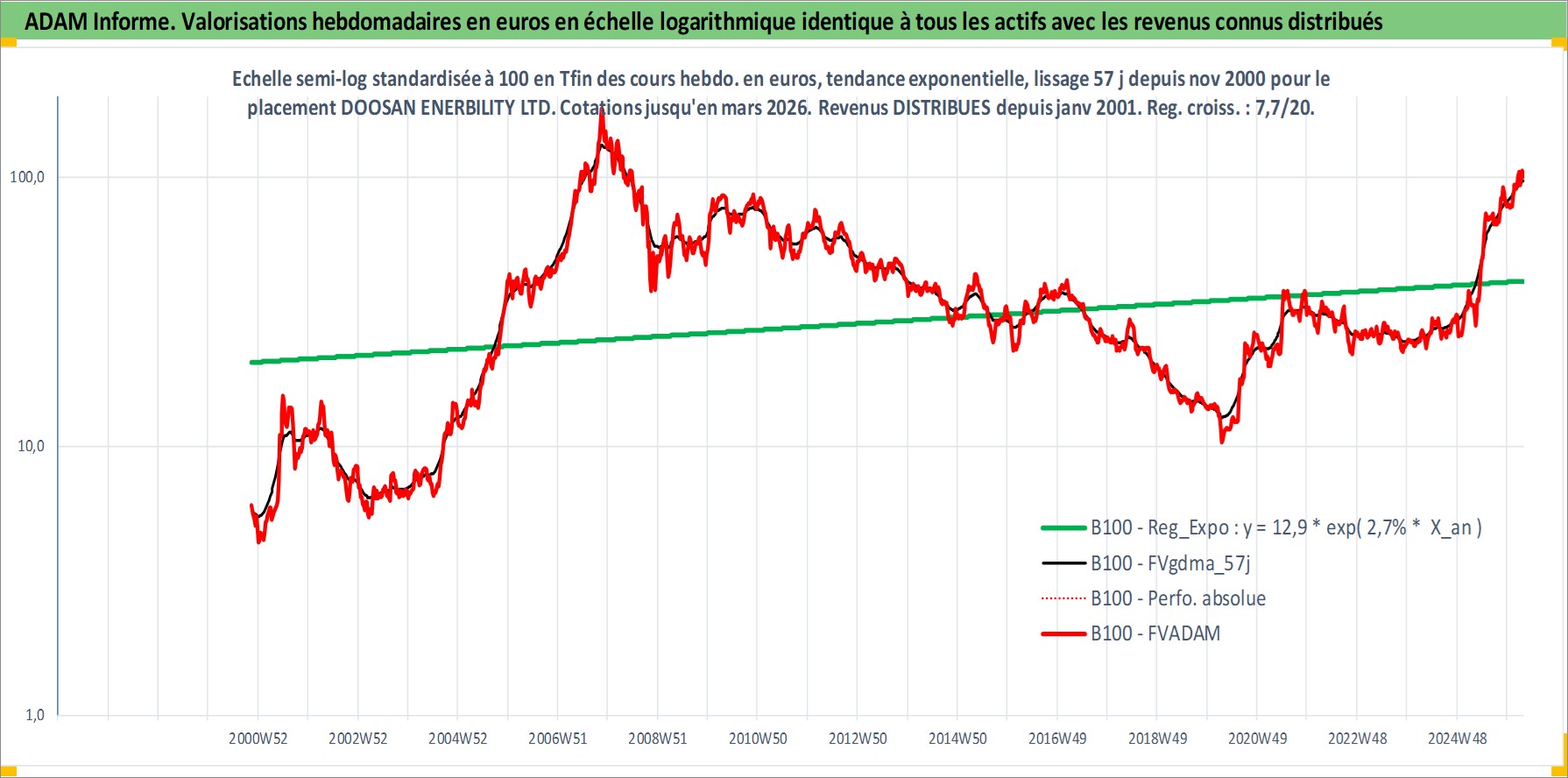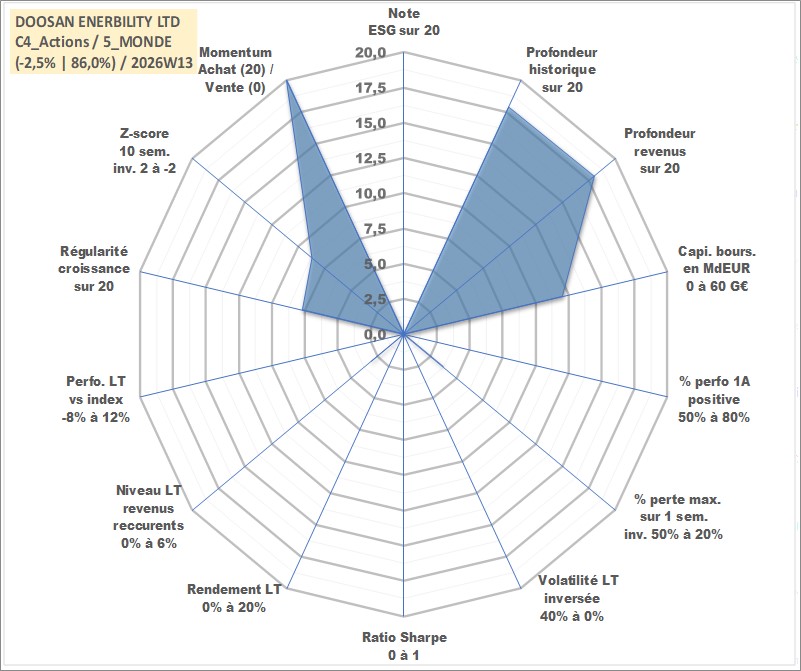 Site dédié aux investisseursPage dédiée sur site financeAnalyse des valorisations hebdomadaires de l'action DOOSAN ENERBILITY LTD. Cet actif est cote en KRW. Les valorisations sont en contrevaleur EURO et couvrent les semaines 2000W45 a 2026W13. Les revenus de cet actif financier sont pris en compte depuis la semaine 2001W01. La note ESG de cet actif n'est pas connue.