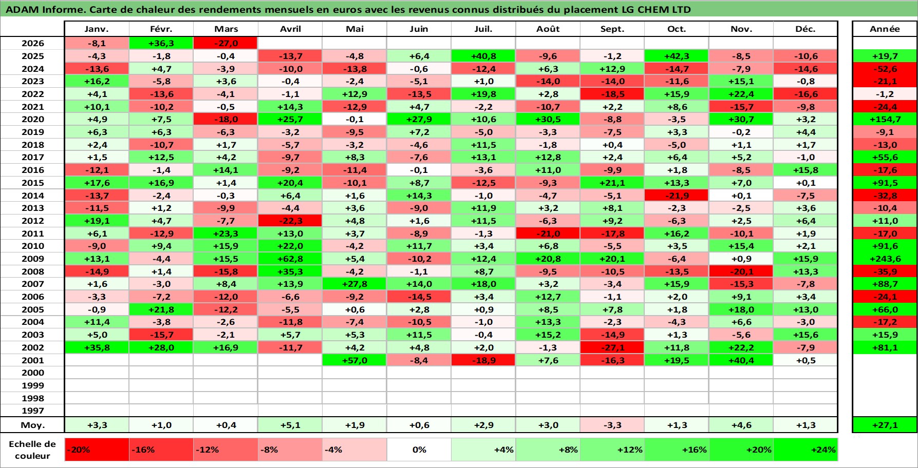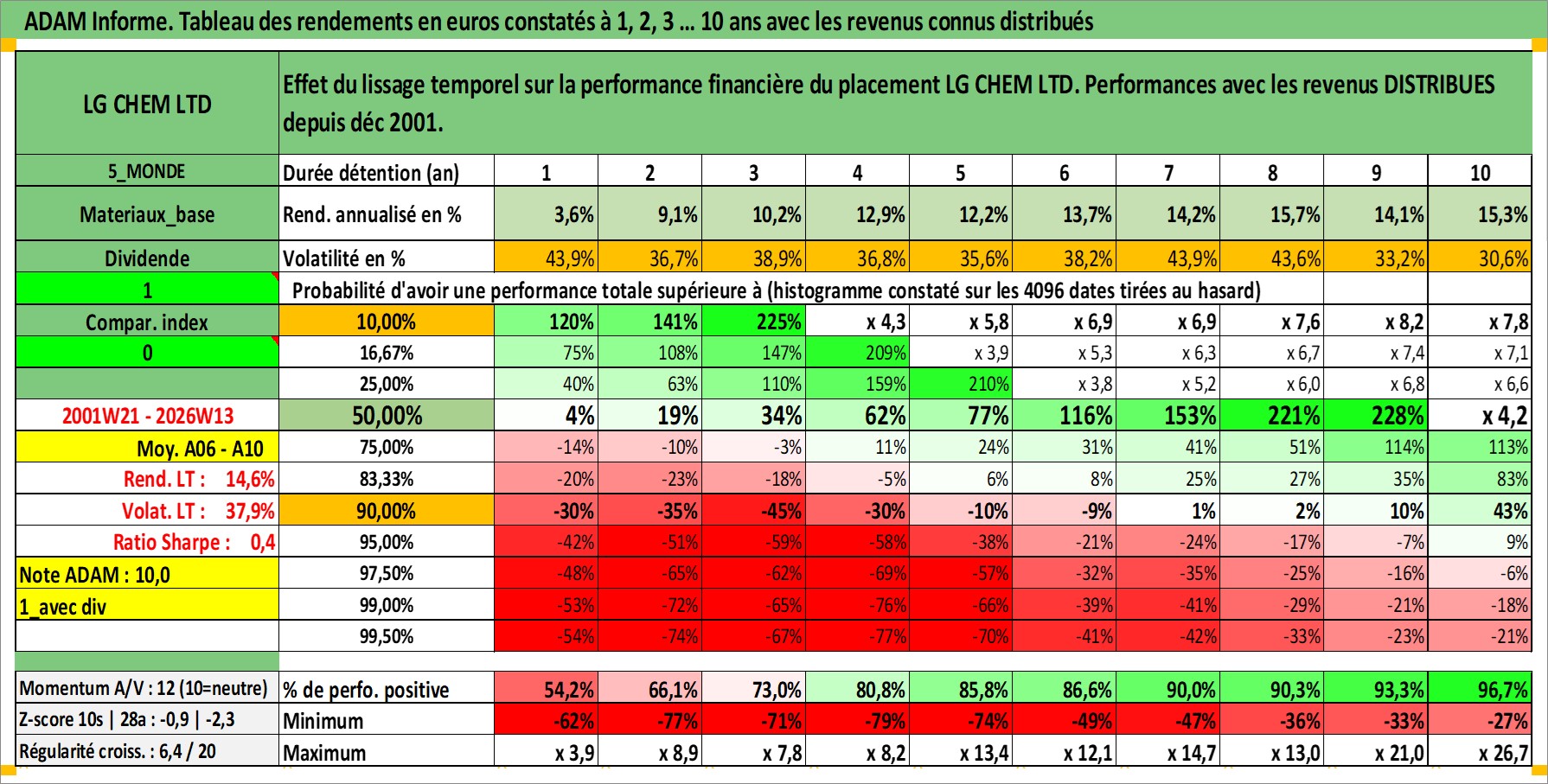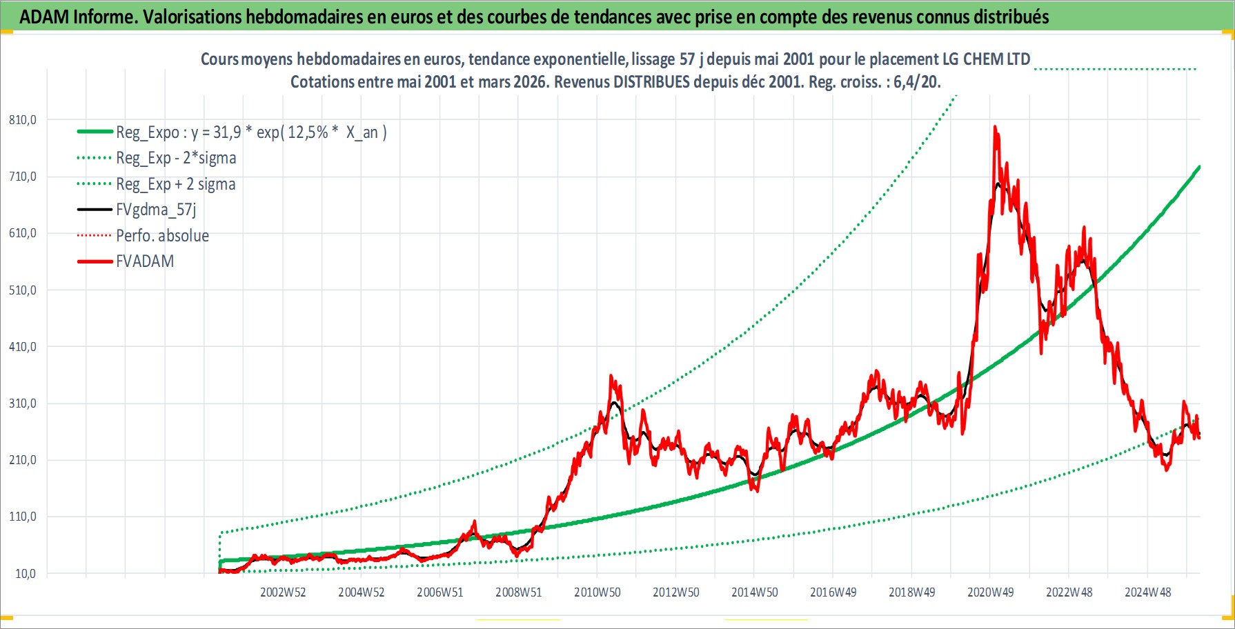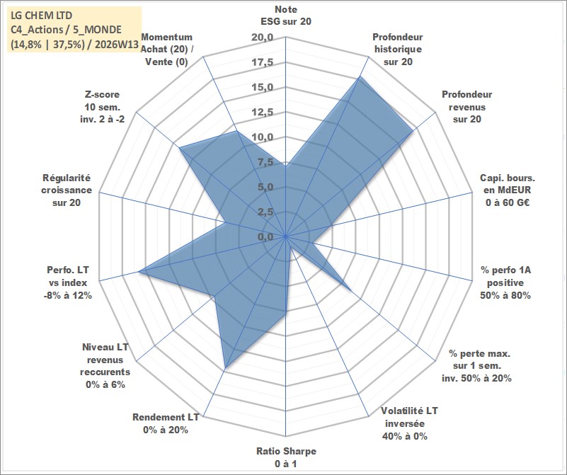 Site dédié aux investisseursPage dédiée sur site financeAnalyse des valorisations hebdomadaires de l'action LG CHEM LTD. Cet actif est cote en KRW. Les valorisations sont en contrevaleur EURO et couvrent les semaines 2001W21 a 2026W13. Les revenus de cet actif financier sont pris en compte depuis la semaine 2001W52. La note globale ESG de cet actif est estimee a 7.0 (apres rebasage entre 0 et 20).