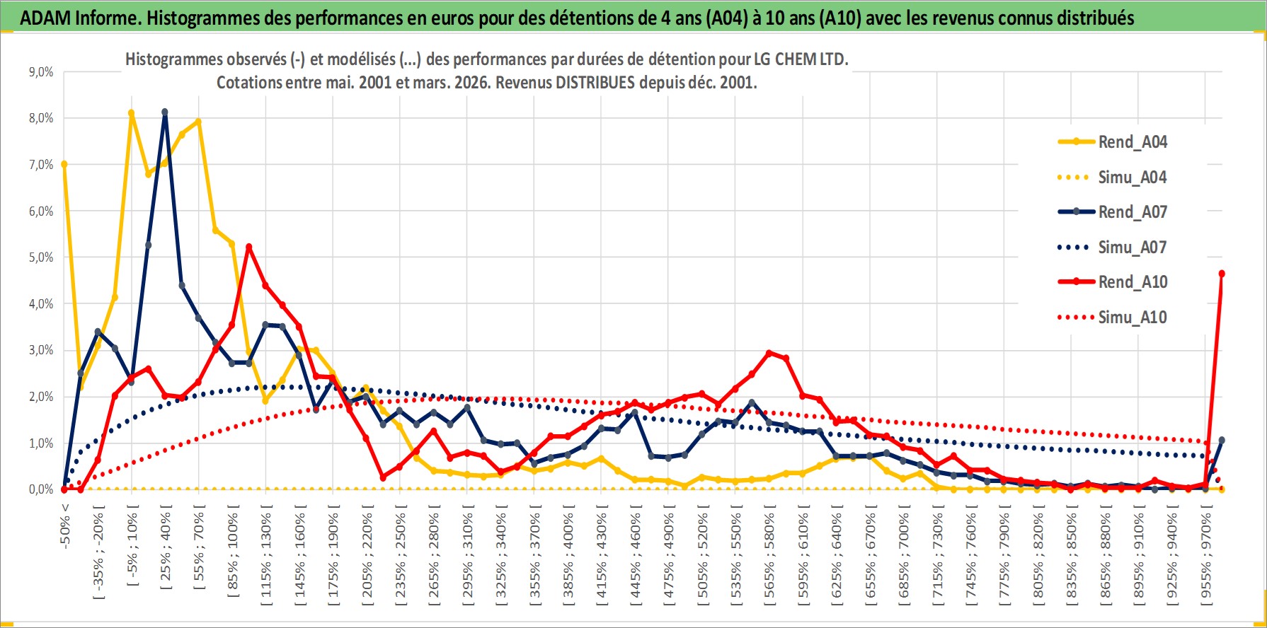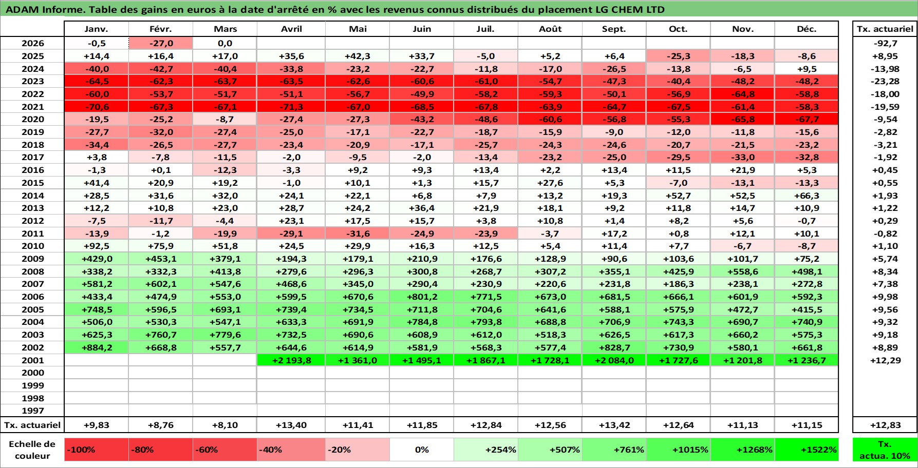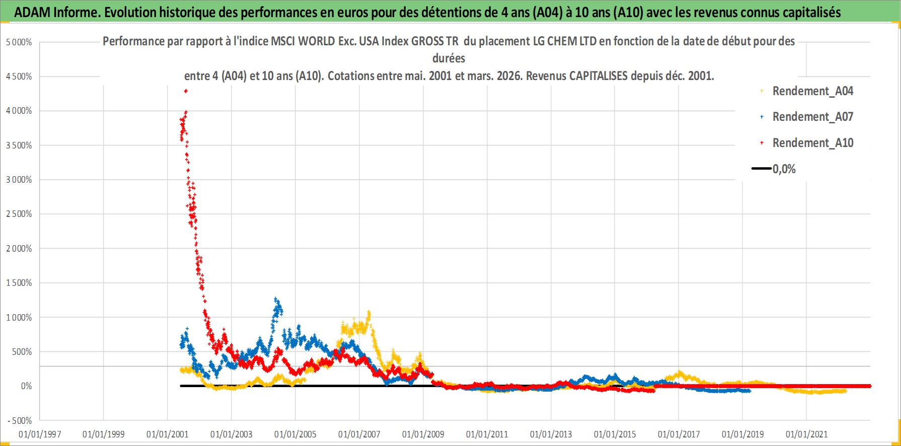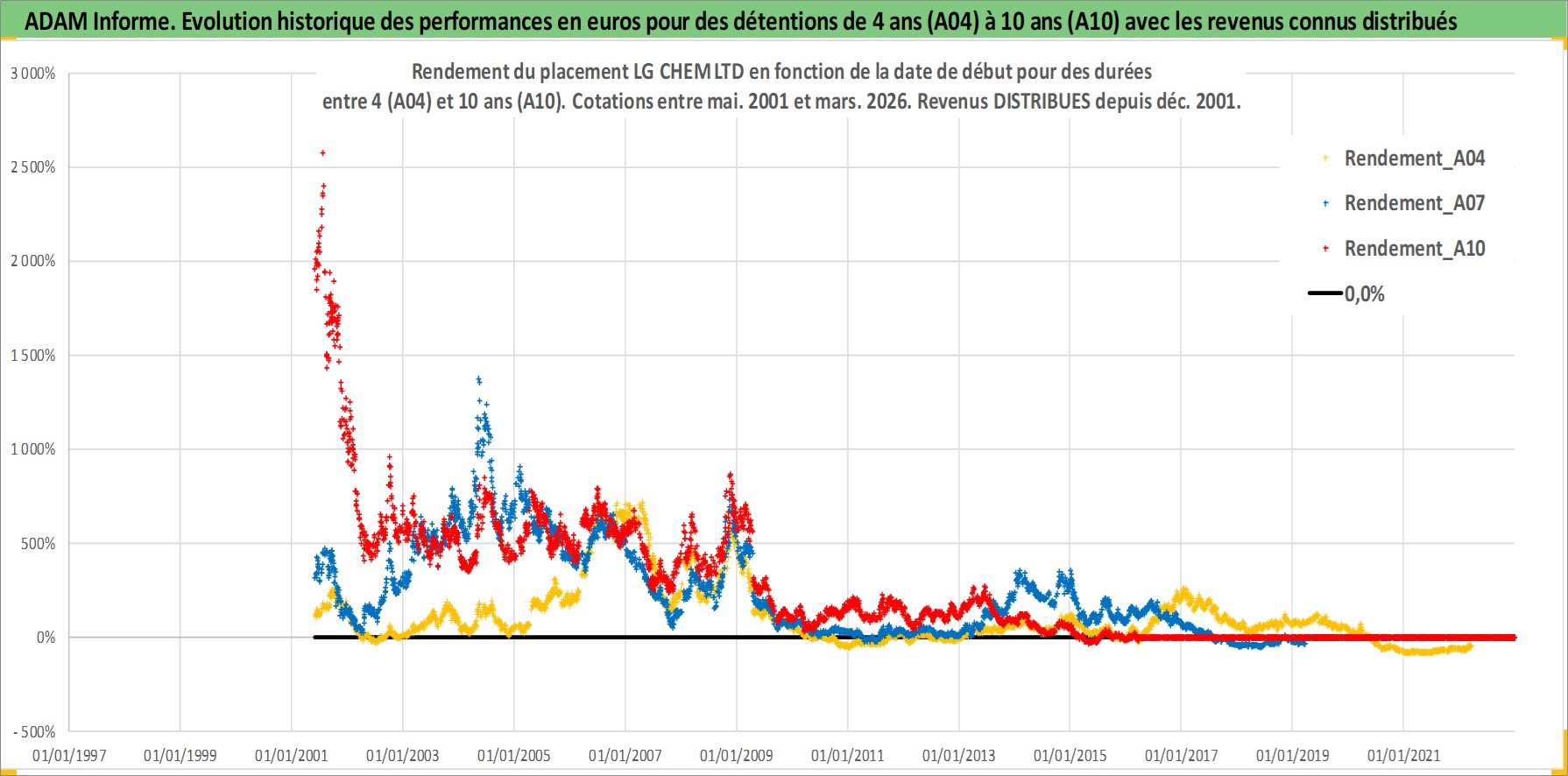 Site dédié aux investisseursPage dédiée sur site financeAnalyse des valorisations hebdomadaires de l'action LG CHEM LTD. Cet actif est cote en KRW. Les valorisations sont en contrevaleur EURO et couvrent les semaines 2001W21 a 2026W13. Les revenus de cet actif financier sont pris en compte depuis la semaine 2001W52. La note globale ESG de cet actif est estimee a 7.0 (apres rebasage entre 0 et 20).