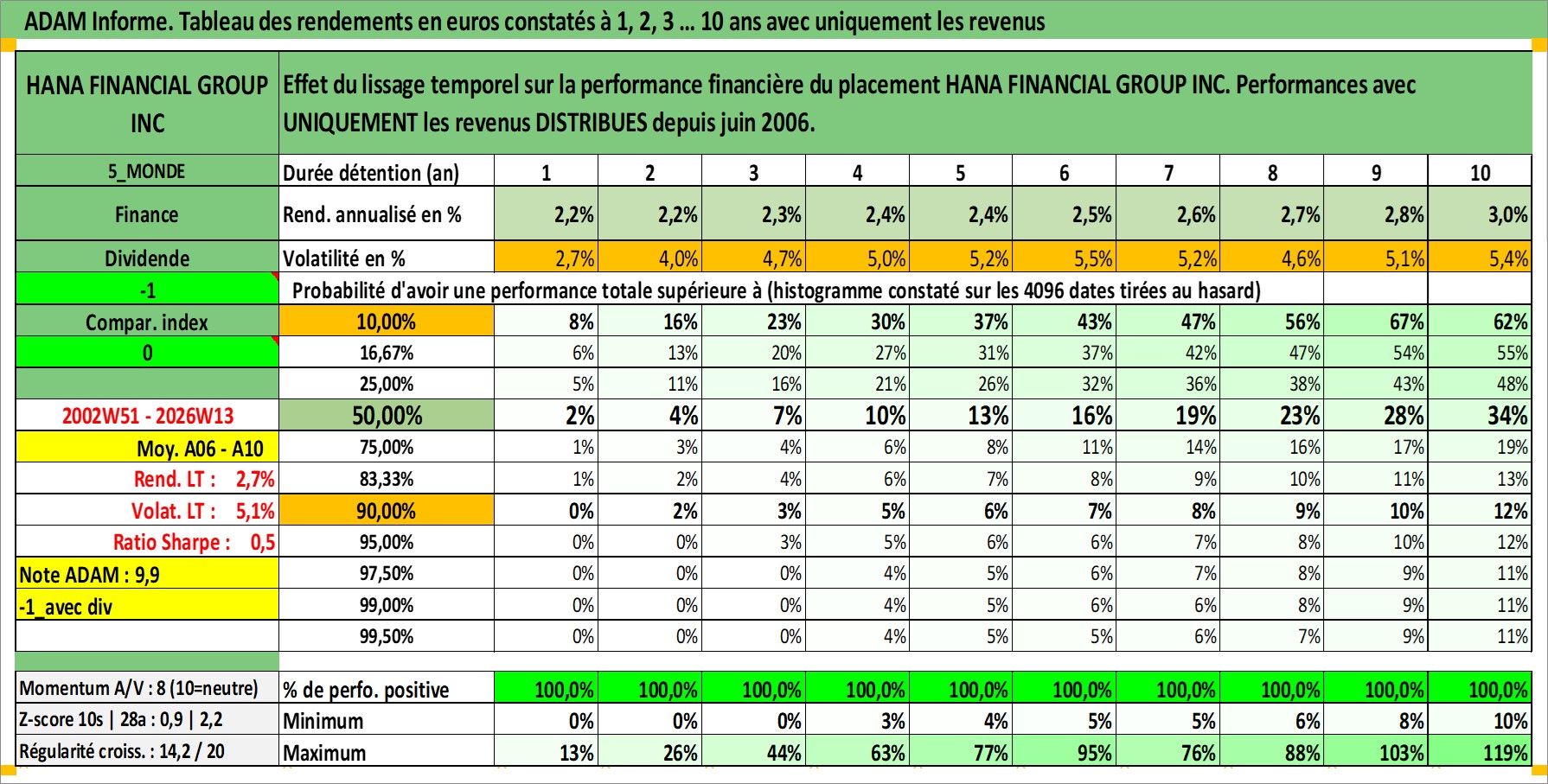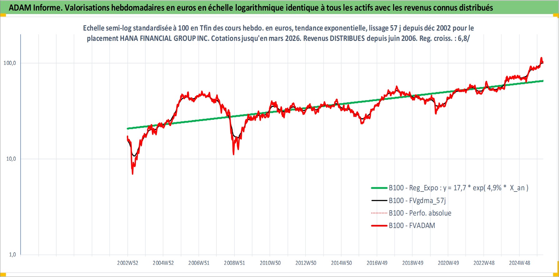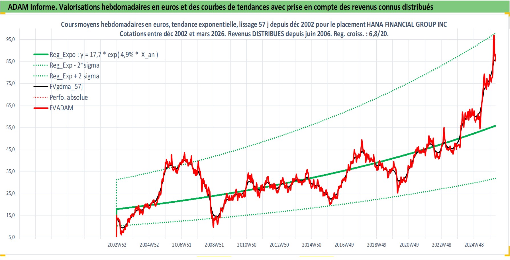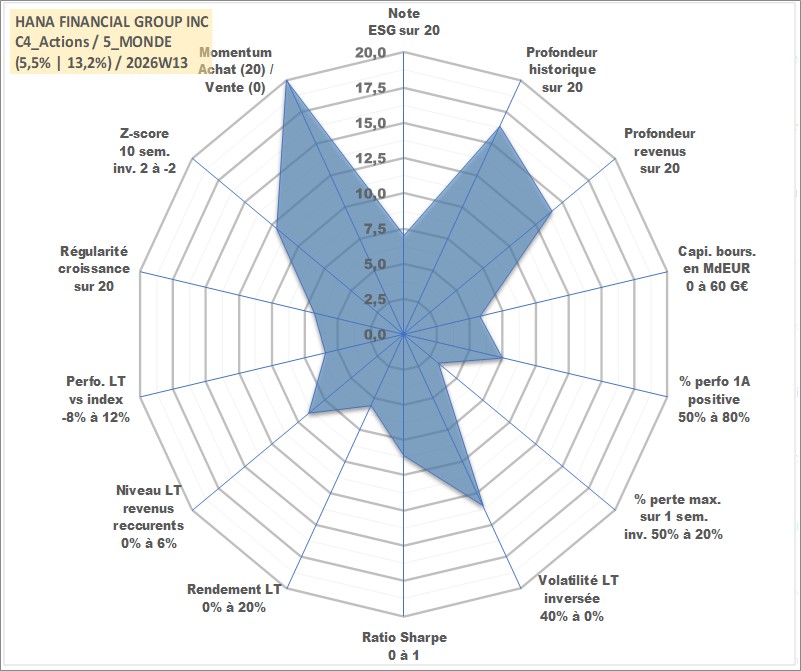 Site dédié aux investisseursPage dédiée sur site financeAnalyse des valorisations hebdomadaires de l'action HANA FINANCIAL GROUP INC. Cet actif est cote en KRW. Les valorisations sont en contrevaleur EURO et couvrent les semaines 2002W51 a 2026W13. Les revenus de cet actif financier sont pris en compte depuis la semaine 2006W26. La note globale ESG de cet actif est estimee a 7.0 (apres rebasage entre 0 et 20).