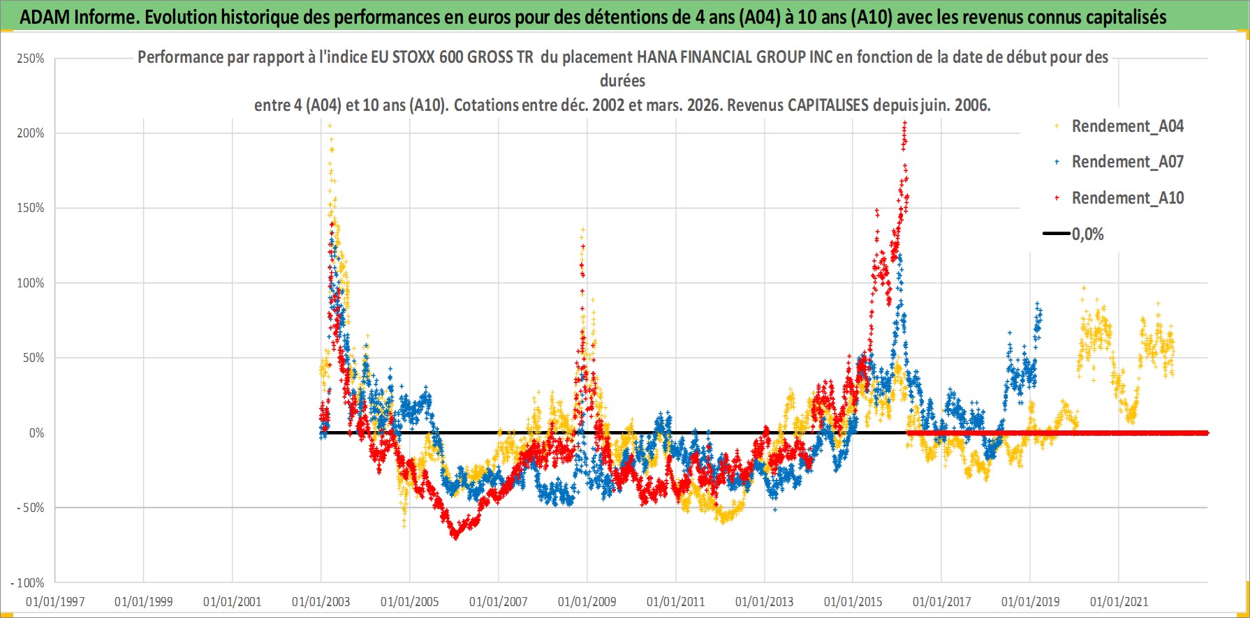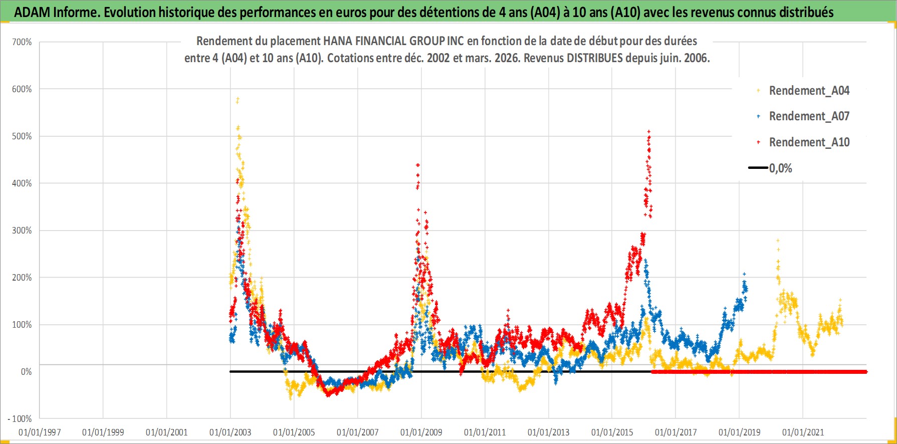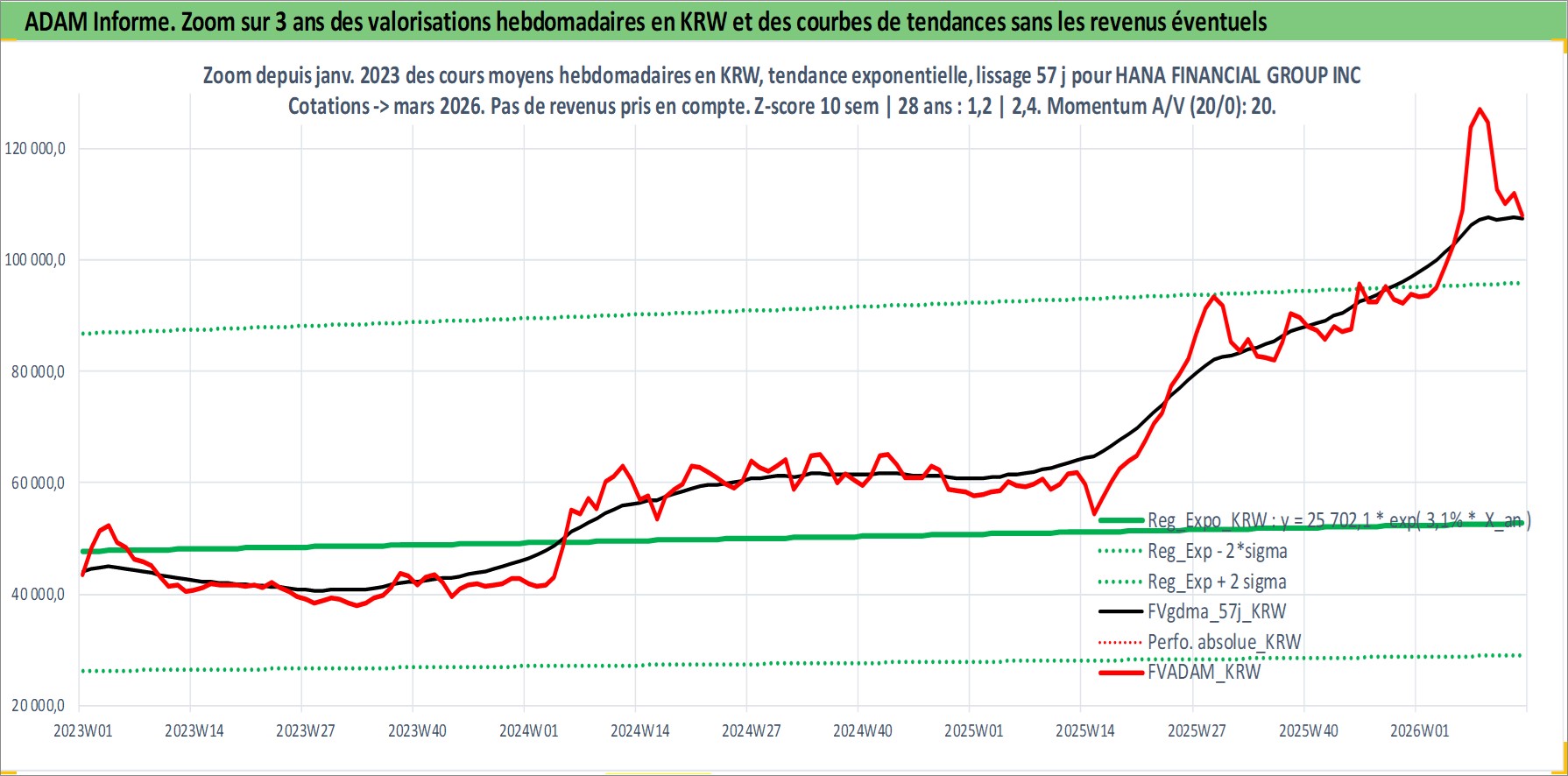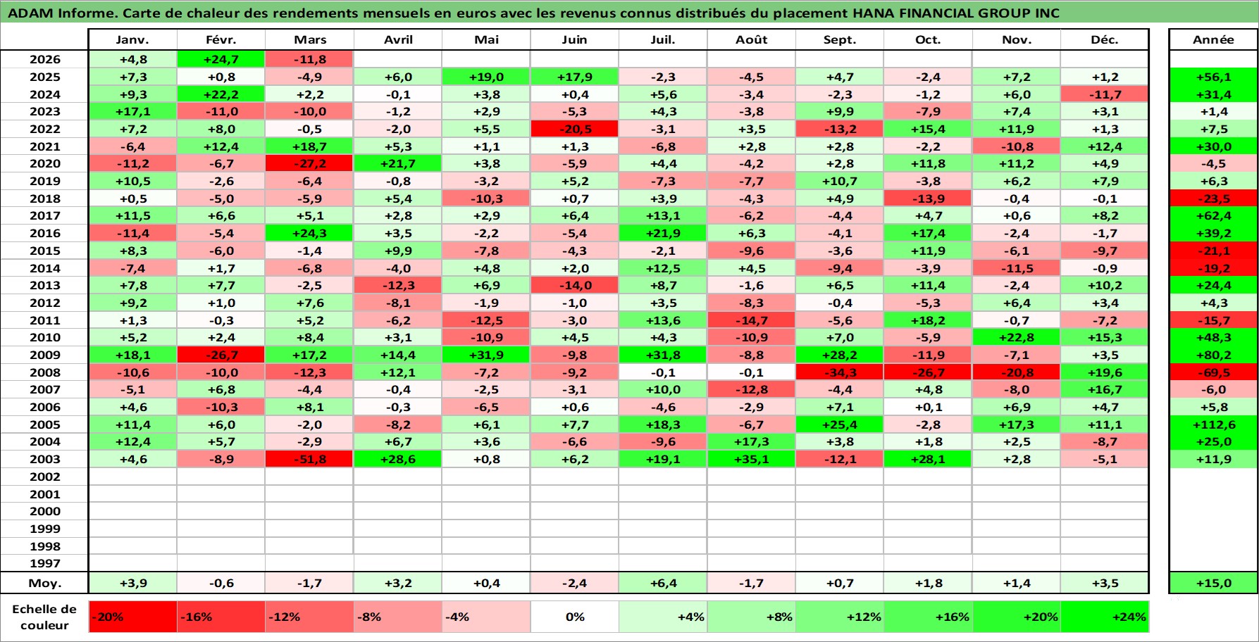 Site dédié aux investisseursPage dédiée sur site financeAnalyse des valorisations hebdomadaires de l'action HANA FINANCIAL GROUP INC. Cet actif est cote en KRW. Les valorisations sont en contrevaleur EURO et couvrent les semaines 2002W51 a 2026W13. Les revenus de cet actif financier sont pris en compte depuis la semaine 2006W26. La note globale ESG de cet actif est estimee a 7.0 (apres rebasage entre 0 et 20).