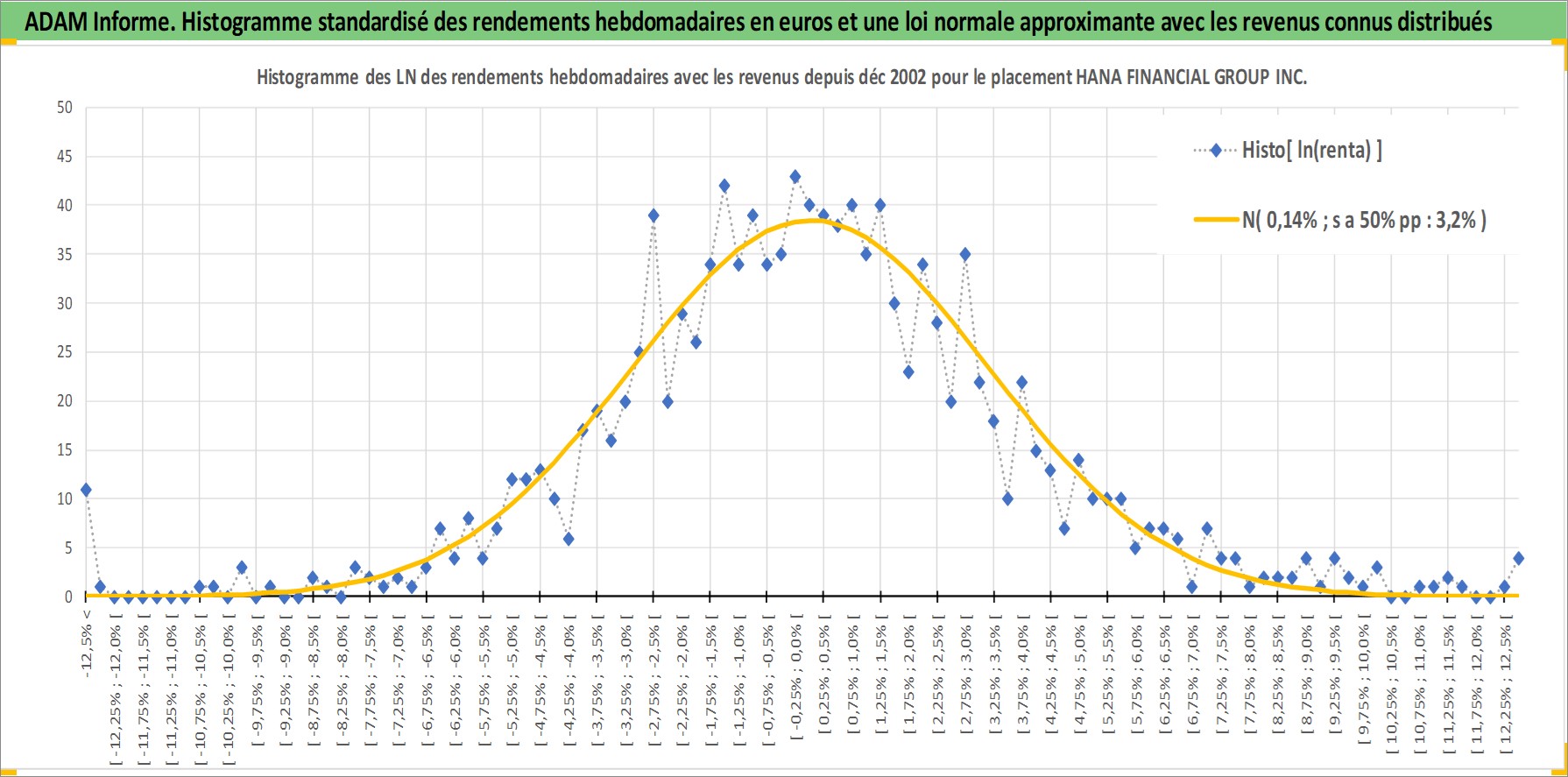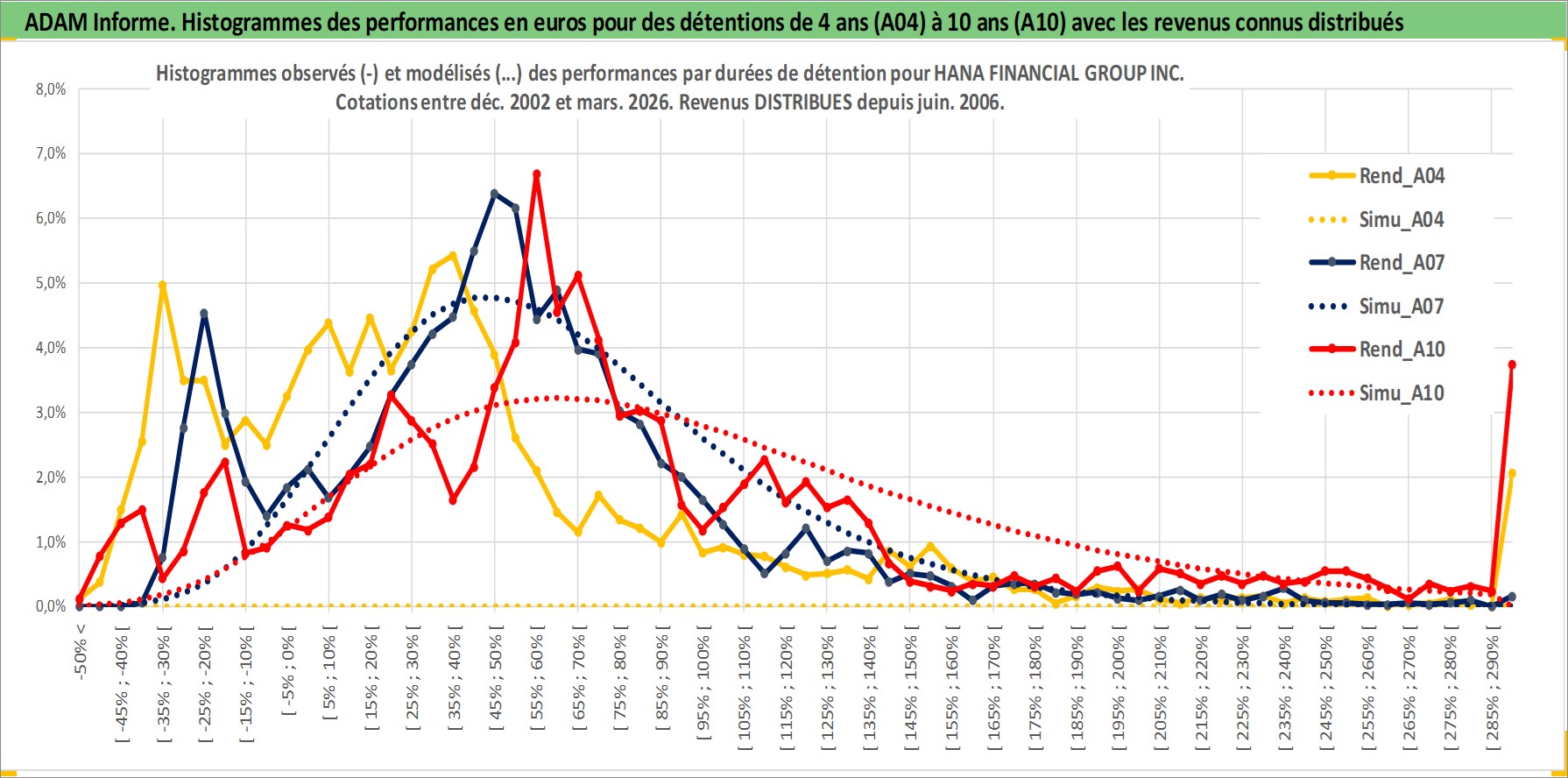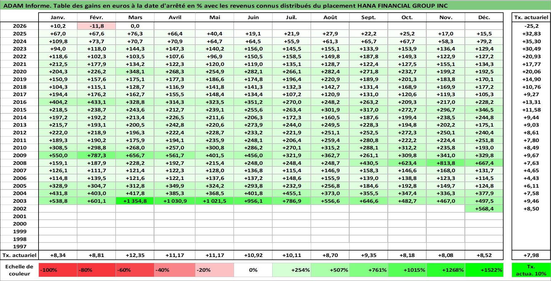 Site dédié aux investisseursPage dédiée sur site financeAnalyse des valorisations hebdomadaires de l'action HANA FINANCIAL GROUP INC. Cet actif est cote en KRW. Les valorisations sont en contrevaleur EURO et couvrent les semaines 2002W51 a 2026W13. Les revenus de cet actif financier sont pris en compte depuis la semaine 2006W26. La note globale ESG de cet actif est estimee a 7.0 (apres rebasage entre 0 et 20).