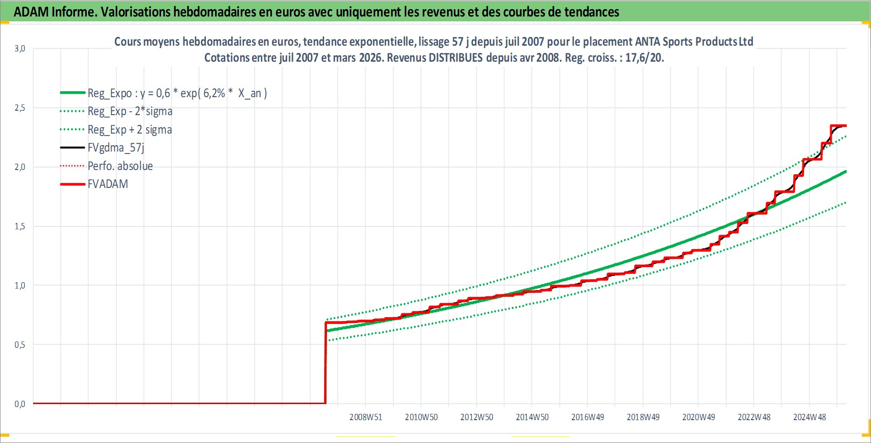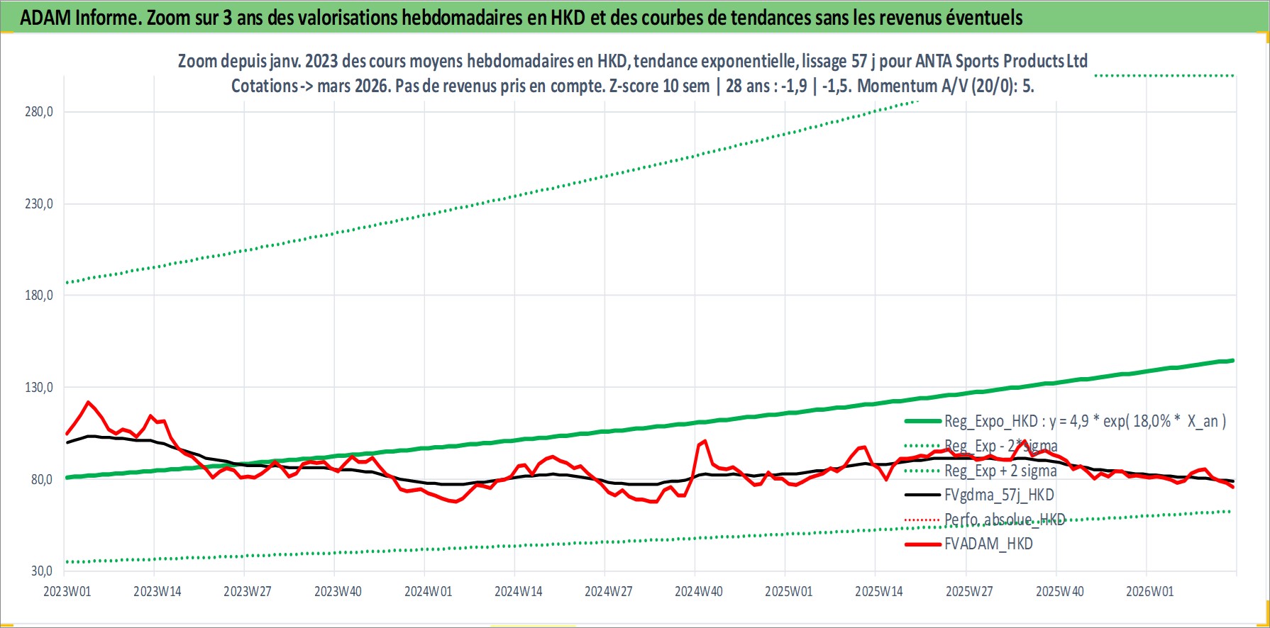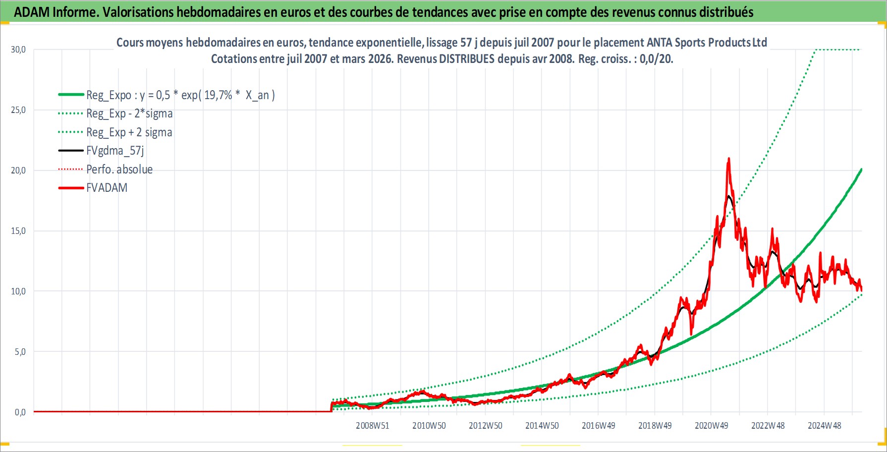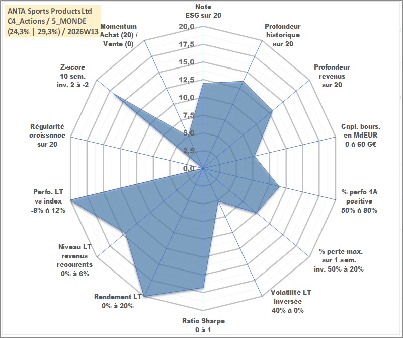 Site dédié aux investisseursPage dédiée sur site financeAnalyse des valorisations hebdomadaires de l'action ANTA Sports Products Ltd. Cet actif est cote en HKD. Les valorisations sont en contrevaleur EURO et couvrent les semaines 2007W28 a 2026W13. Les revenus de cet actif financier sont pris en compte depuis la semaine 2008W16. La note globale ESG de cet actif est estimee a 12.0 (apres rebasage entre 0 et 20).
