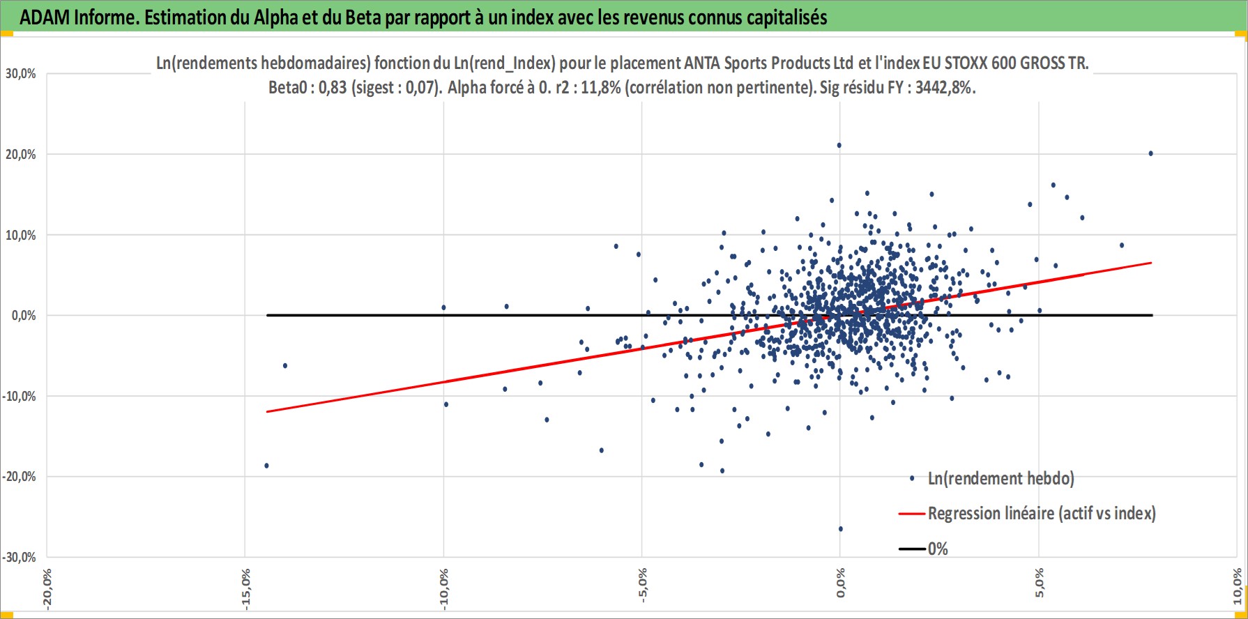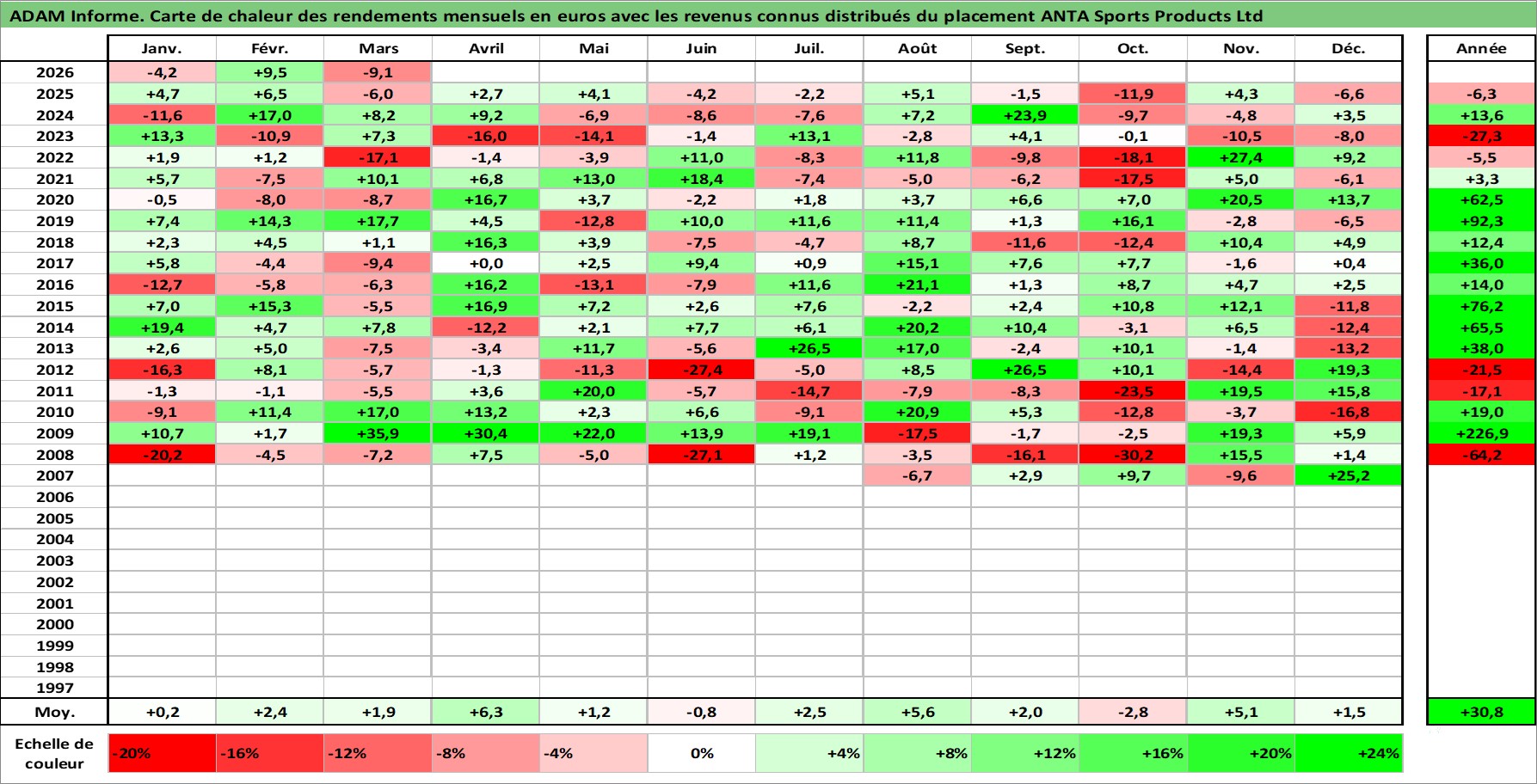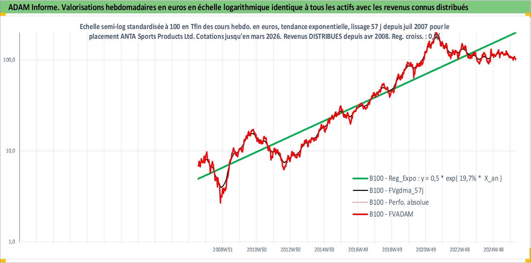 Site dédié aux investisseursPage dédiée sur site financeAnalyse des valorisations hebdomadaires de l'action ANTA Sports Products Ltd. Cet actif est cote en HKD. Les valorisations sont en contrevaleur EURO et couvrent les semaines 2007W28 a 2026W13. Les revenus de cet actif financier sont pris en compte depuis la semaine 2008W16. La note globale ESG de cet actif est estimee a 12.0 (apres rebasage entre 0 et 20).