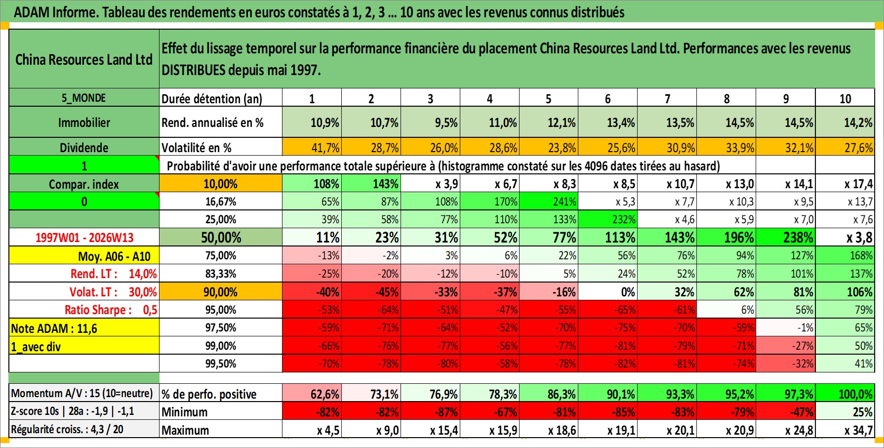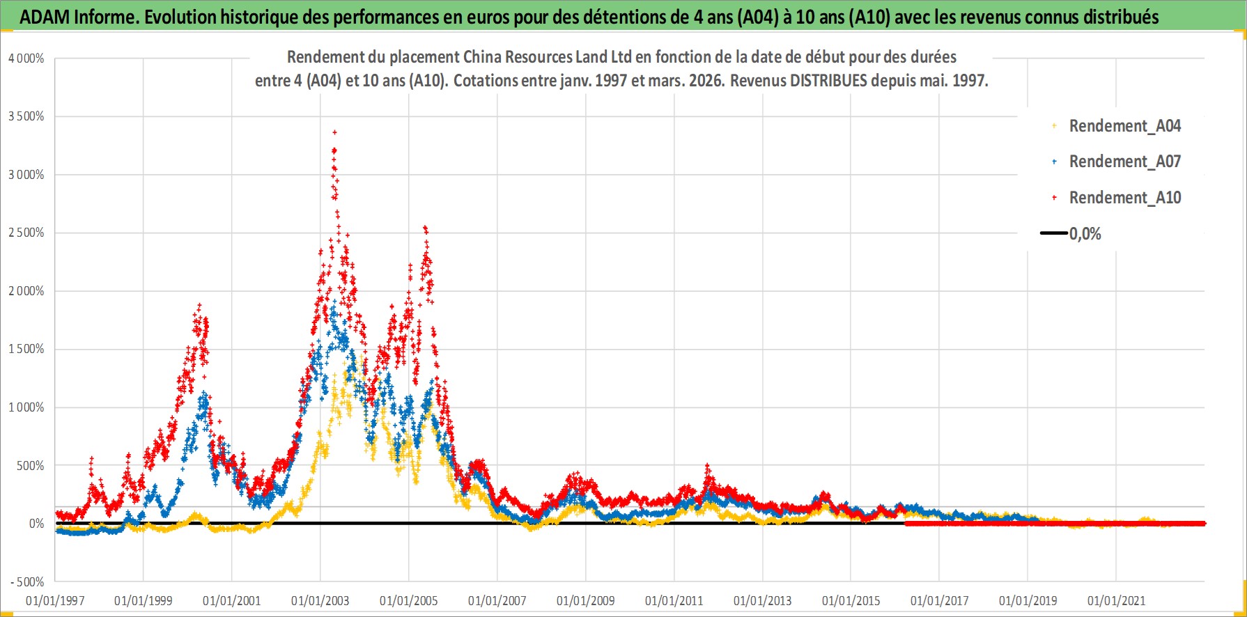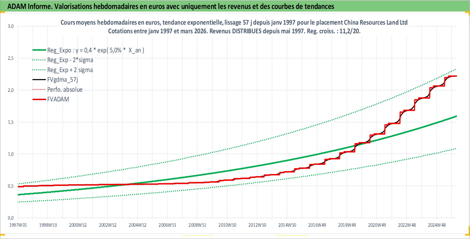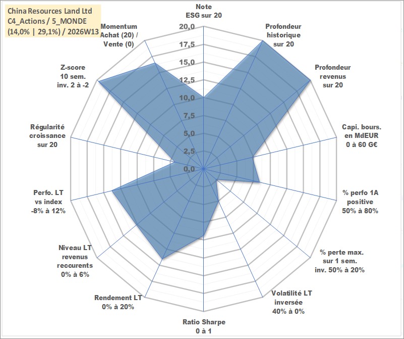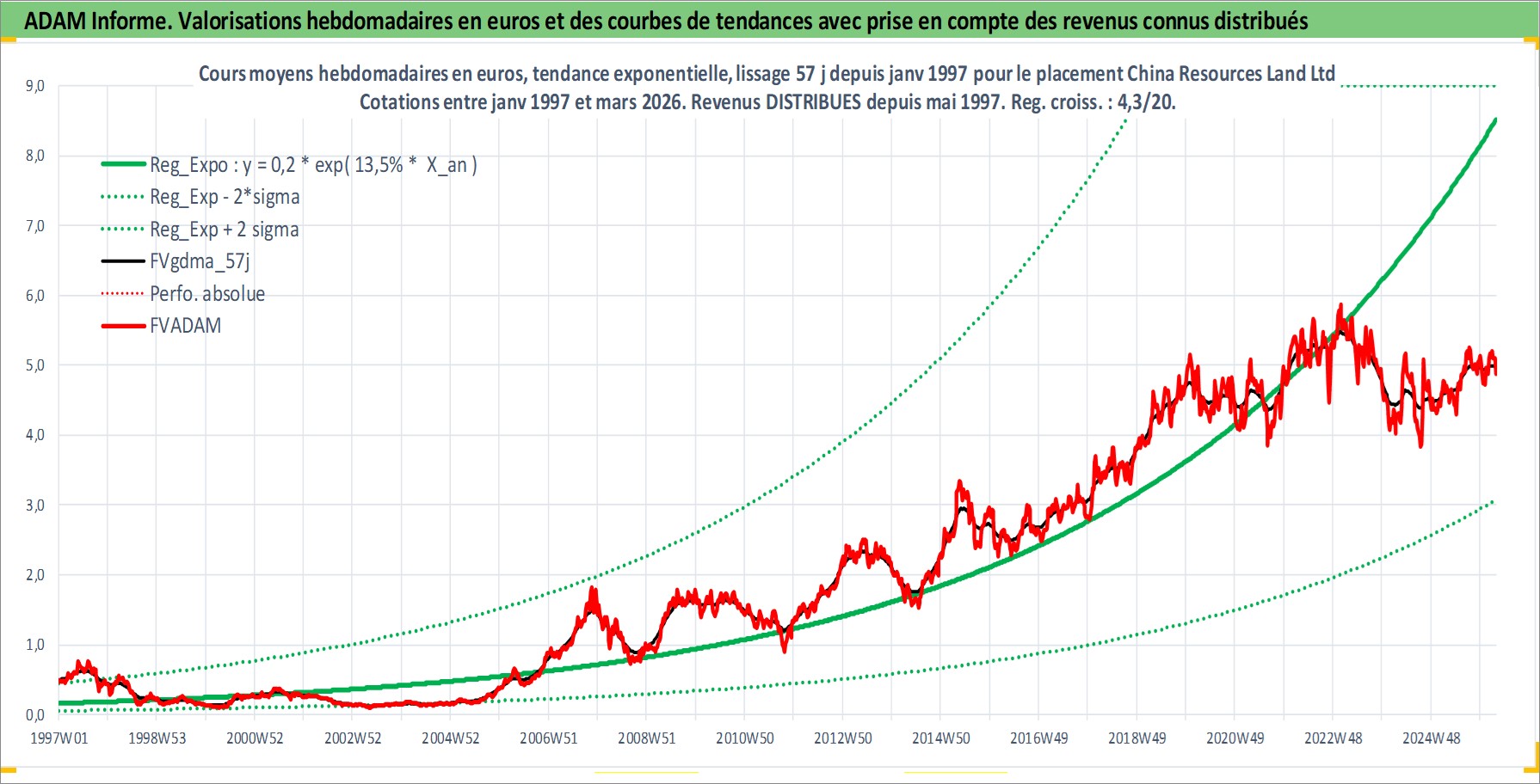 Site dédié aux investisseursPage dédiée sur site financeAnalyse des valorisations hebdomadaires de l'action China Resources Land Ltd. Cet actif est cote en HKD. Les valorisations sont en contrevaleur EURO et couvrent les semaines 1997W01 a 2026W13. Les revenus de cet actif financier sont pris en compte depuis la semaine 1997W21. La note globale ESG de cet actif est estimee a 10.0 (apres rebasage entre 0 et 20).