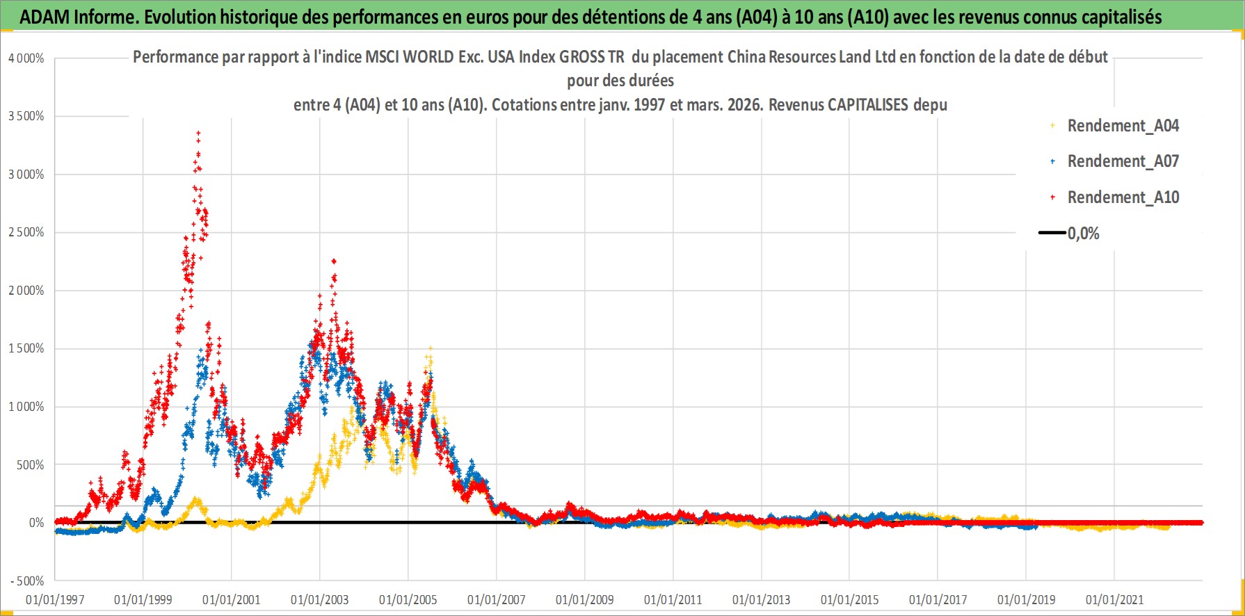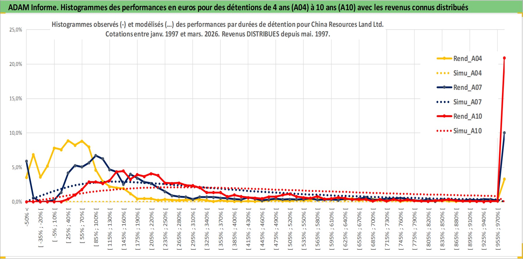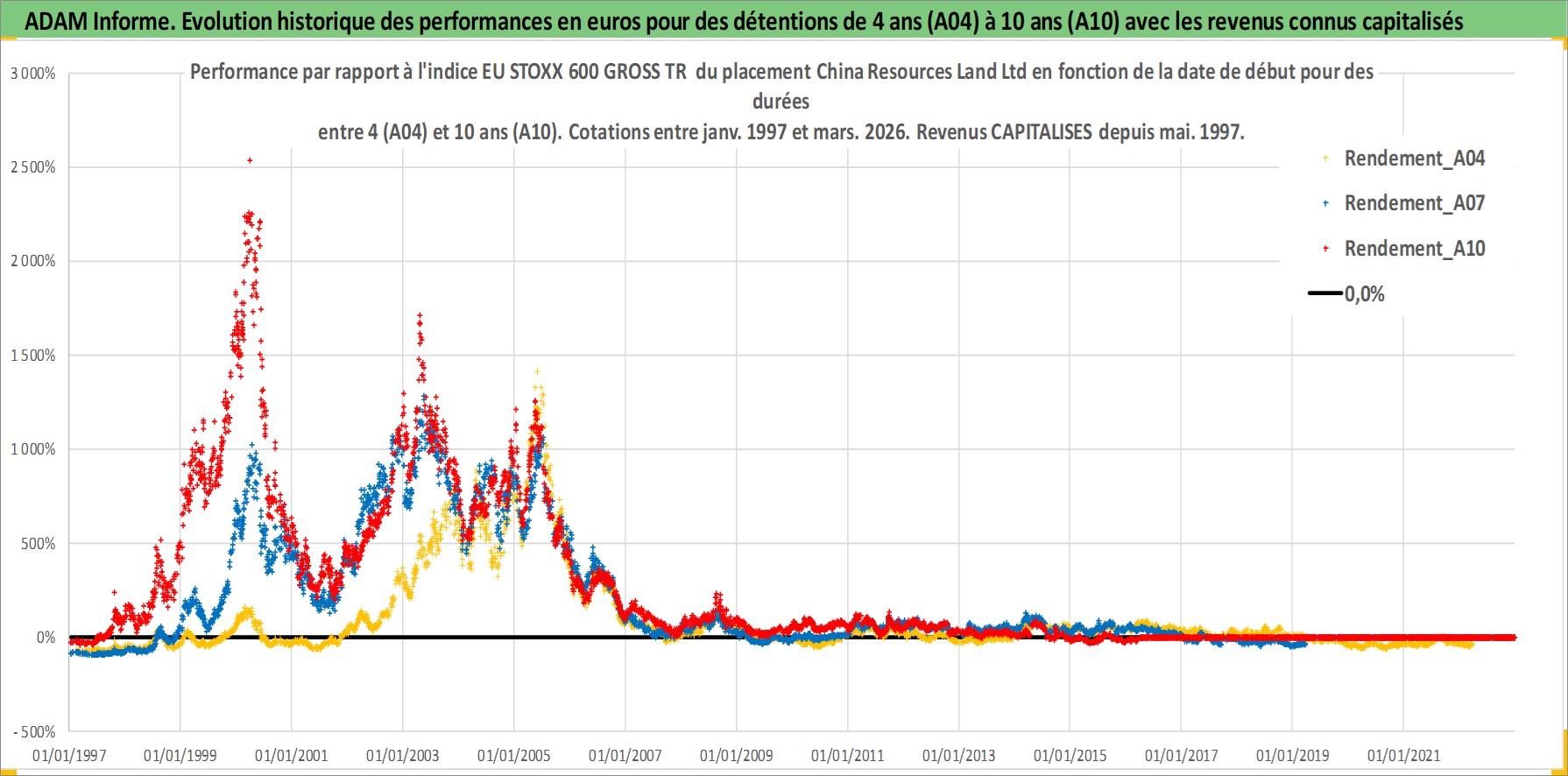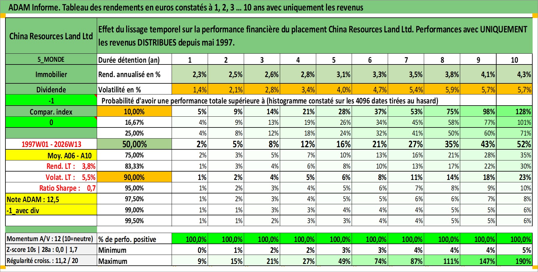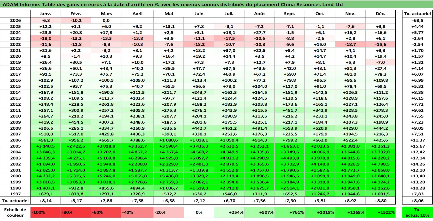 Site dédié aux investisseursPage dédiée sur site financeAnalyse des valorisations hebdomadaires de l'action China Resources Land Ltd. Cet actif est cote en HKD. Les valorisations sont en contrevaleur EURO et couvrent les semaines 1997W01 a 2026W13. Les revenus de cet actif financier sont pris en compte depuis la semaine 1997W21. La note globale ESG de cet actif est estimee a 10.0 (apres rebasage entre 0 et 20).