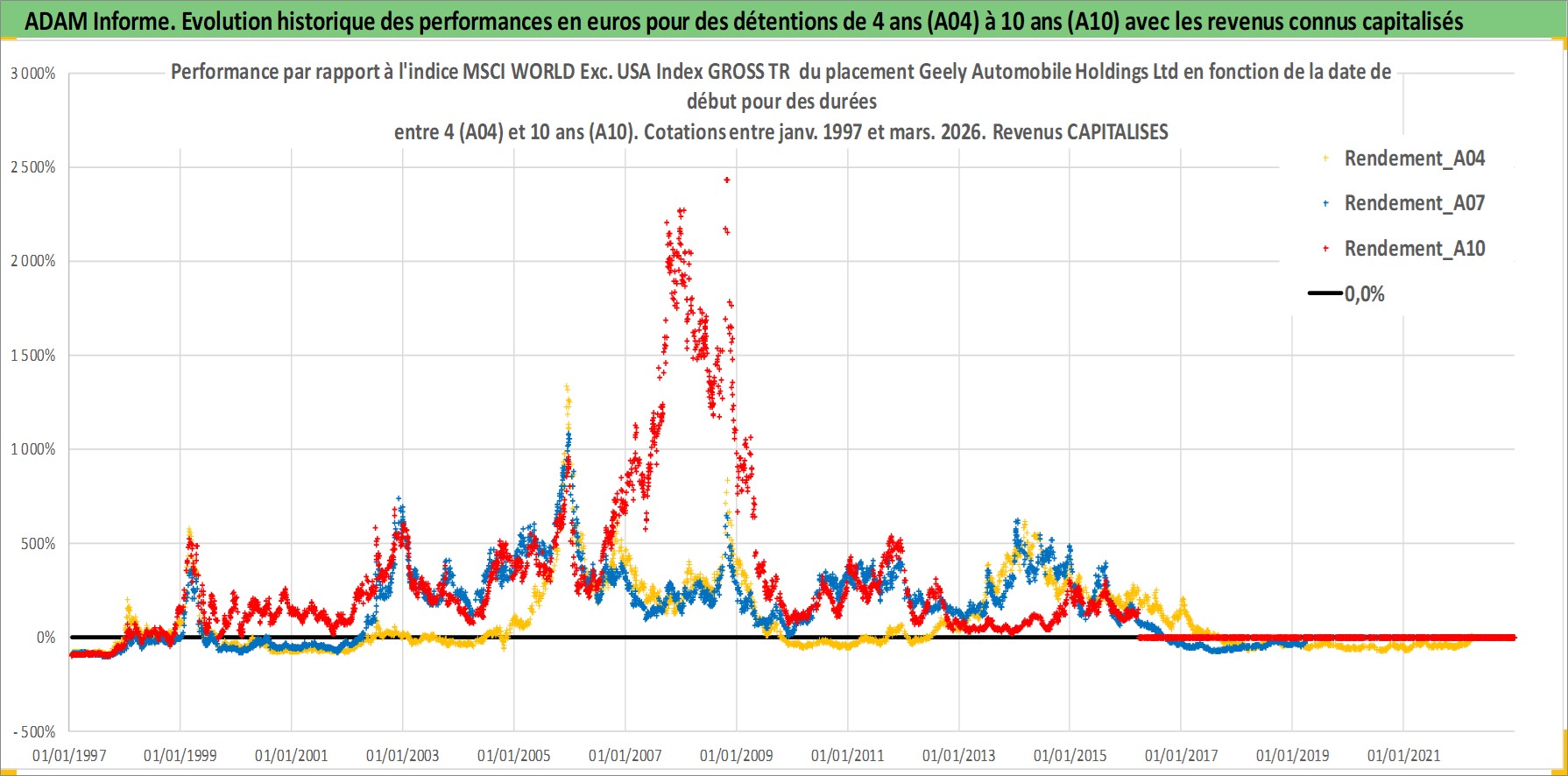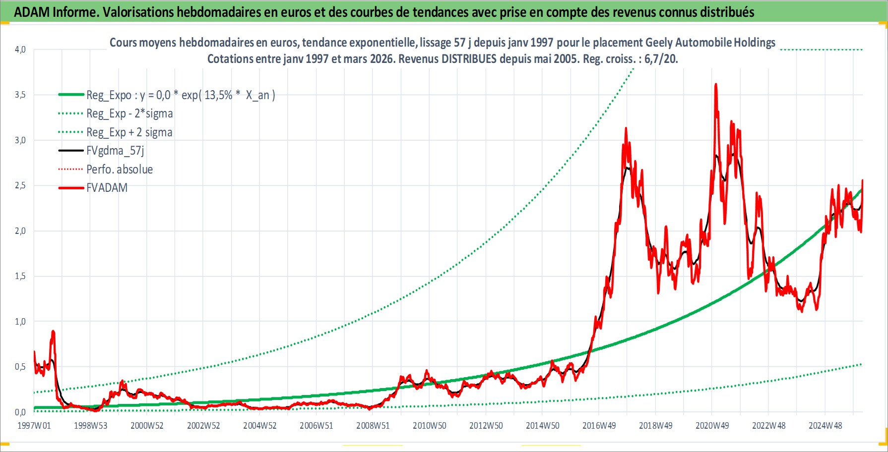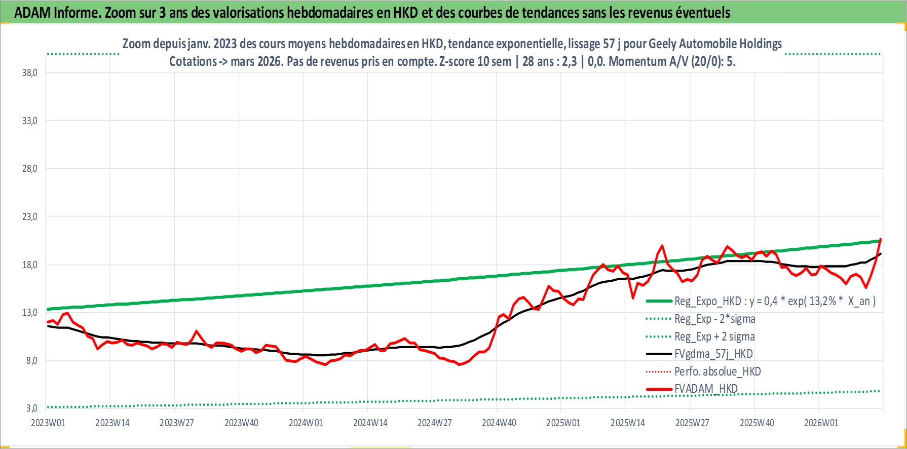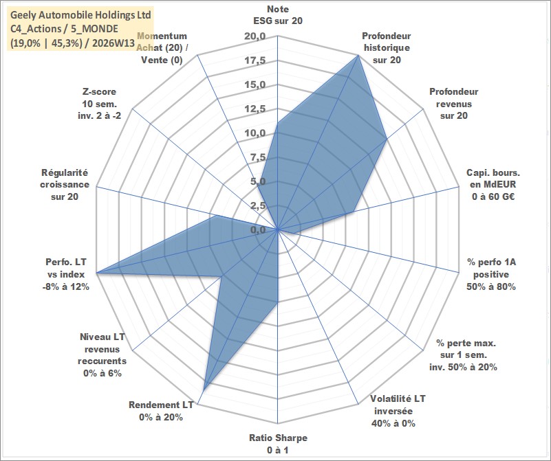 Site dédié aux investisseursPage dédiée sur site financeAnalyse des valorisations hebdomadaires de l'action Geely Automobile Holdings Ltd. Cet actif est cote en HKD. Les valorisations sont en contrevaleur EURO et couvrent les semaines 1997W01 a 2026W13. Les revenus de cet actif financier sont pris en compte depuis la semaine 2005W20. La note globale ESG de cet actif est estimee a 11.0 (apres rebasage entre 0 et 20).