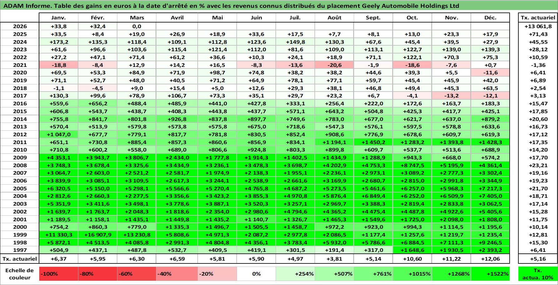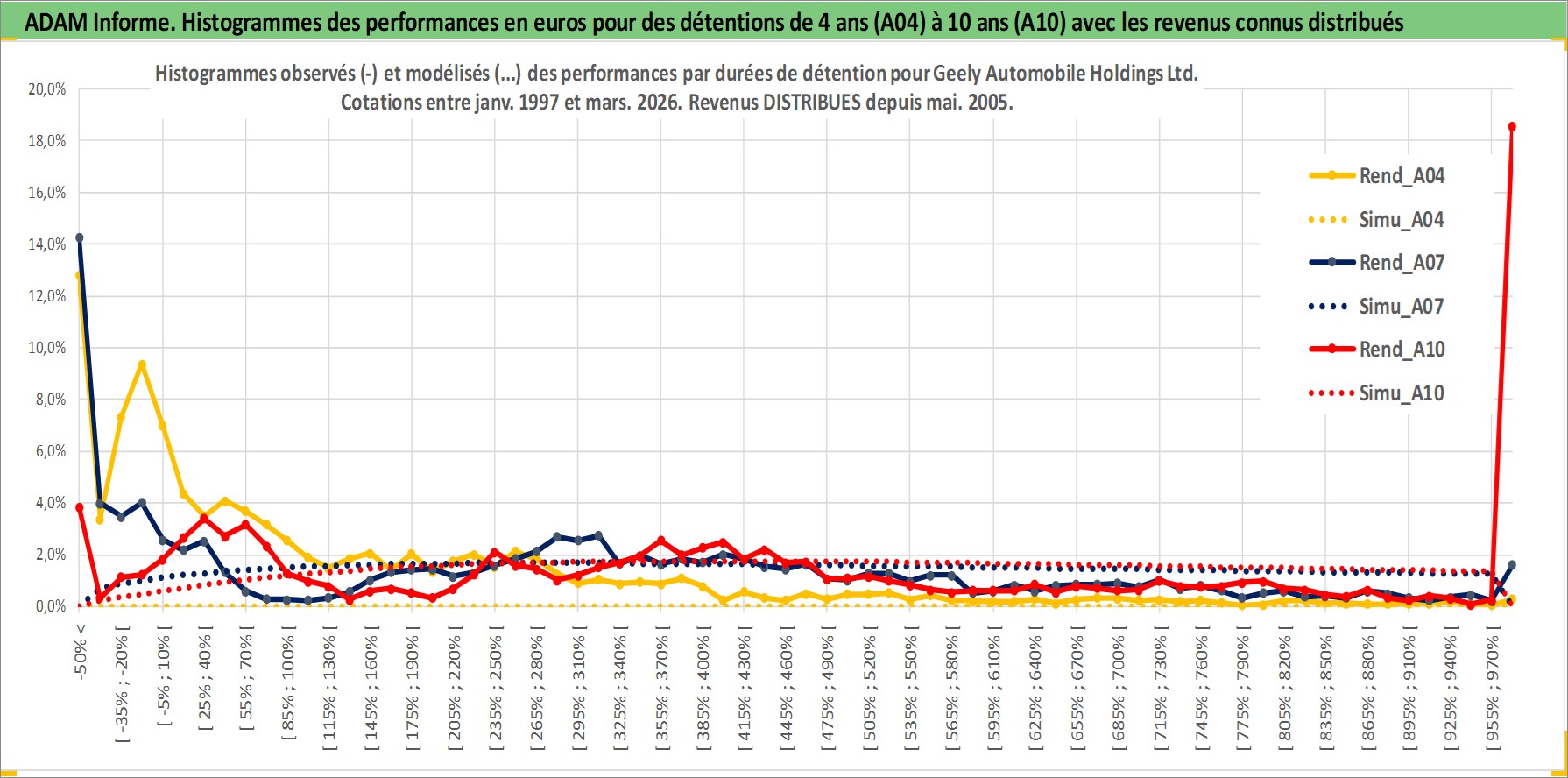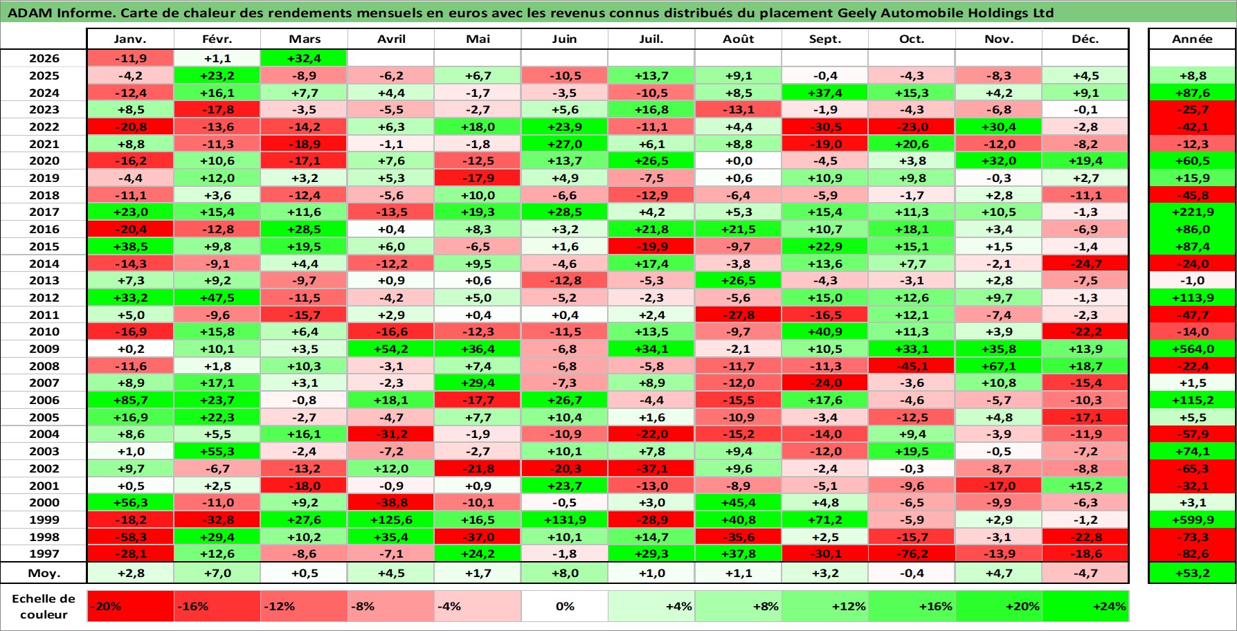 Site dédié aux investisseursPage dédiée sur site financeAnalyse des valorisations hebdomadaires de l'action Geely Automobile Holdings Ltd. Cet actif est cote en HKD. Les valorisations sont en contrevaleur EURO et couvrent les semaines 1997W01 a 2026W13. Les revenus de cet actif financier sont pris en compte depuis la semaine 2005W20. La note globale ESG de cet actif est estimee a 11.0 (apres rebasage entre 0 et 20).