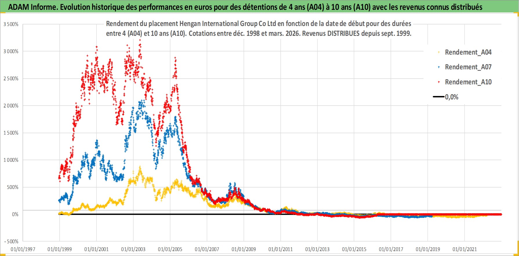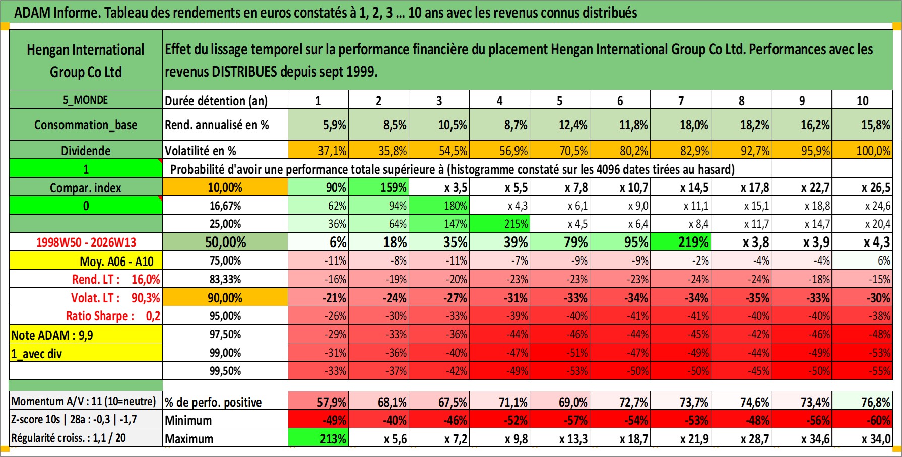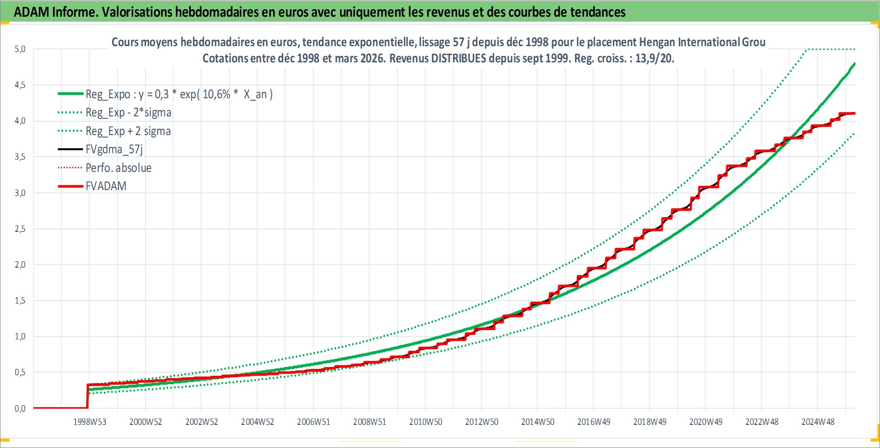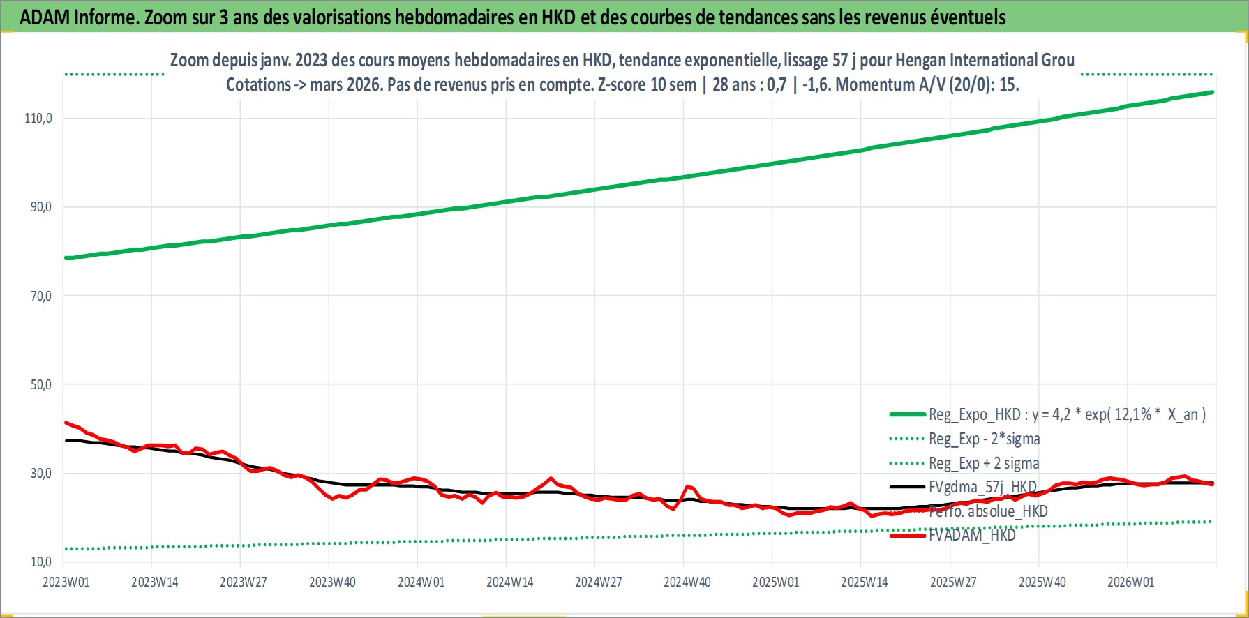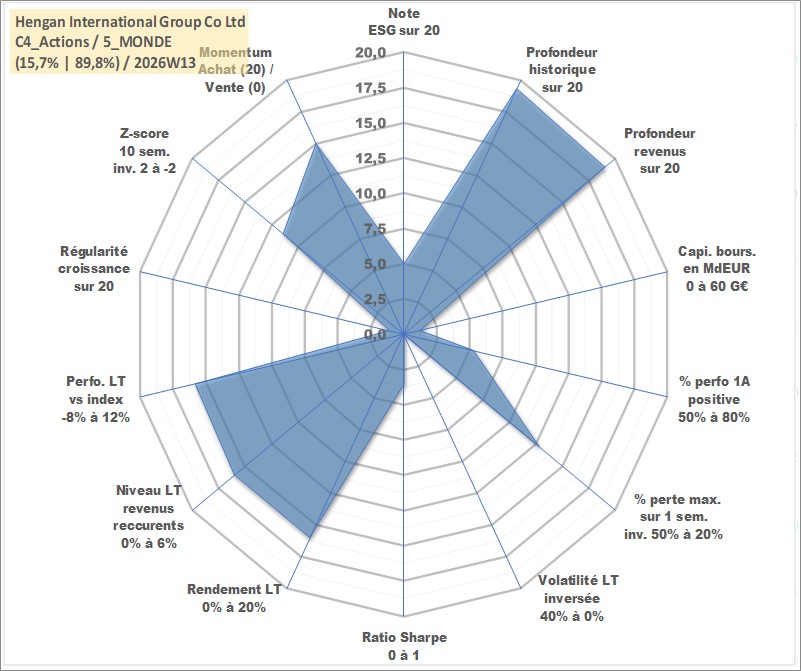 Site dédié aux investisseursPage dédiée sur site financeAnalyse des valorisations hebdomadaires de l'action Hengan International Group Co Ltd. Cet actif est cote en HKD. Les valorisations sont en contrevaleur EURO et couvrent les semaines 1998W50 a 2026W13. Les revenus de cet actif financier sont pris en compte depuis la semaine 1999W37. La note globale ESG de cet actif est estimee a 5.0 (apres rebasage entre 0 et 20).
