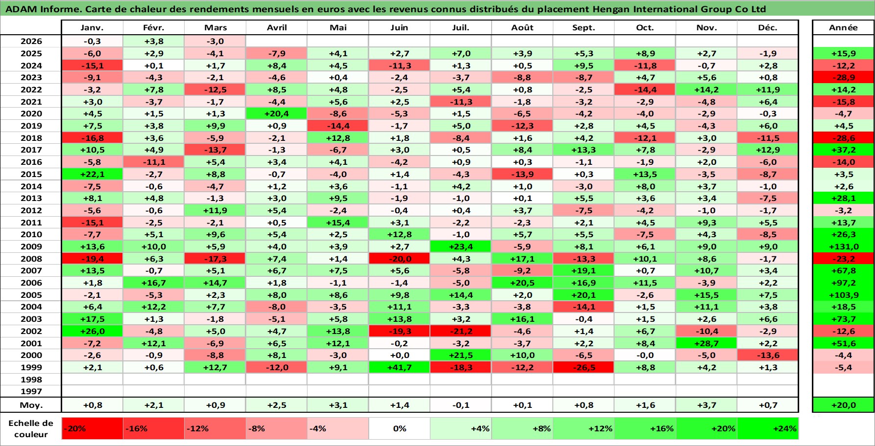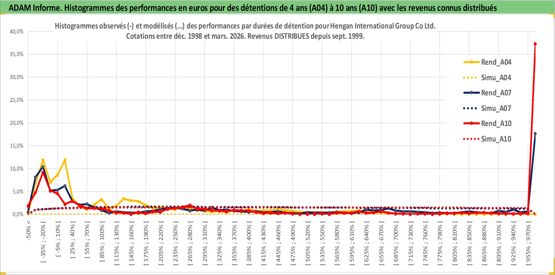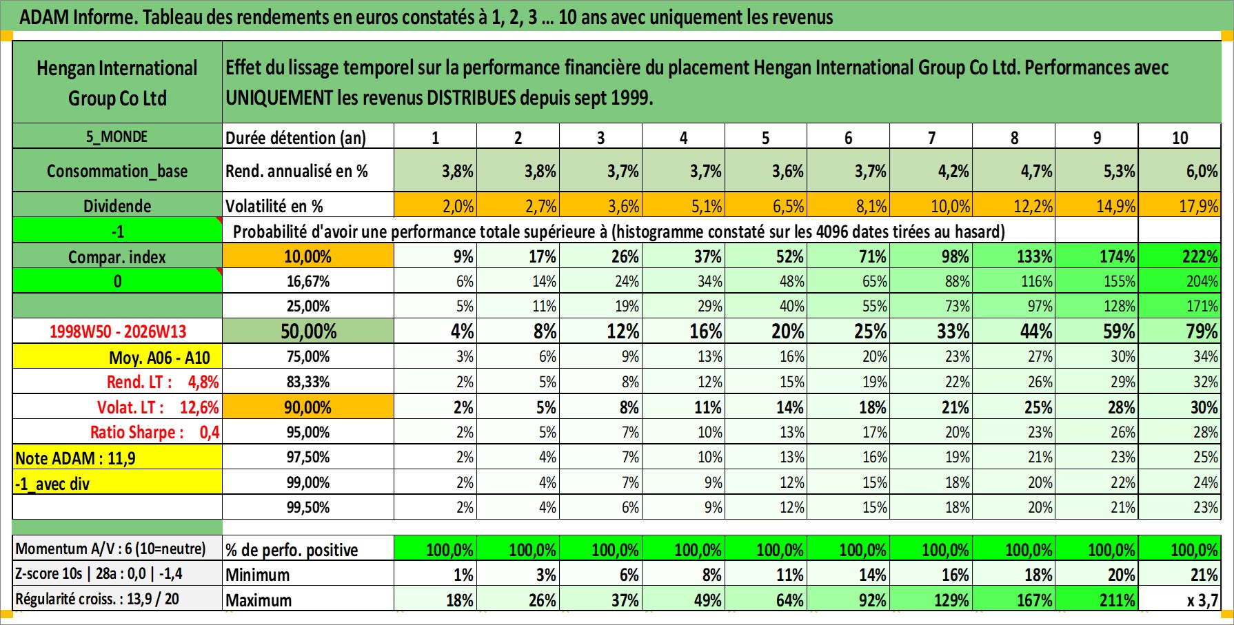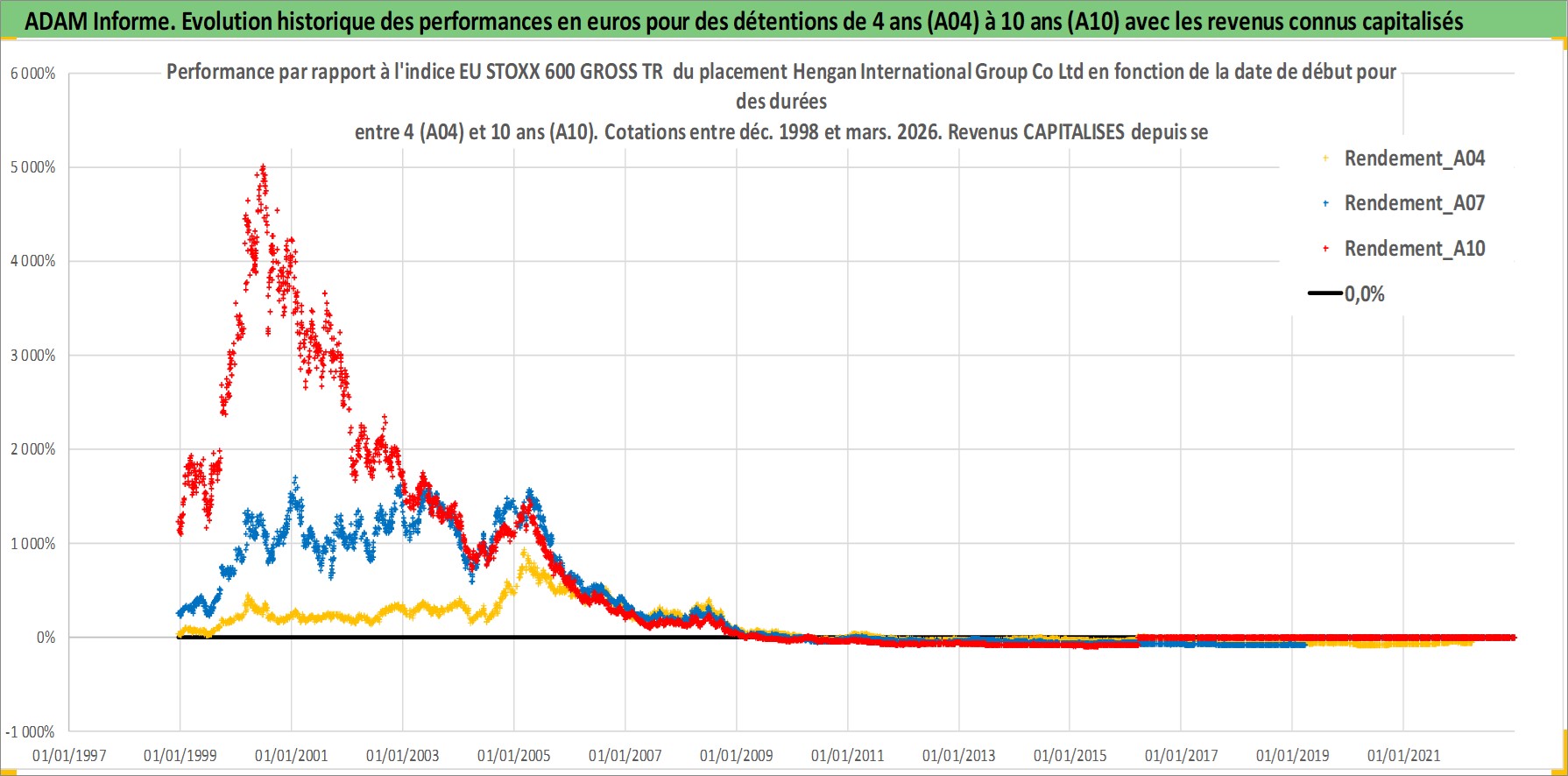 Site dédié aux investisseursPage dédiée sur site financeAnalyse des valorisations hebdomadaires de l'action Hengan International Group Co Ltd. Cet actif est cote en HKD. Les valorisations sont en contrevaleur EURO et couvrent les semaines 1998W50 a 2026W13. Les revenus de cet actif financier sont pris en compte depuis la semaine 1999W37. La note globale ESG de cet actif est estimee a 5.0 (apres rebasage entre 0 et 20).