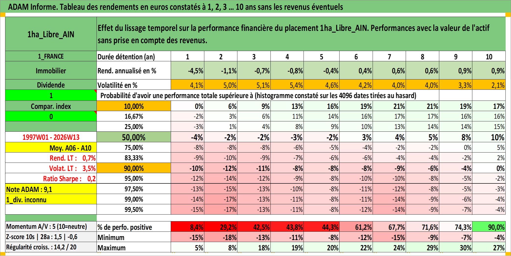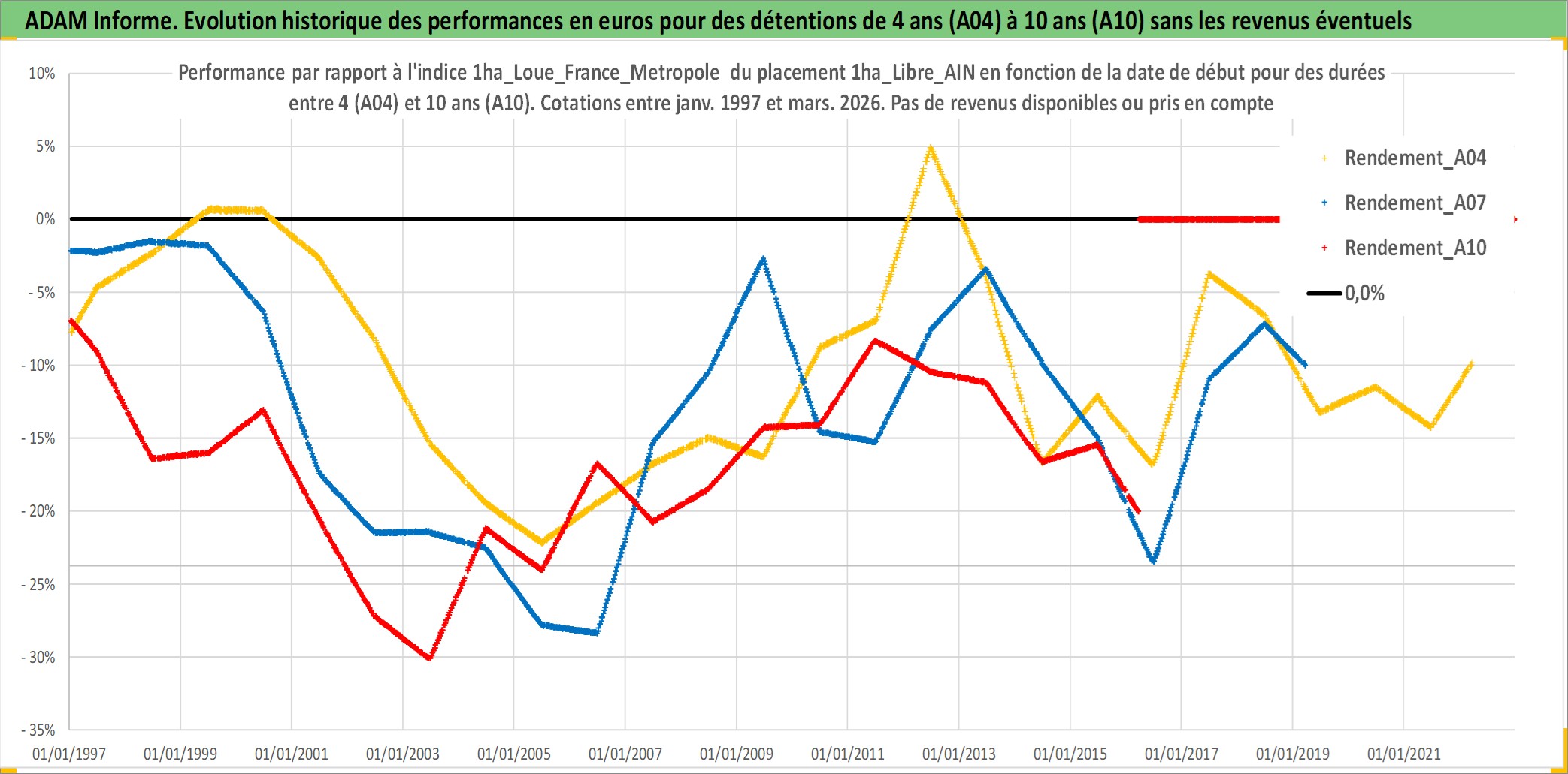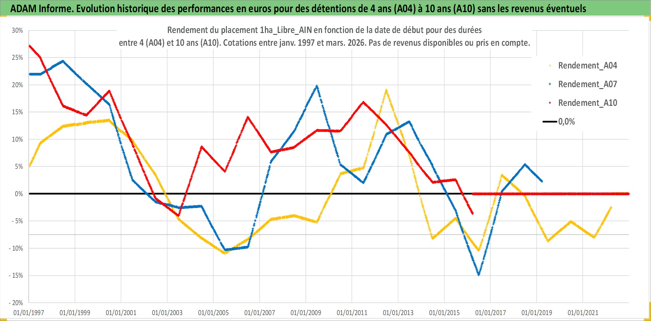 Site dédié aux investisseursPage dédiée sur site financeAnalyse des valorisations hebdomadaires de l'actif 1ha_Libre_AIN. Cet actif est cote en EUR. Les valorisations couvrent les semaines 1997W01 a 2026W13. Les fermages de ce bien foncier sont pris egaux a 2,5% annuels de la valeur venale du bien.