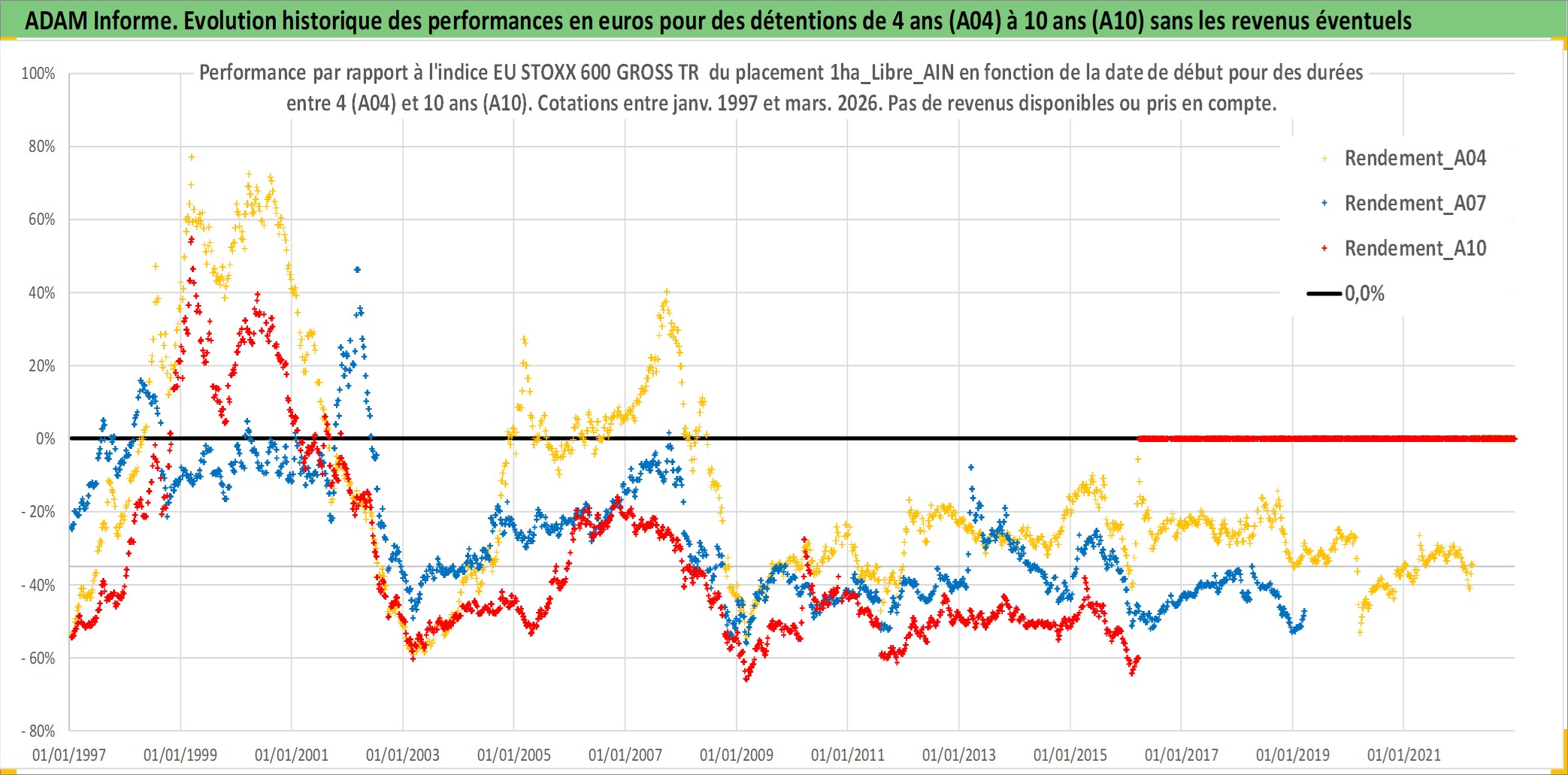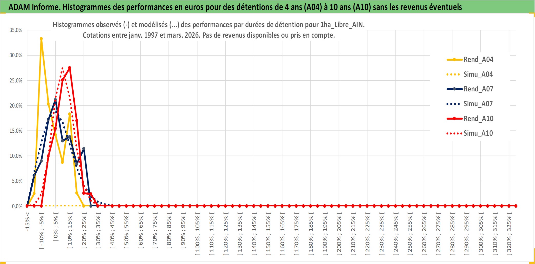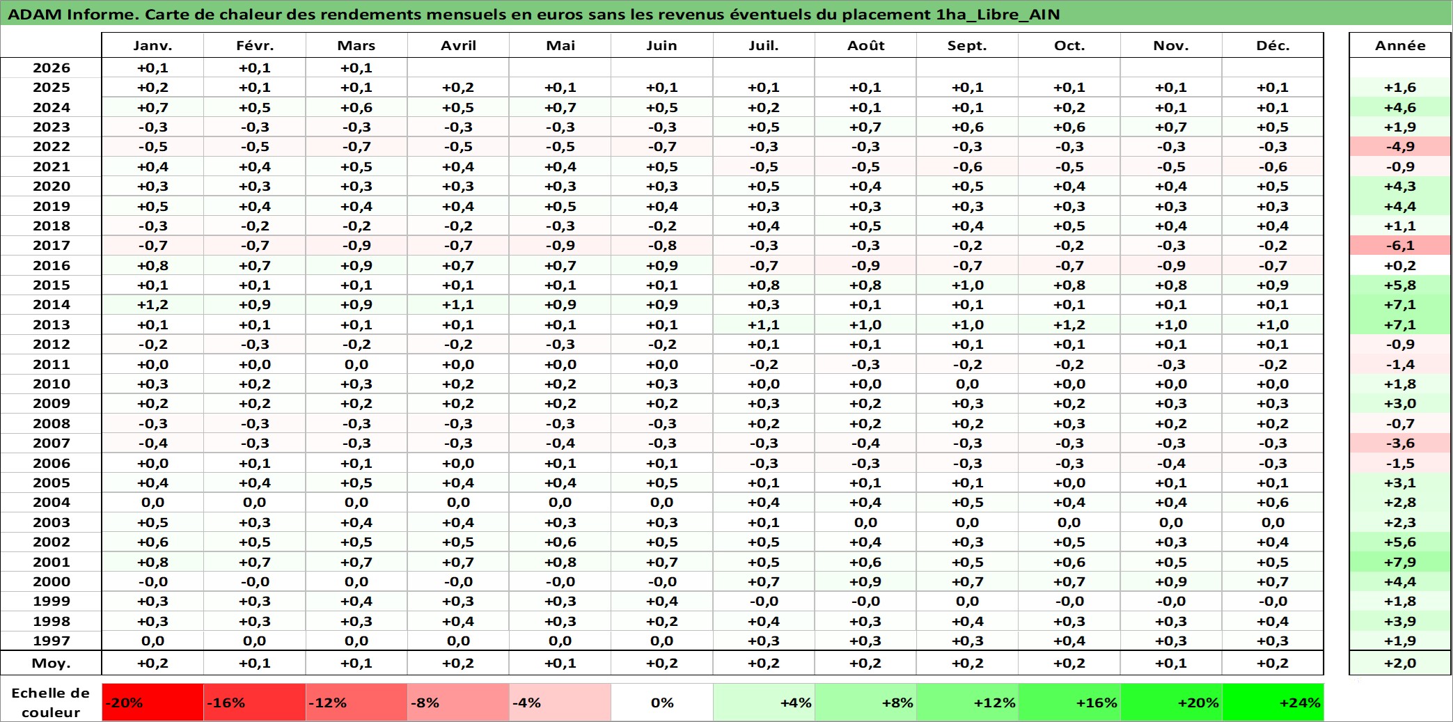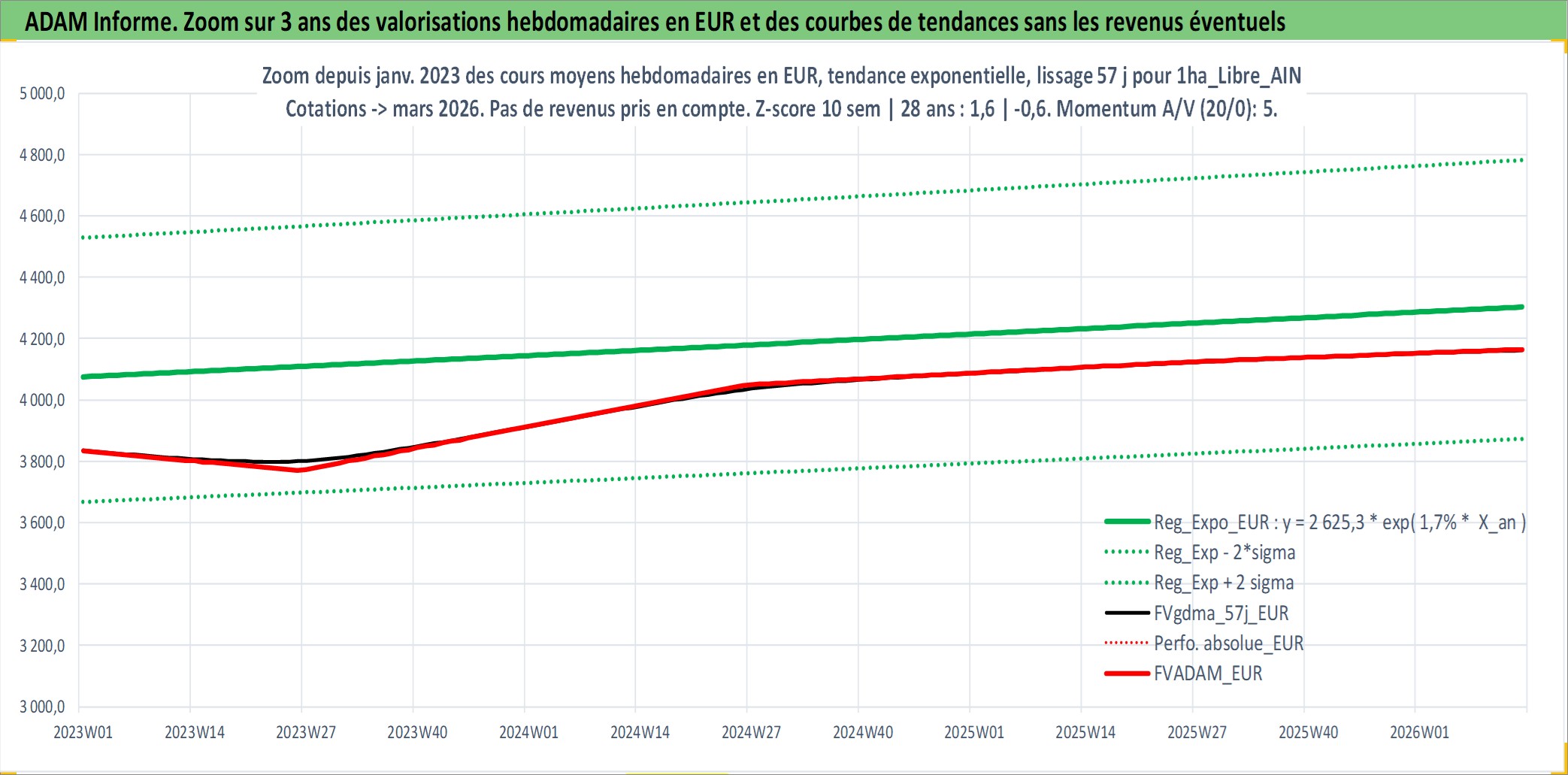 Site dédié aux investisseursPage dédiée sur site financeAnalyse des valorisations hebdomadaires de l'actif 1ha_Libre_AIN. Cet actif est cote en EUR. Les valorisations couvrent les semaines 1997W01 a 2026W13. Les fermages de ce bien foncier sont pris egaux a 2,5% annuels de la valeur venale du bien.